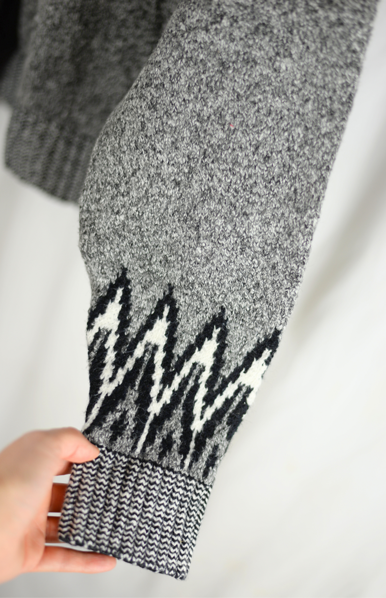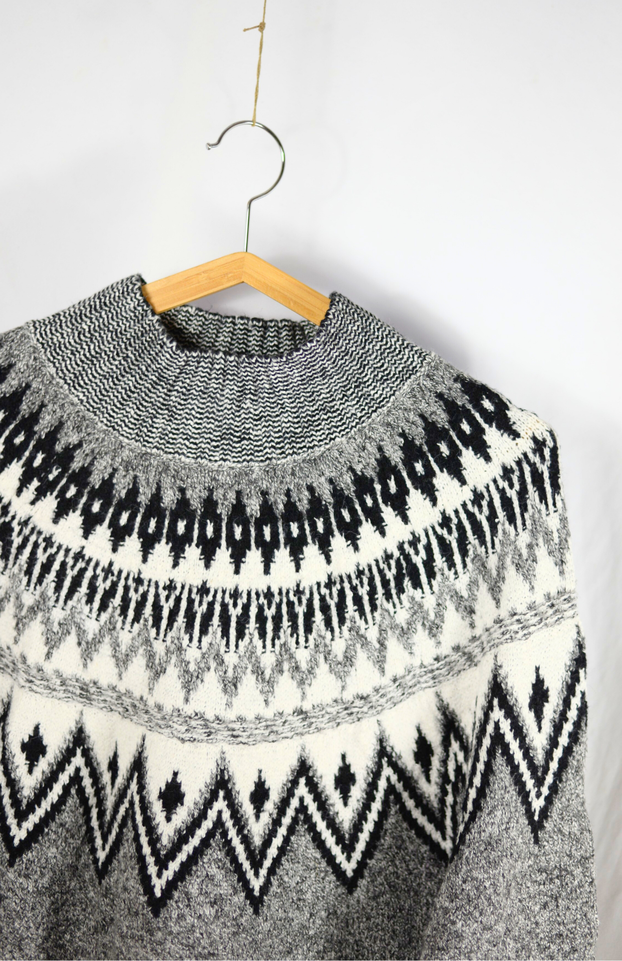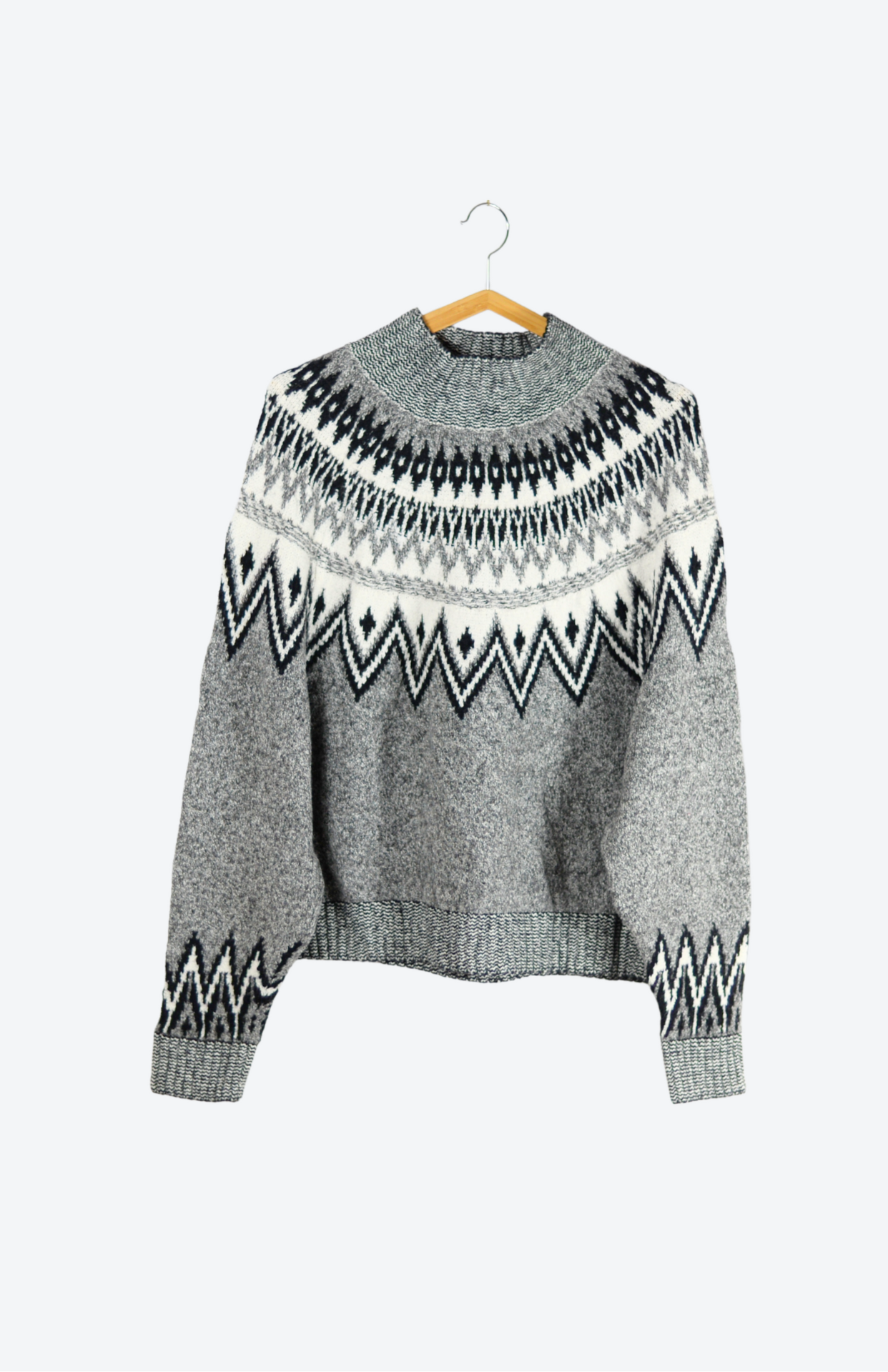 Retro svetr s norským vzorem u krku a na rukávech. Má lehce nabíraný rukáv a silnější úplet.