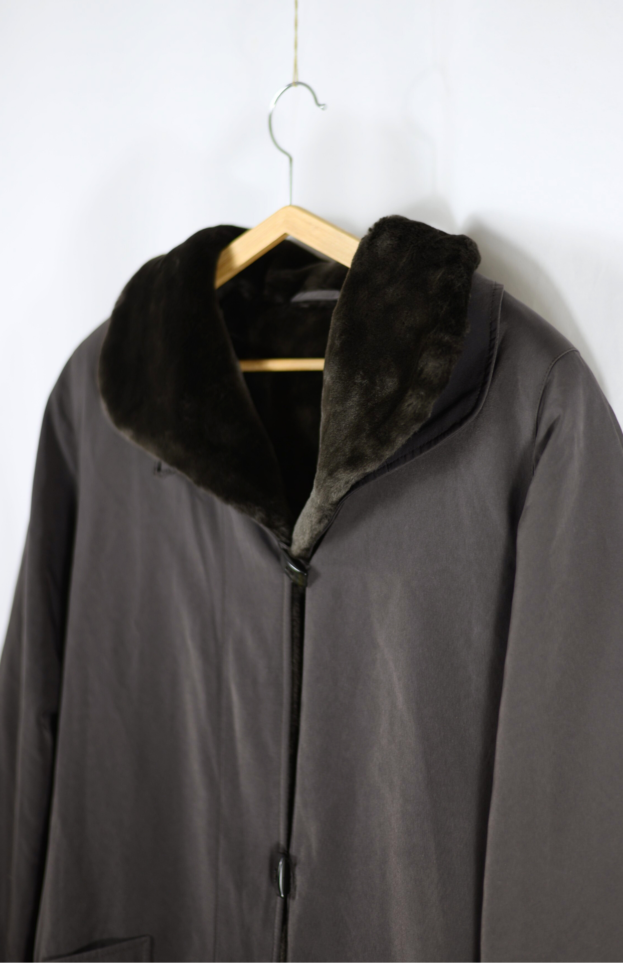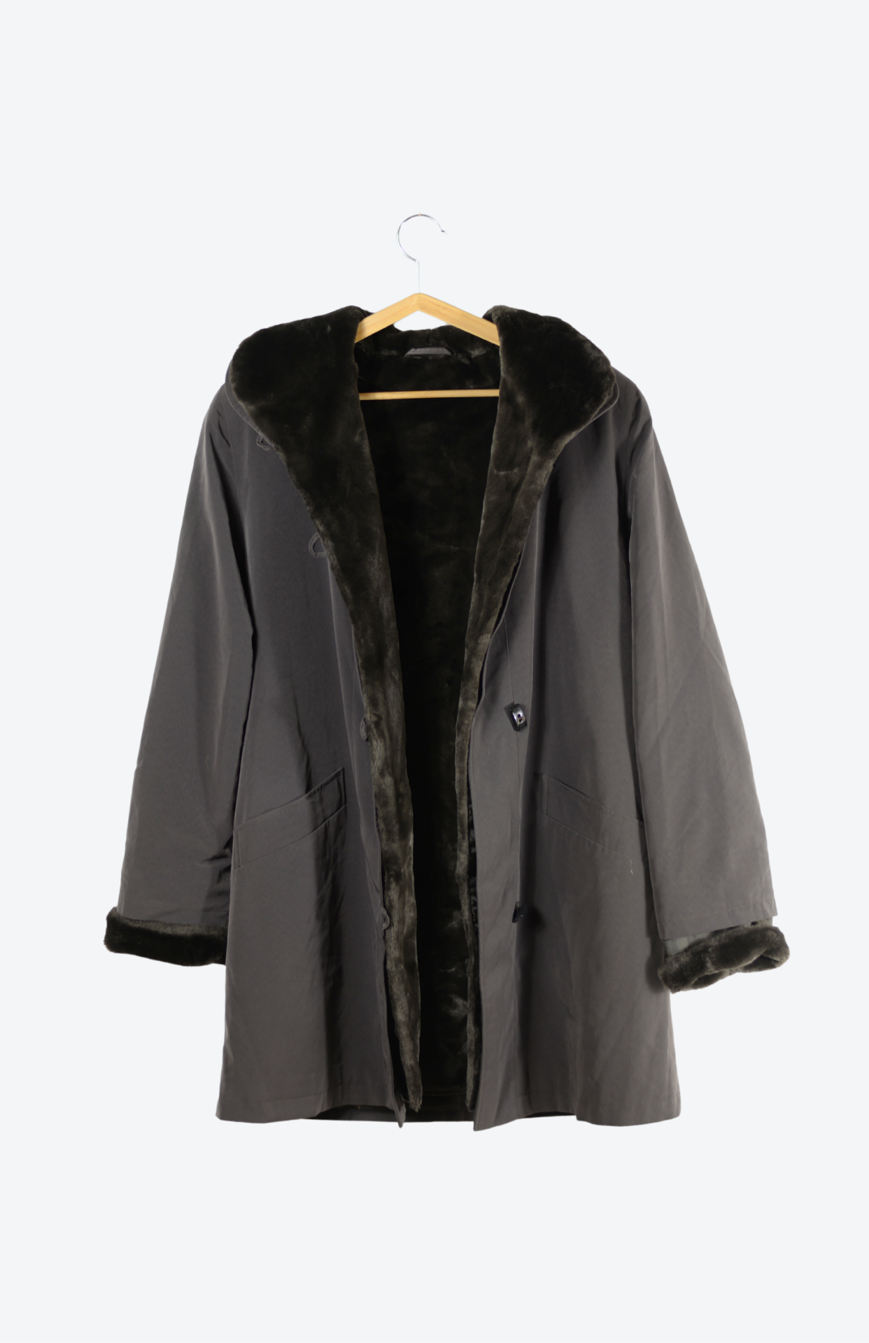 Retro elegantní bunda / kabátek v tmavě hnědé. Má detail i celý vnitřek s tmavým teplým fake fur kožíškem, průvlek na knoflíky a kapsy po stranách.