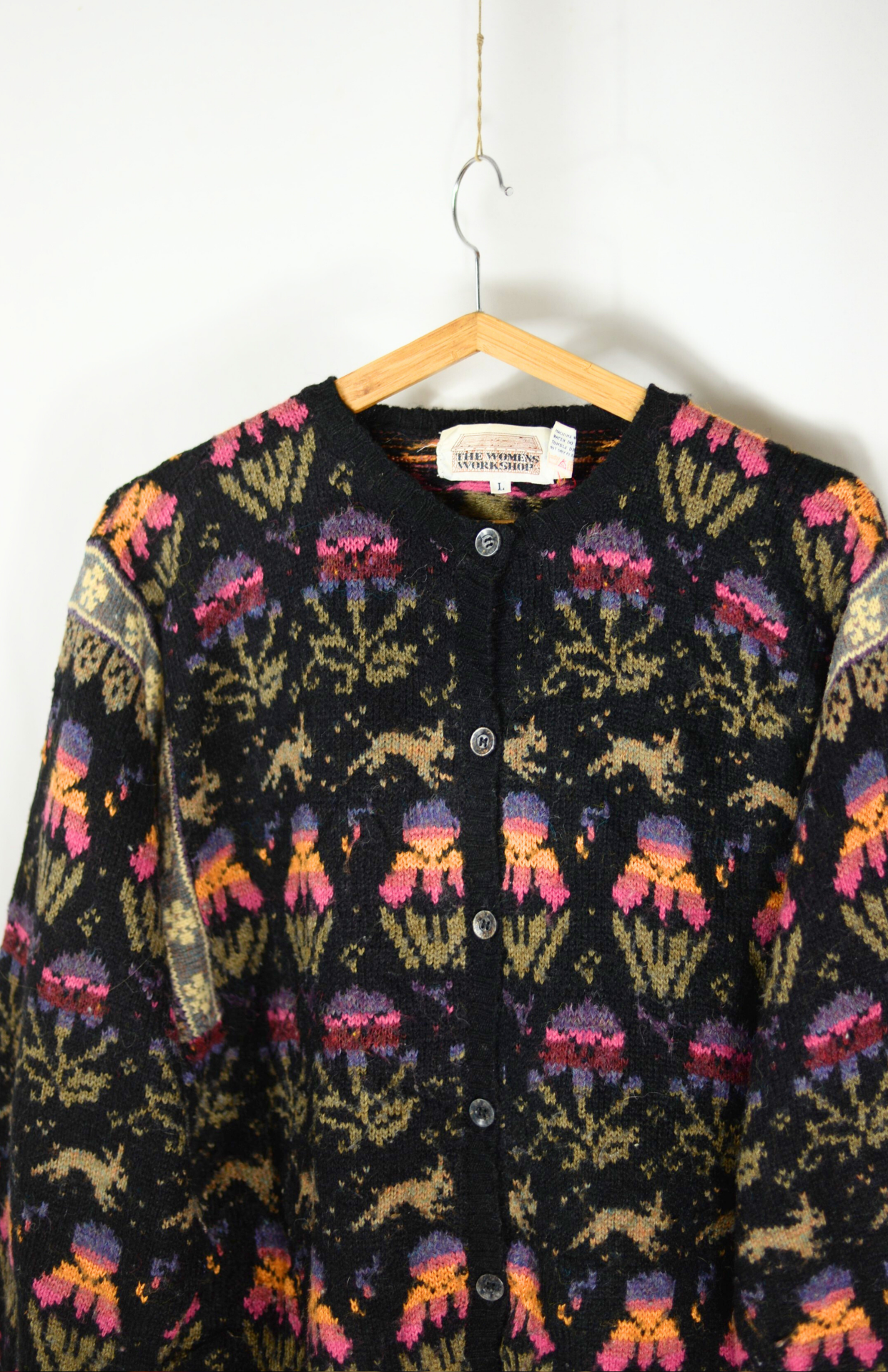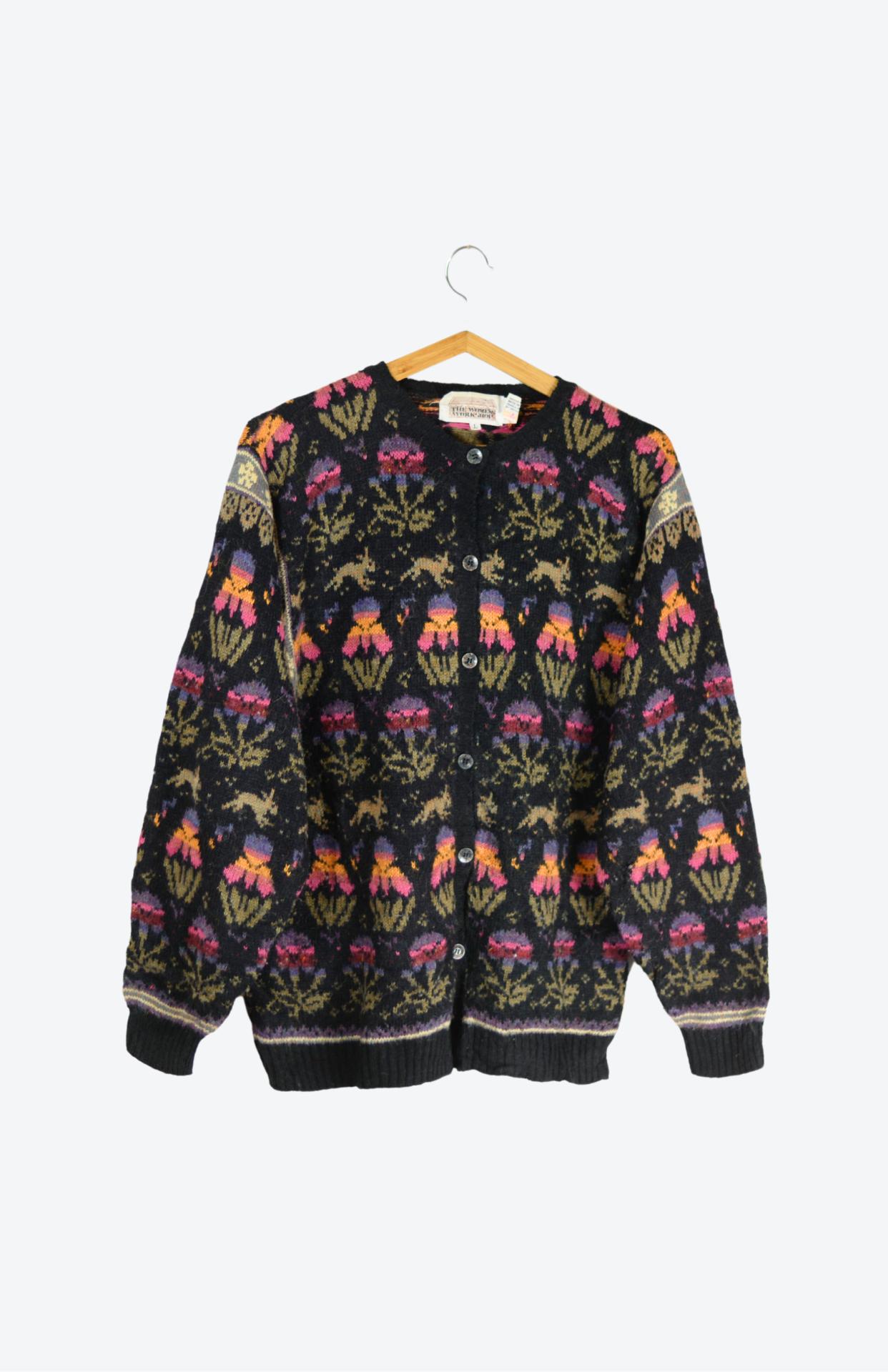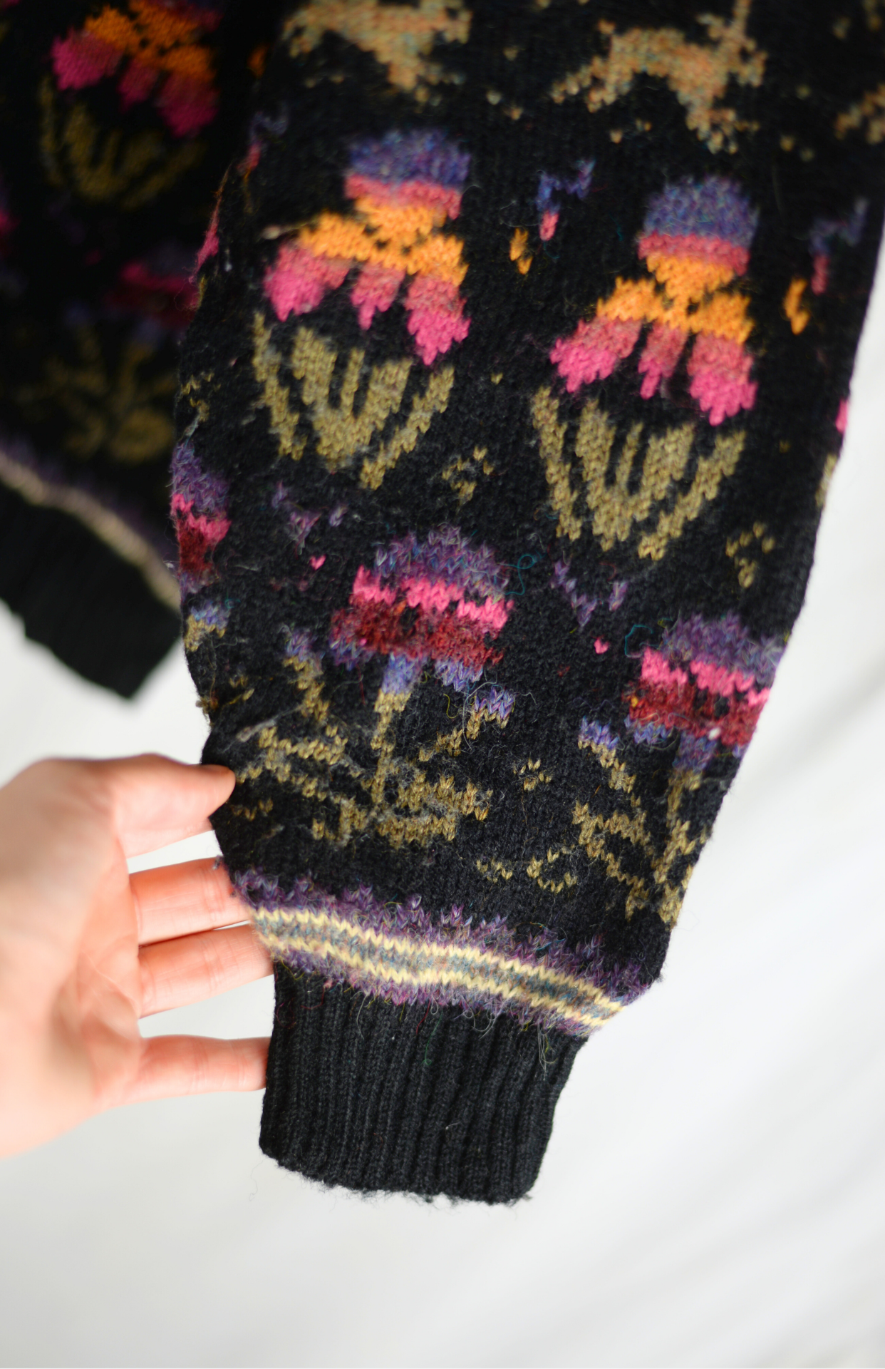 Retro svetr s barevným květinovým vzorem a skákajícími králíky. Propímací na středu na drobné černé knoflíky.  Středně silný úplet a lehce nabíraný rukáv.