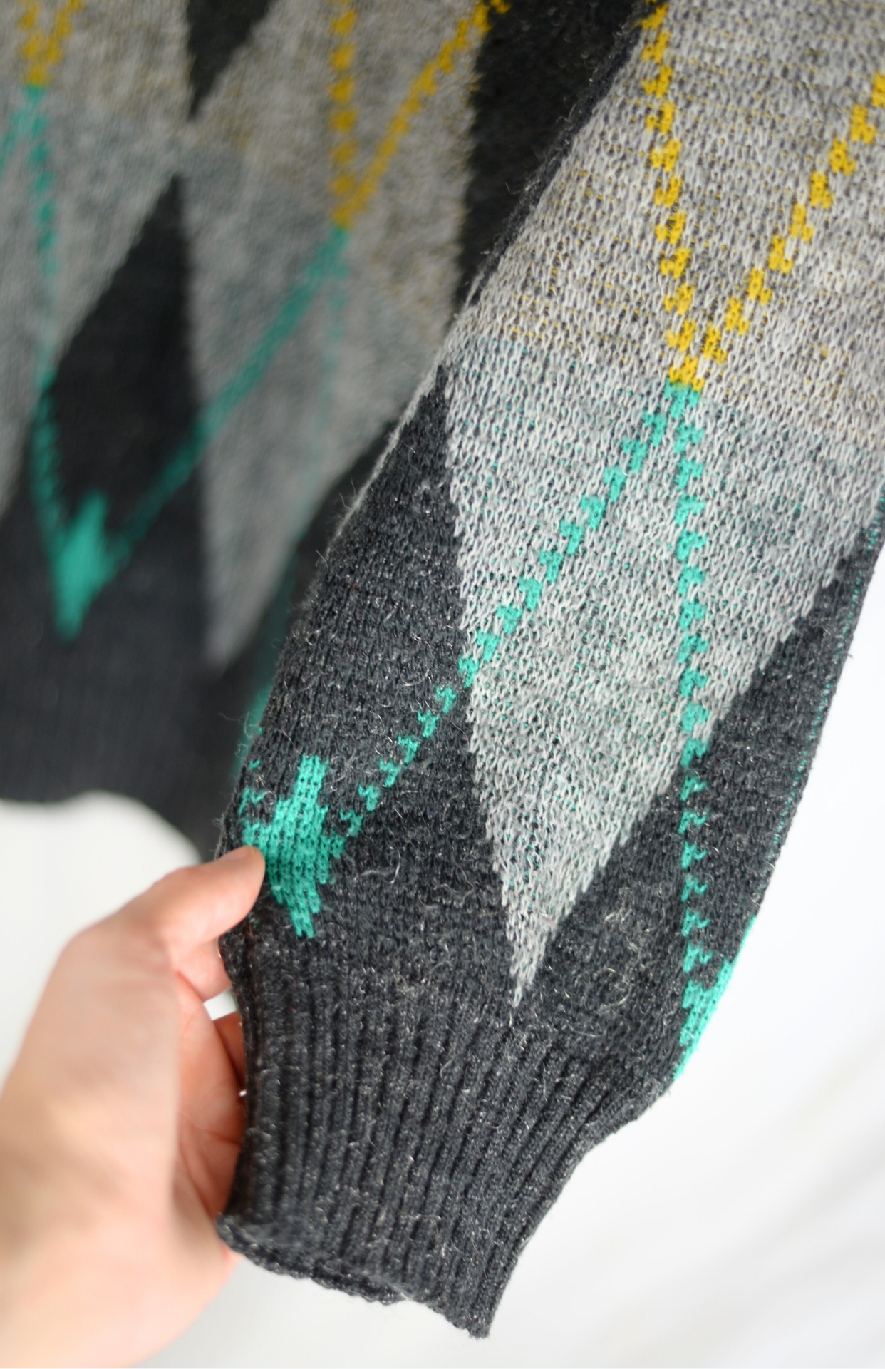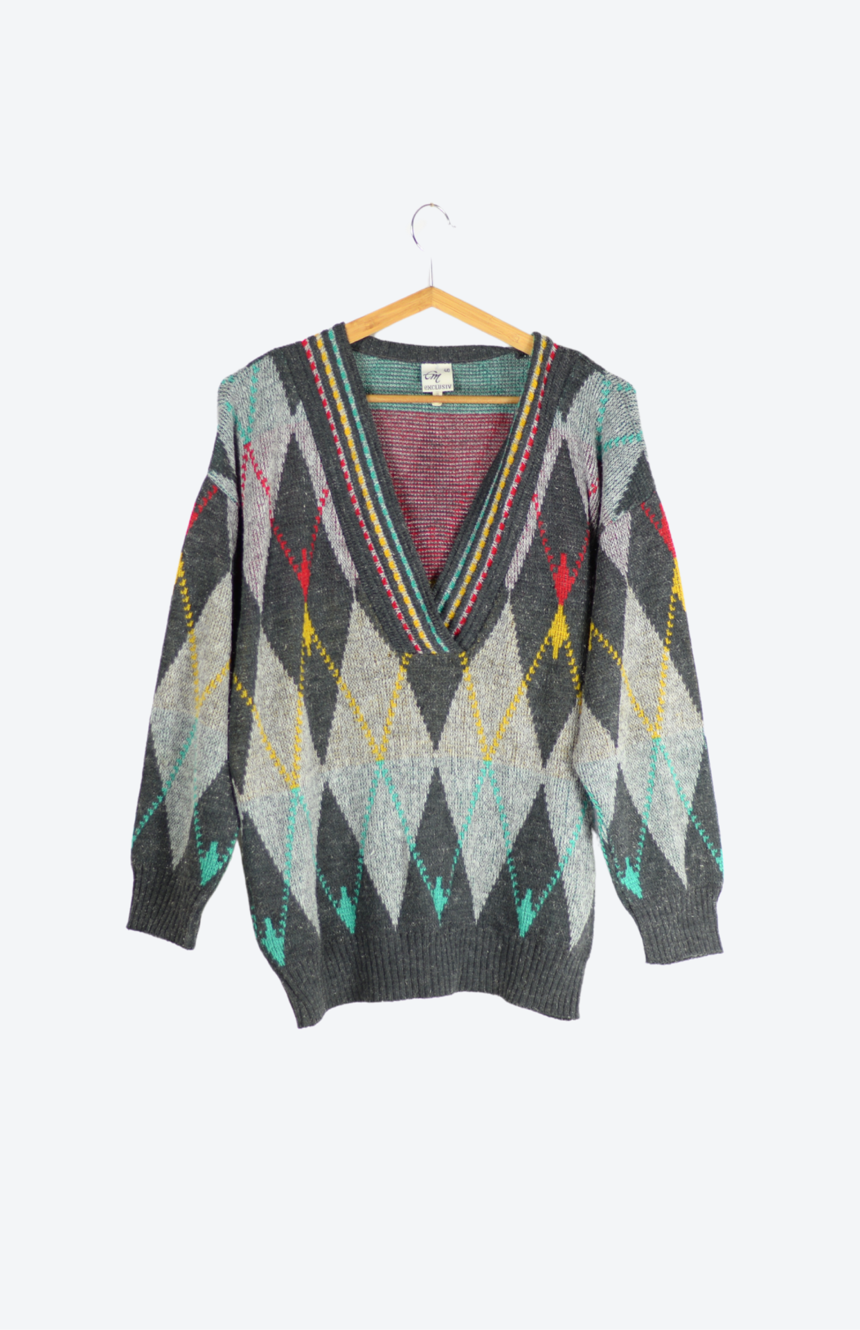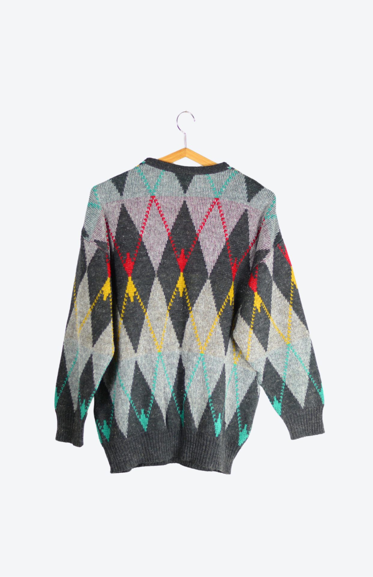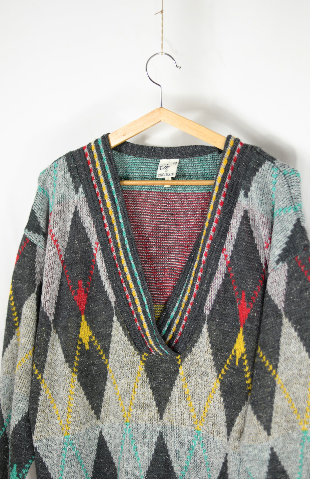 Vintage svetr s károvým vzorem a barevnými detaily. Má hlubší výstřih s barevnými proužky. Středně silný úplet a lehce nabíraný rukáv.