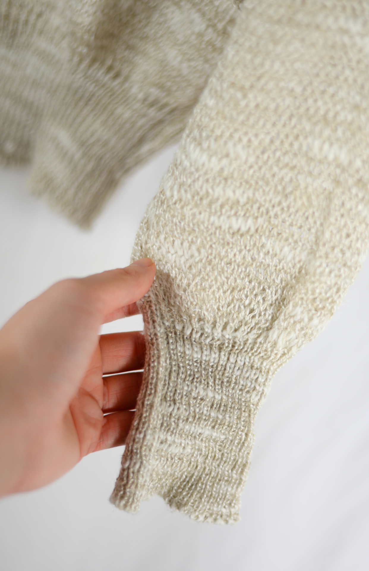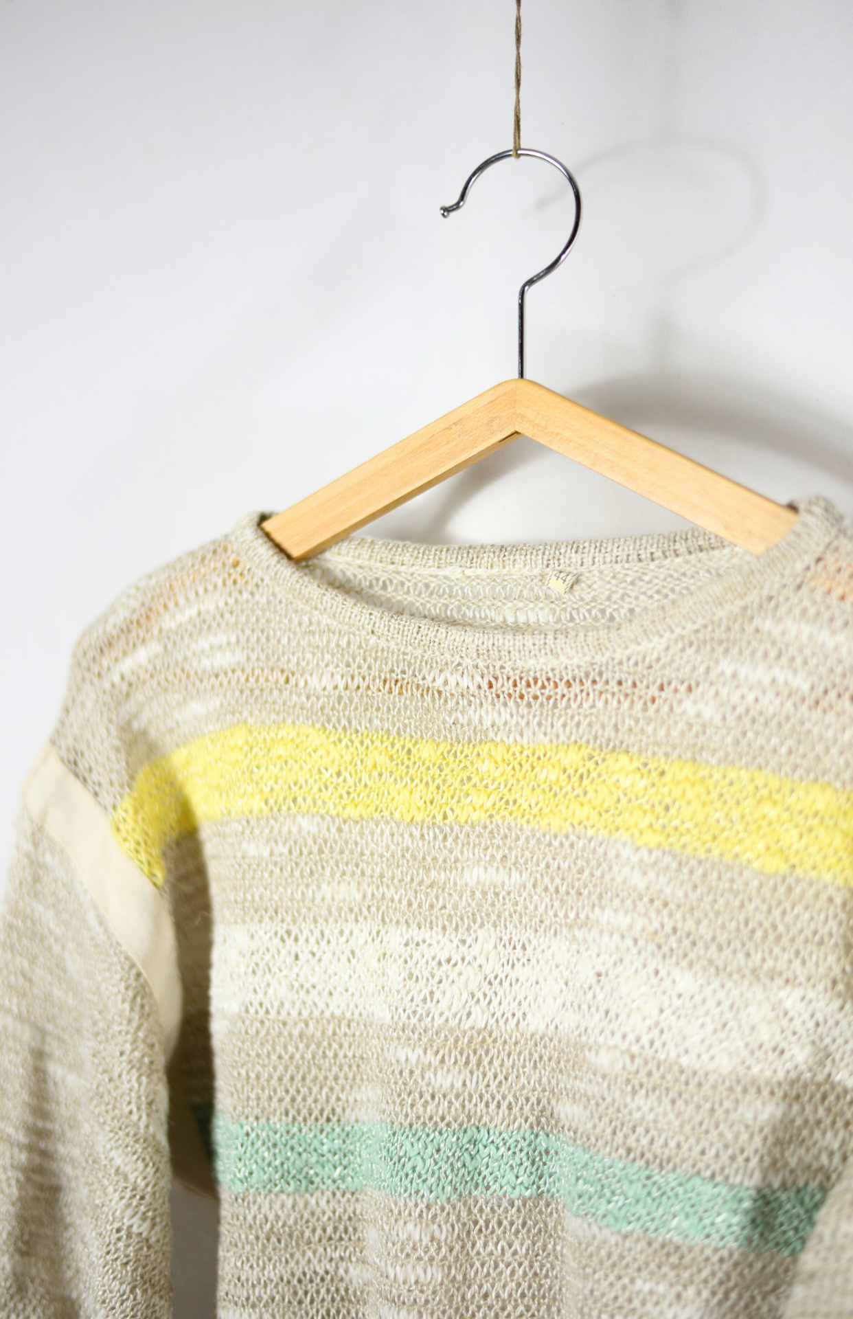 Lehký svetr s pastelovými proužky. Má decentní třpyt a podíl lnu. Nabírané rukávy,Stav: Ve skvělém stavu, bez vad.Materiál: 55% polyakryl, 45% len