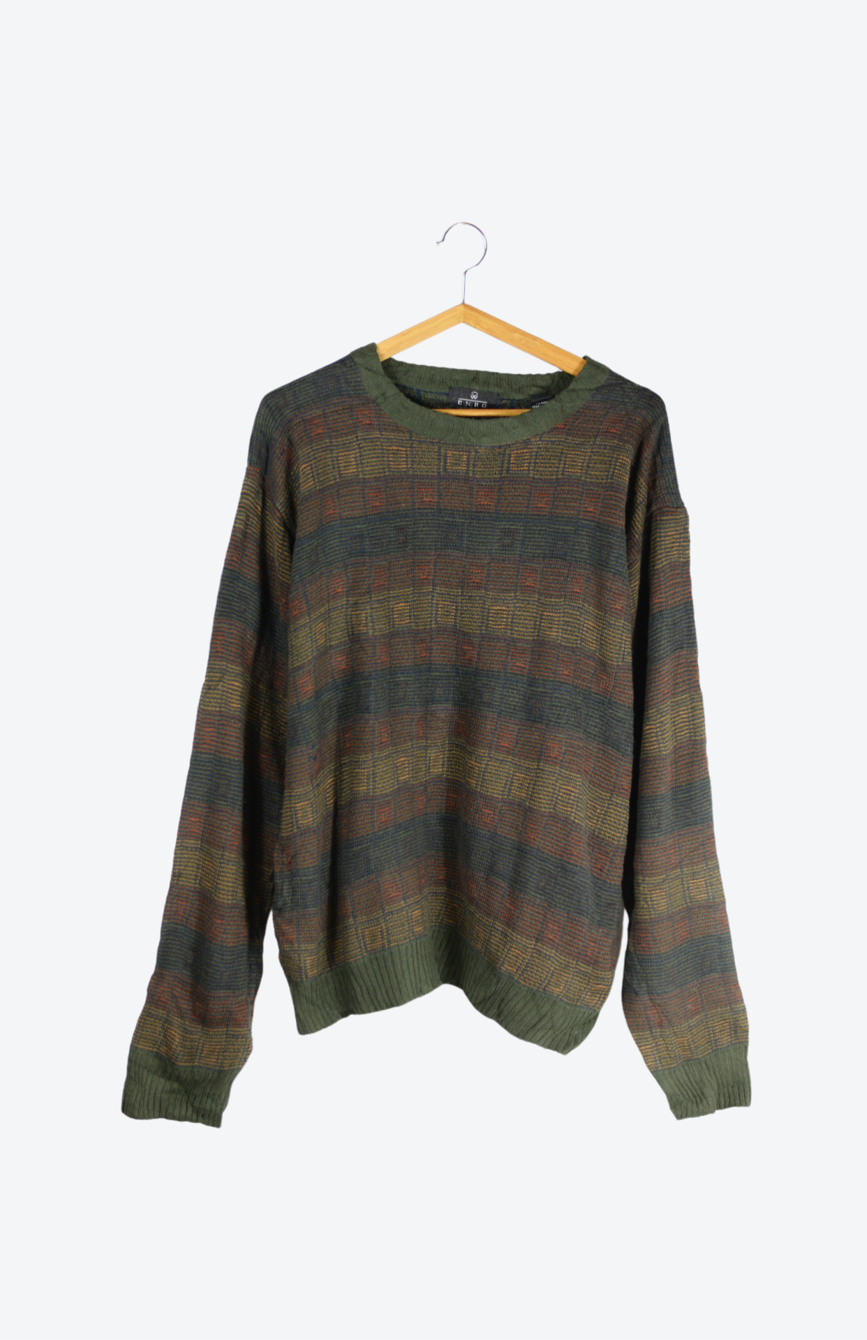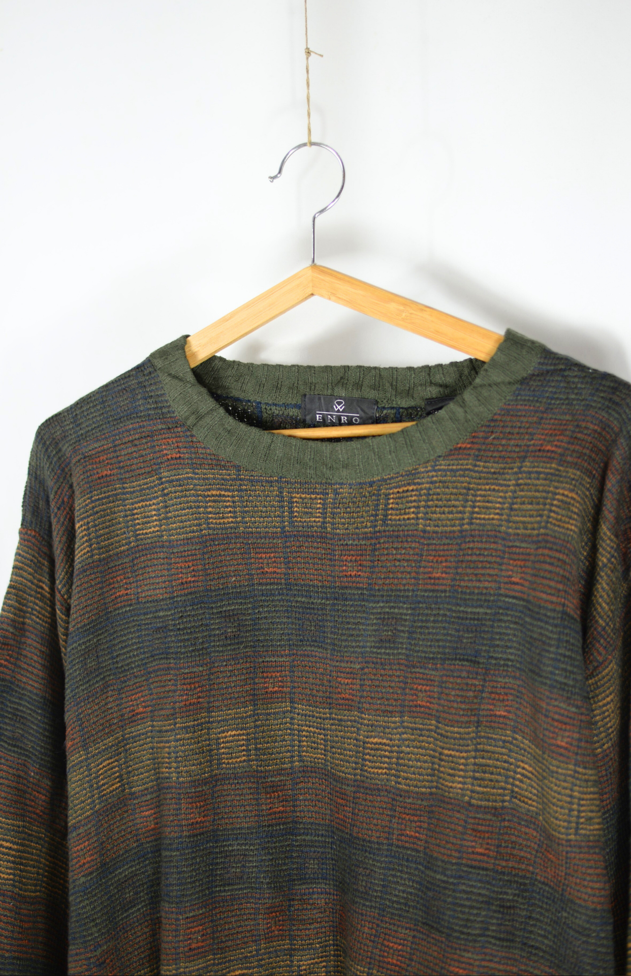 Vintage tmavý svetr s barevnými proužky. Středně silný úplet a volný střih. Pánský / unisex.Stav: Vintage kousek v perfektním stavu, bez vad.