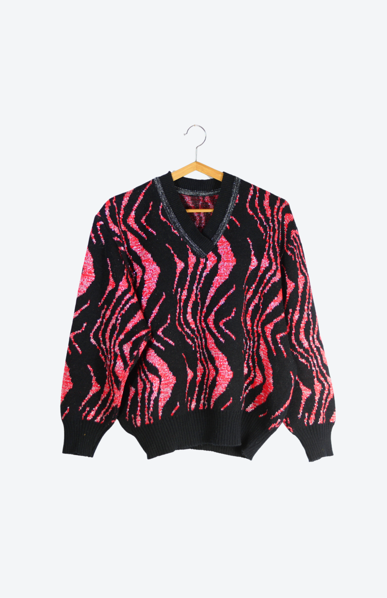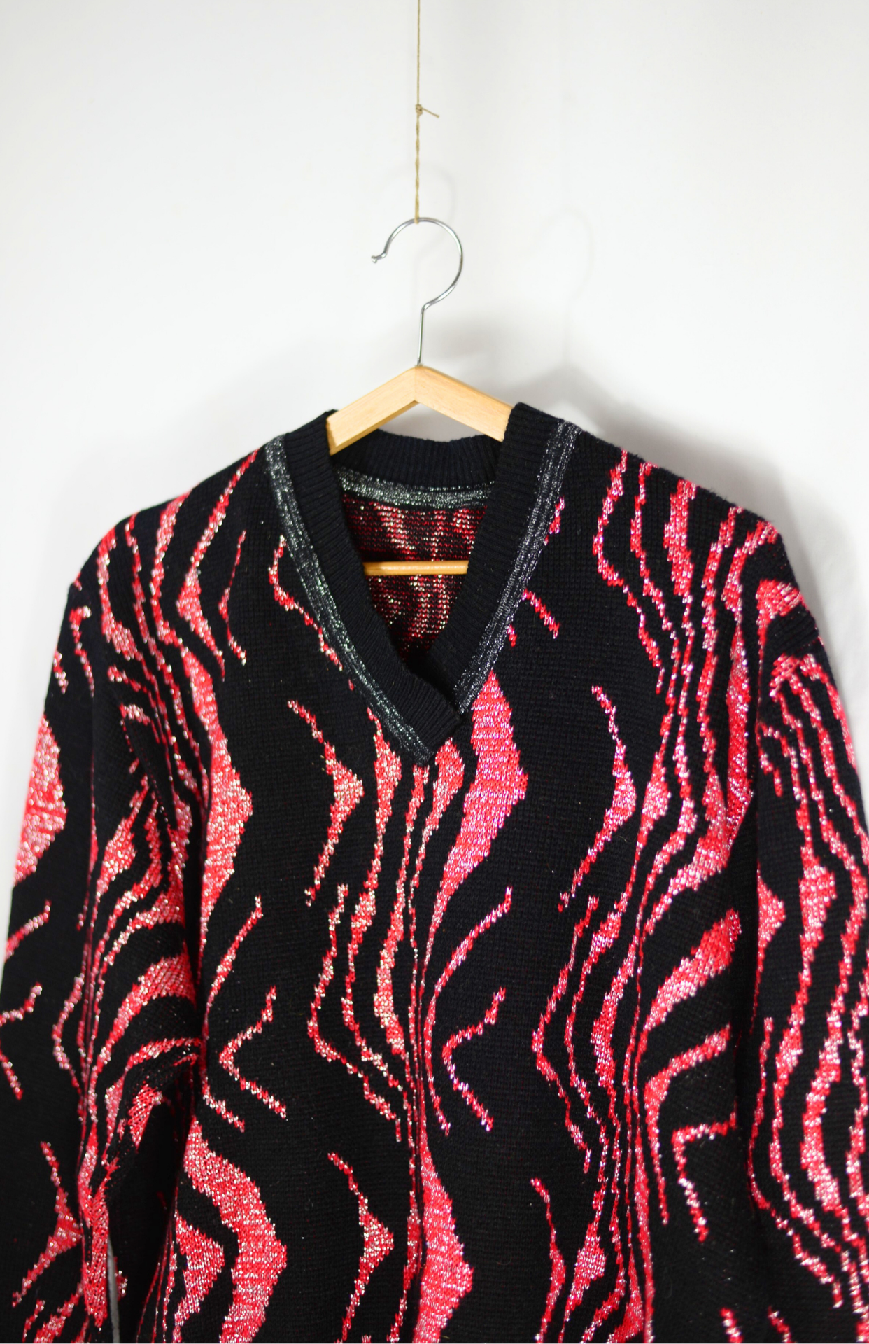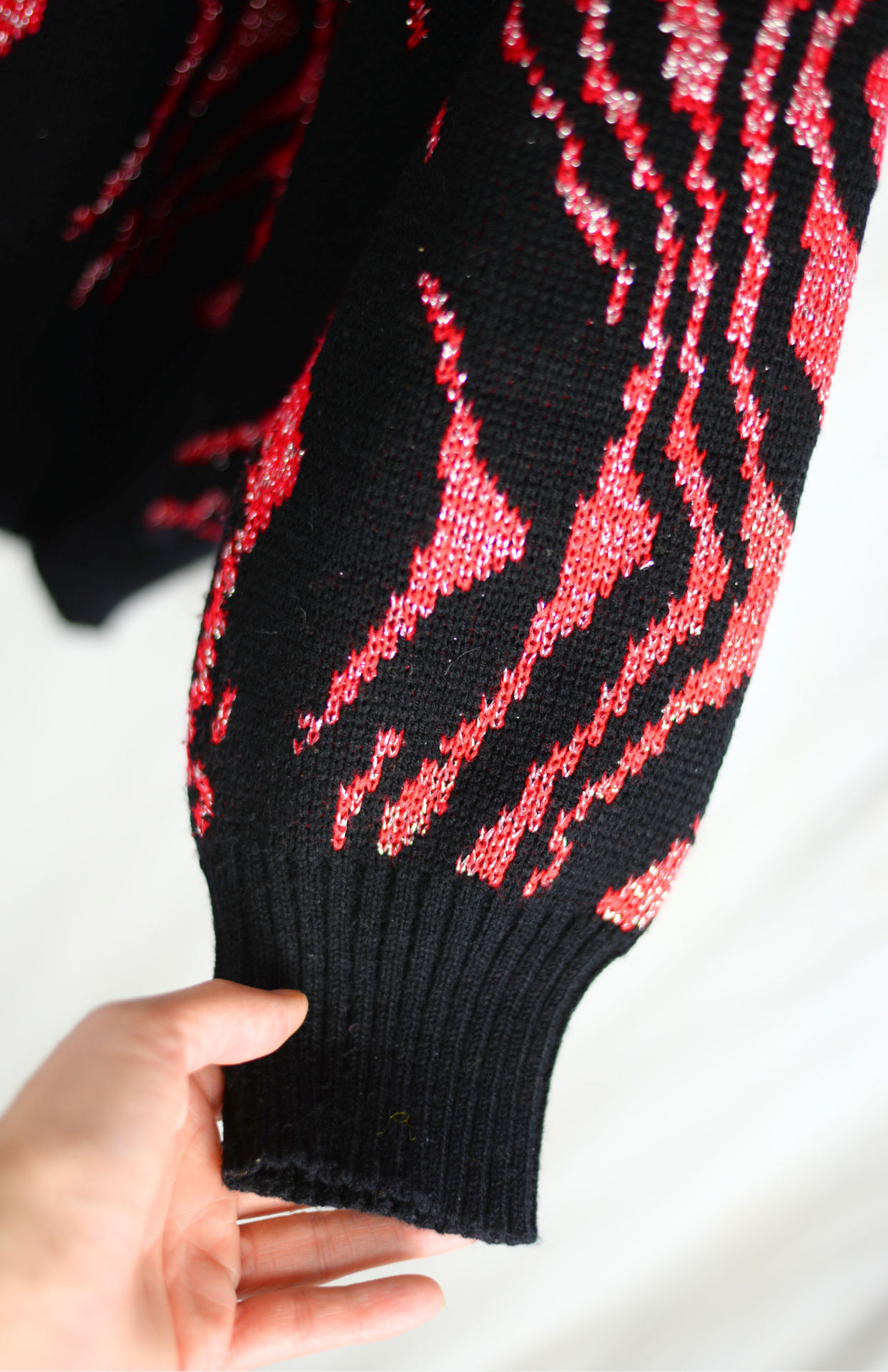 Vintage svetr s třpytivým vzorem. Středně silný úplet a nabíraný rukáv.Stav: Vintage kousek v pěkném stavu, pouze pár žmolečků na boku.