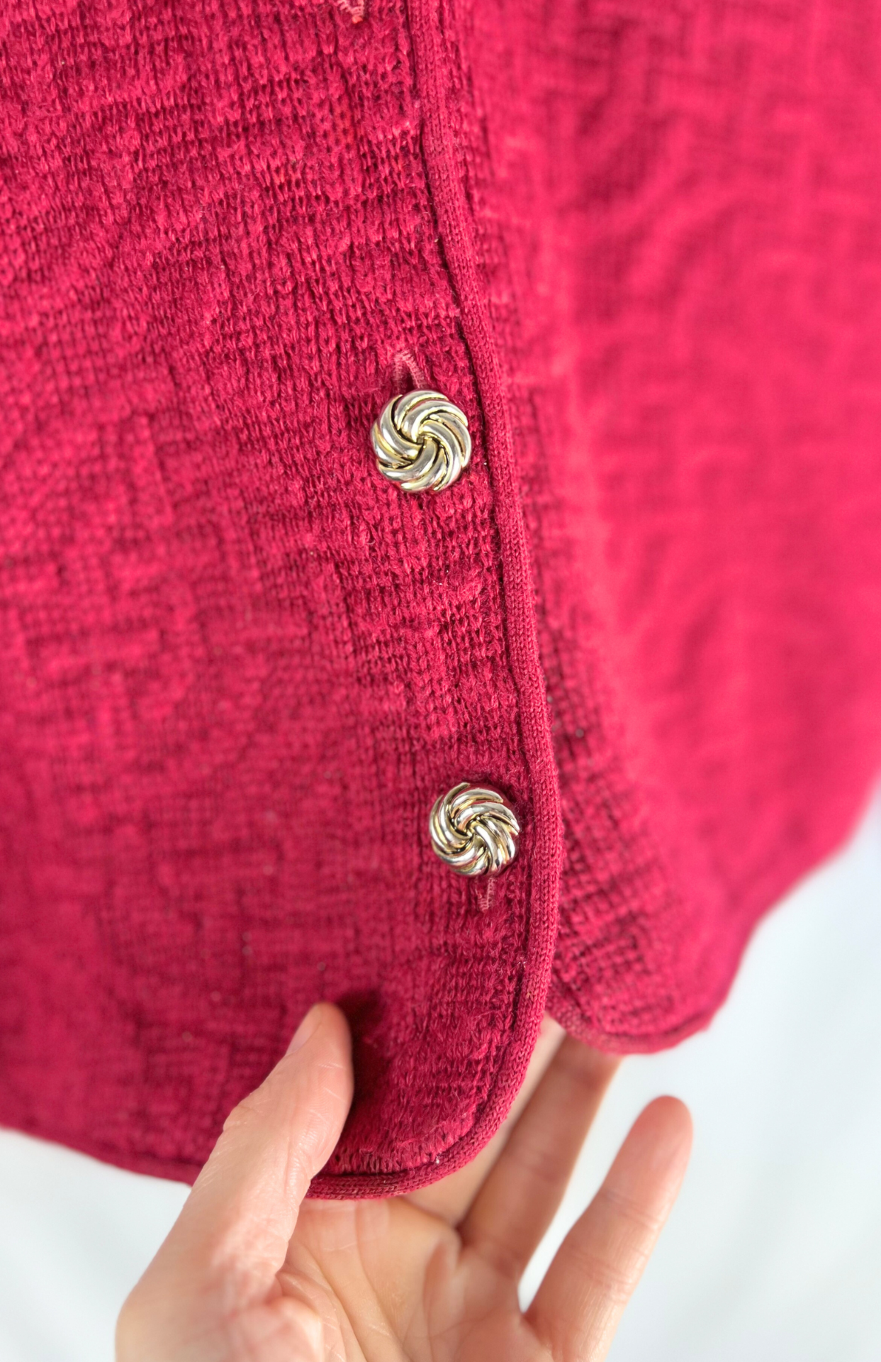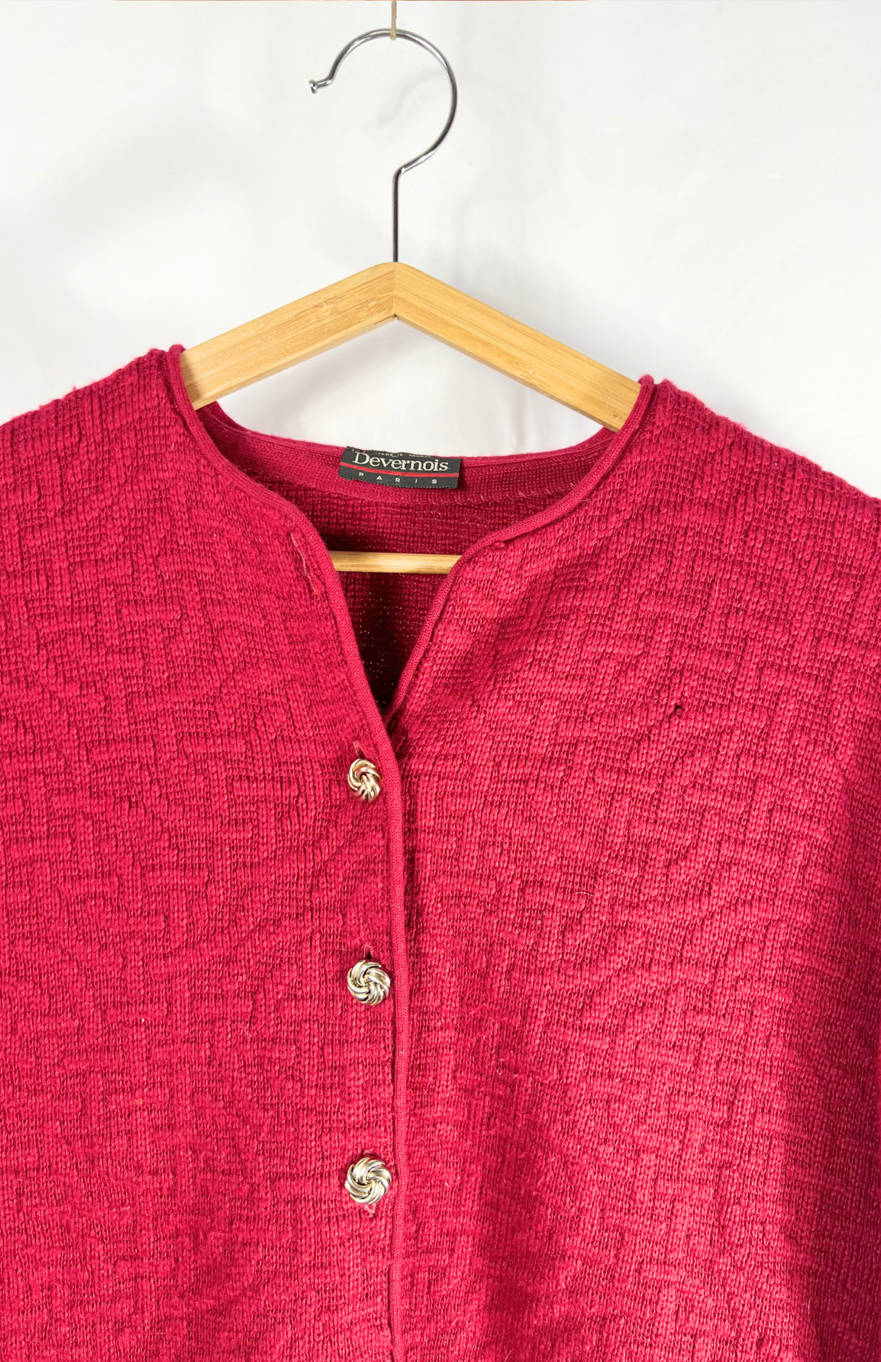 Retro vlněný malinový svetr. Má krásné zdobené knoflíčky a strukturový vzor v úpletu.