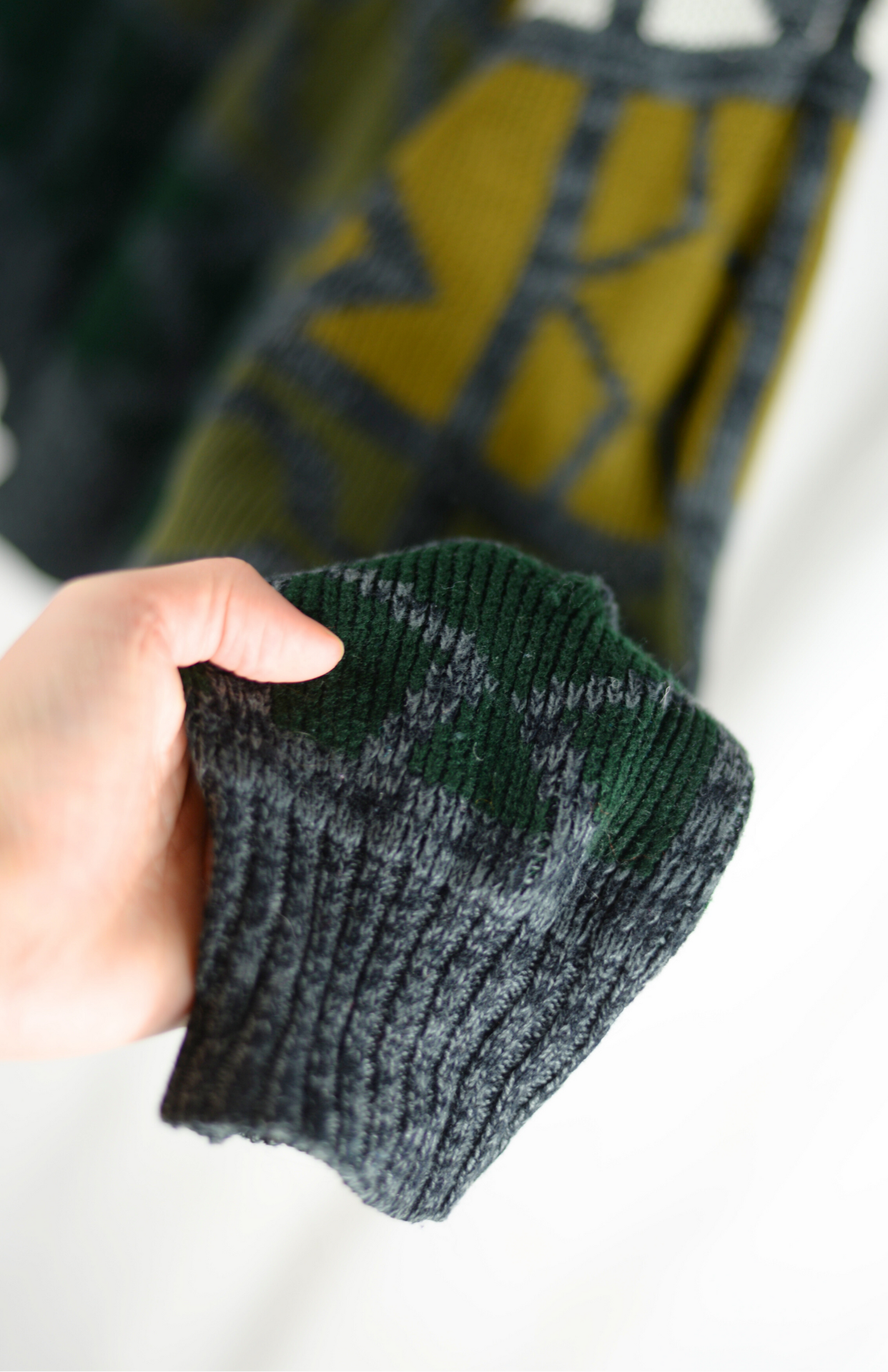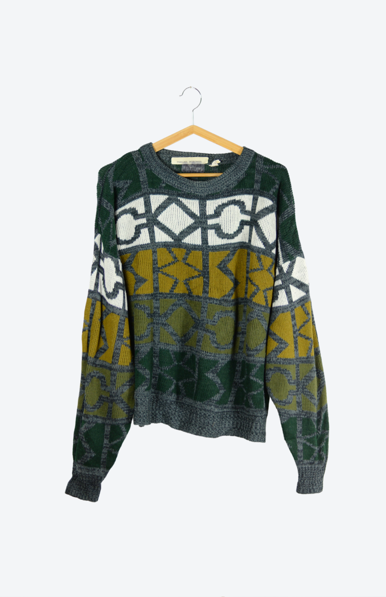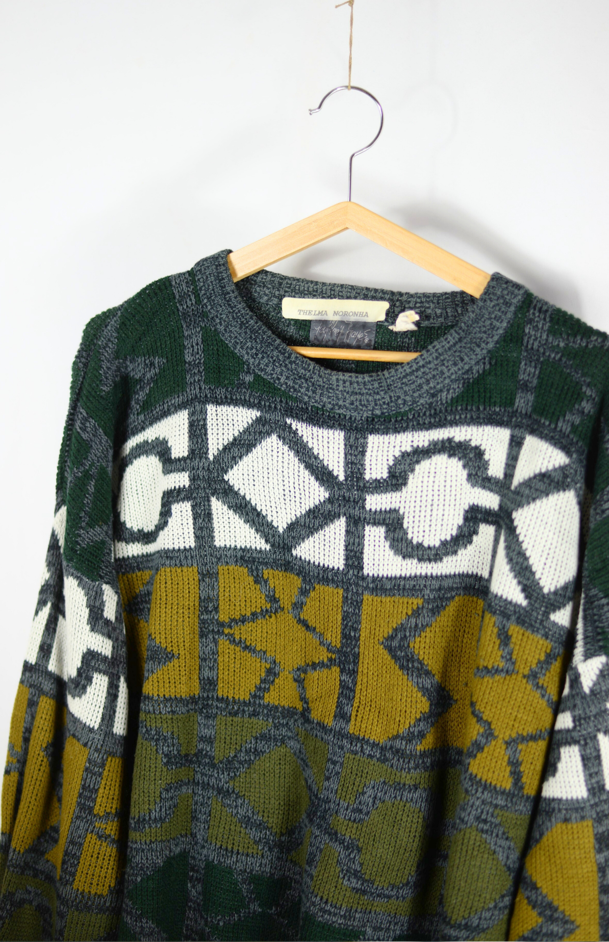 Vinatge svetr s funky barevným vzorem. Má lehce nabíraný rukáv a středně silný úplet.