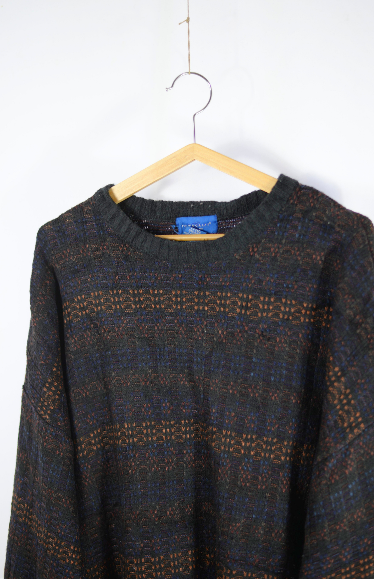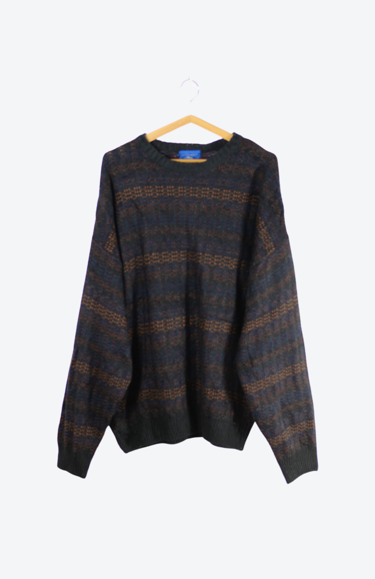 Vintage svetr s funky proplétaným, proužkovaným vzorem.  Má lehce nabíraný rukáv a středně silný úplet. Unisex 80´s střih.