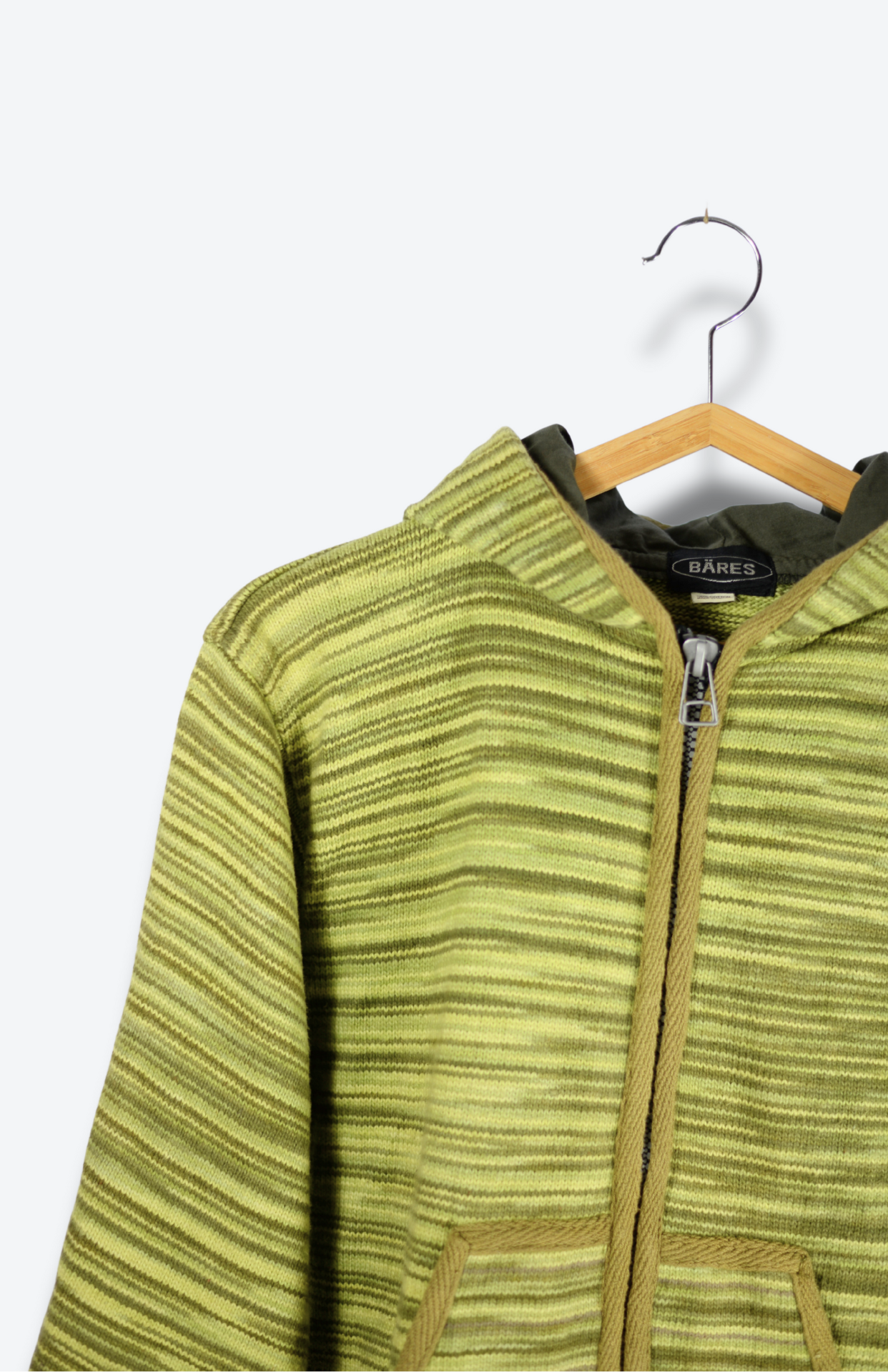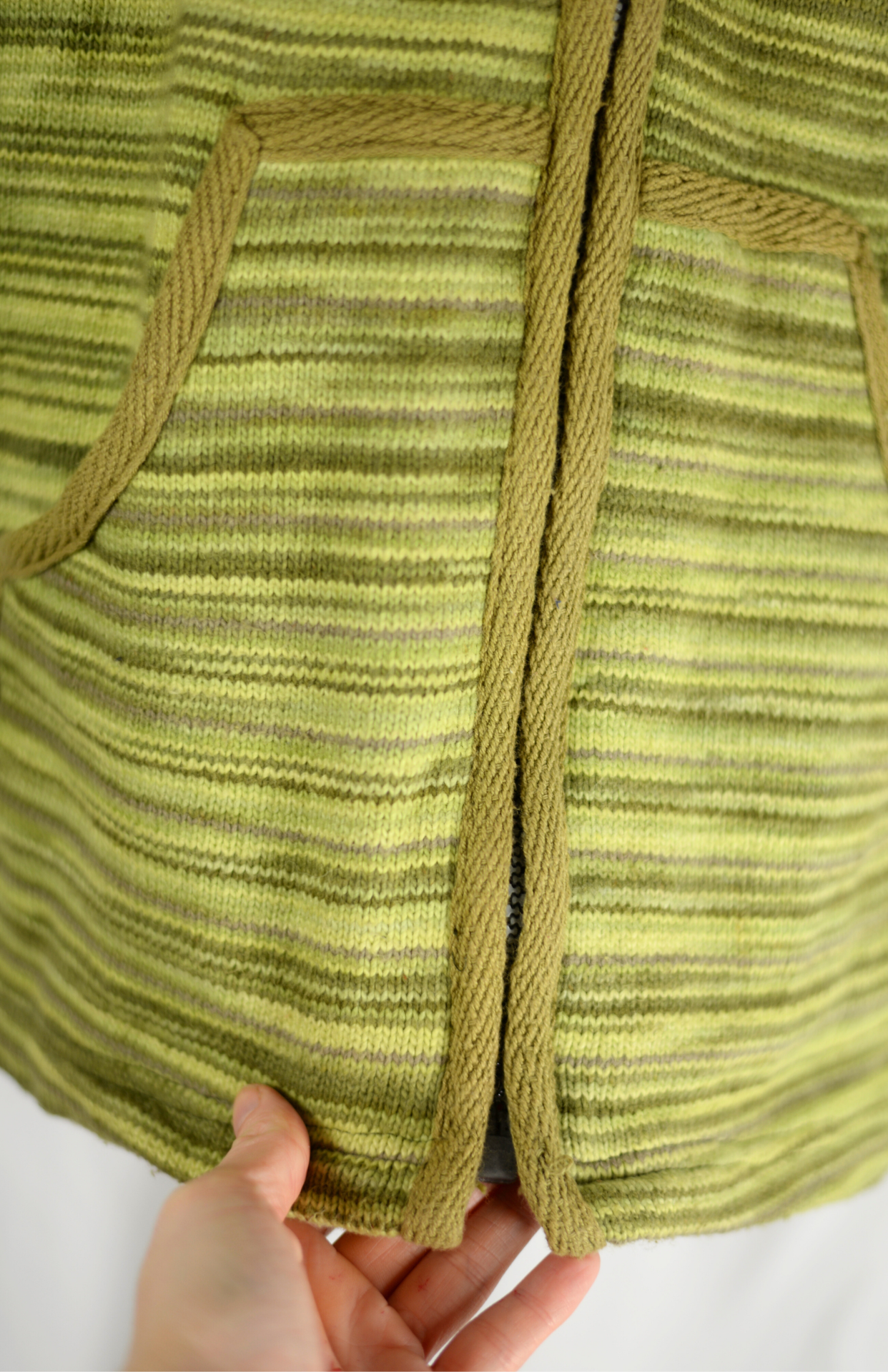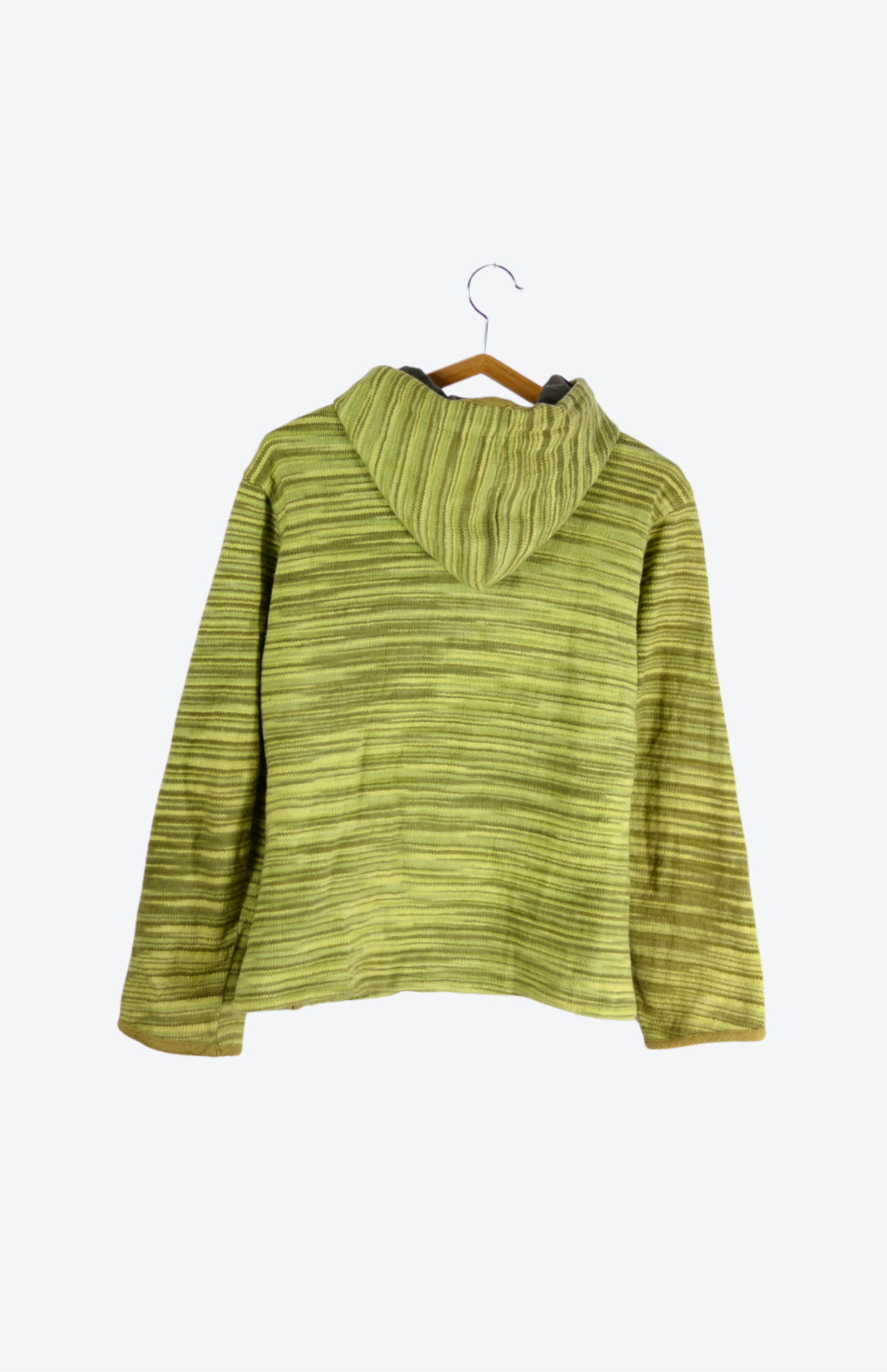 Retro silný zelený svetr s kapucí a kapsami. Vzor s funky melírovanými proužky. Na středu má zapínání na zip. Stav: Ve skvělém stavu, bez vad.Materiál: 100% bavlna