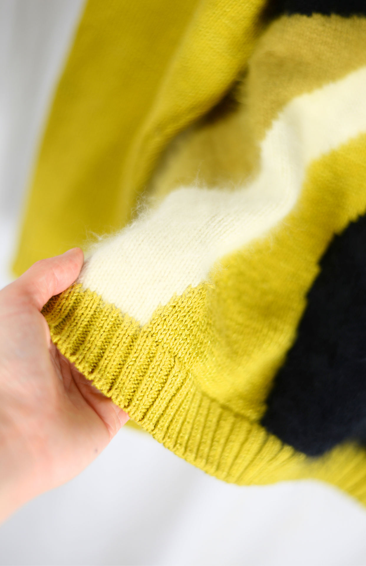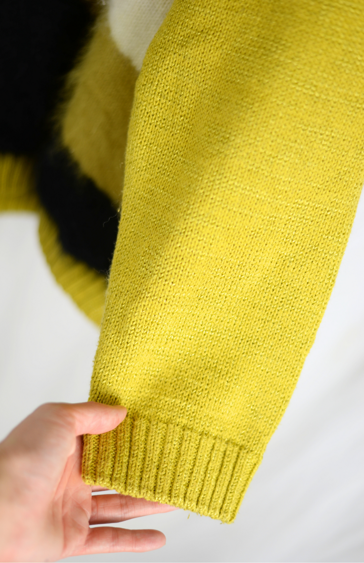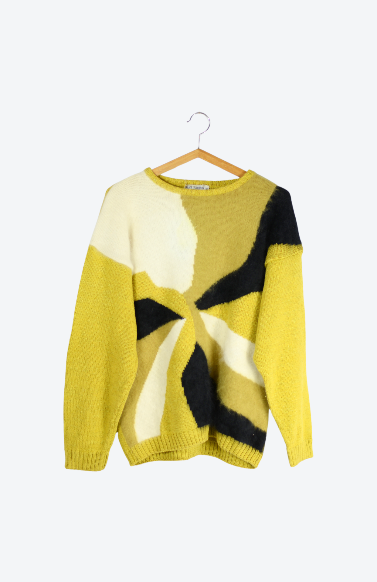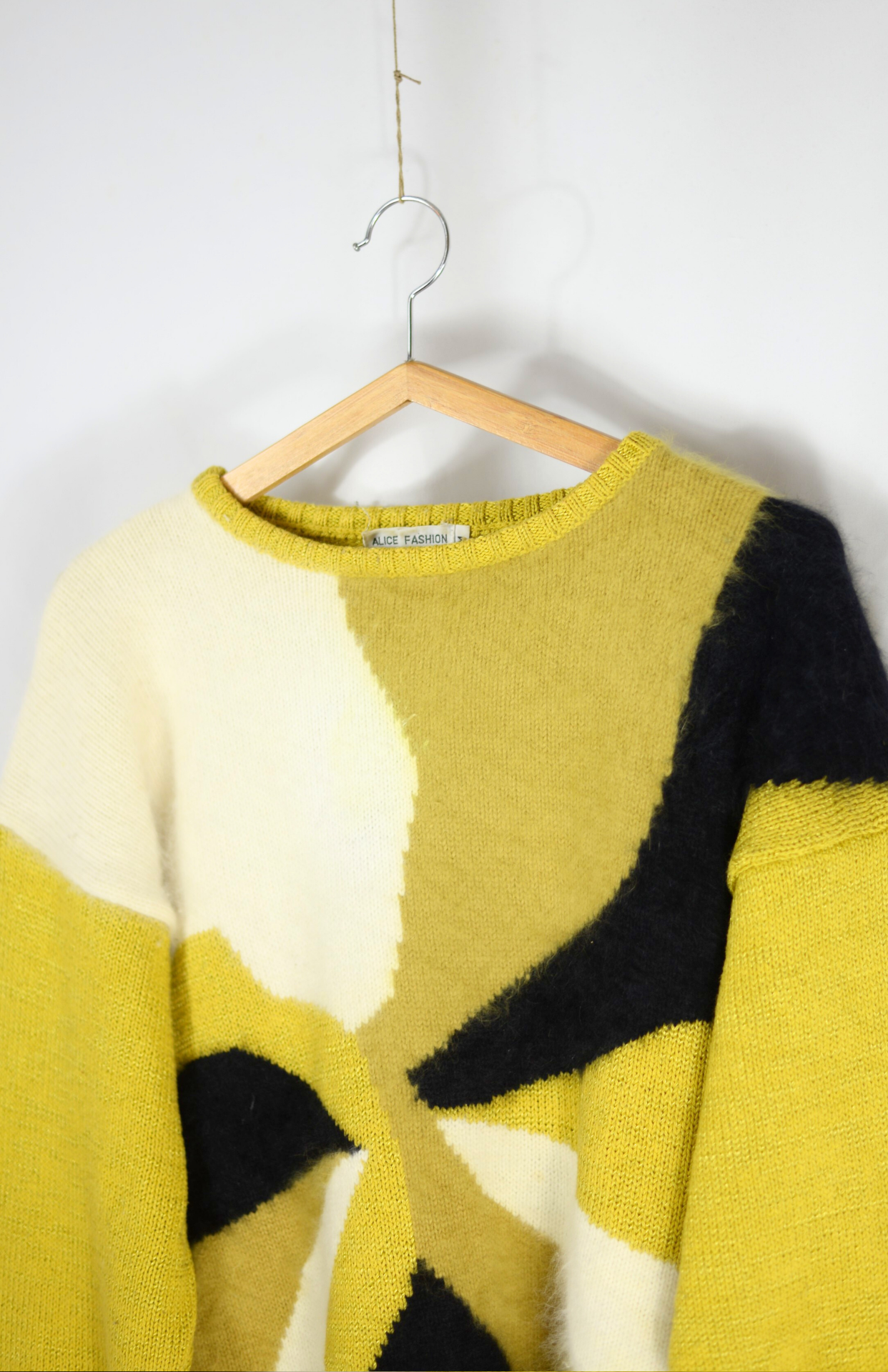 Vintage svetr s rozvířeným abstraktním vzorem. Vzor je heboučký, vyrobený z angory. Středně silný úplet a lehce nabíraný rukáv.