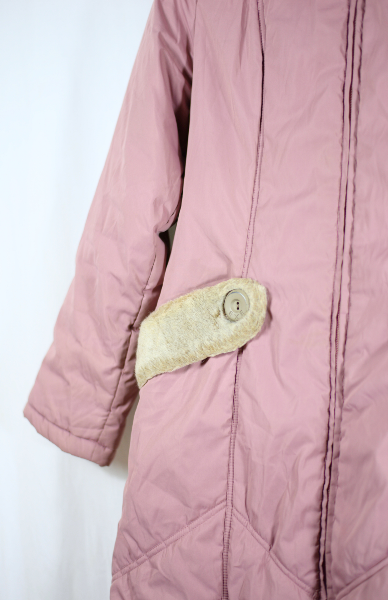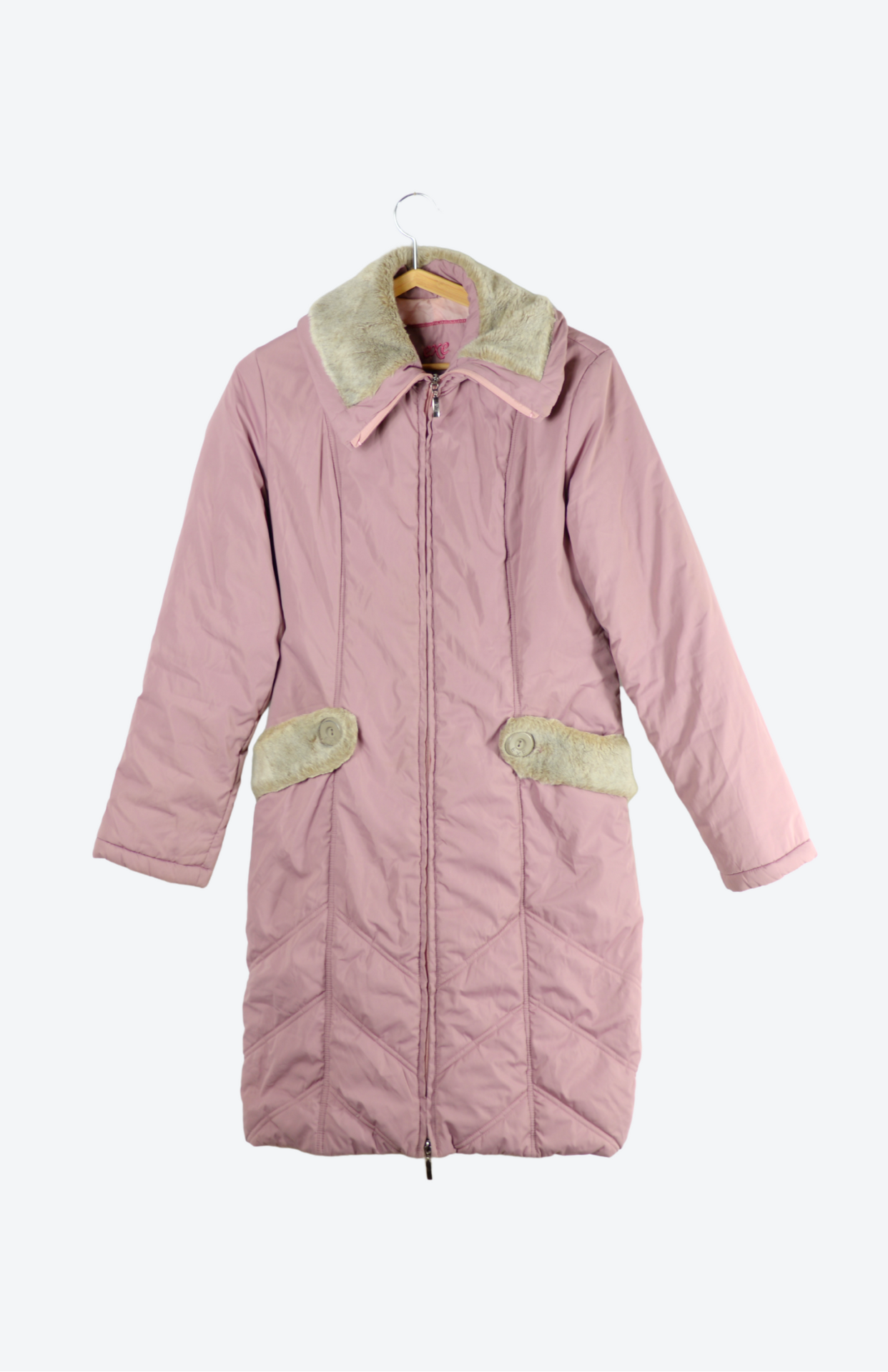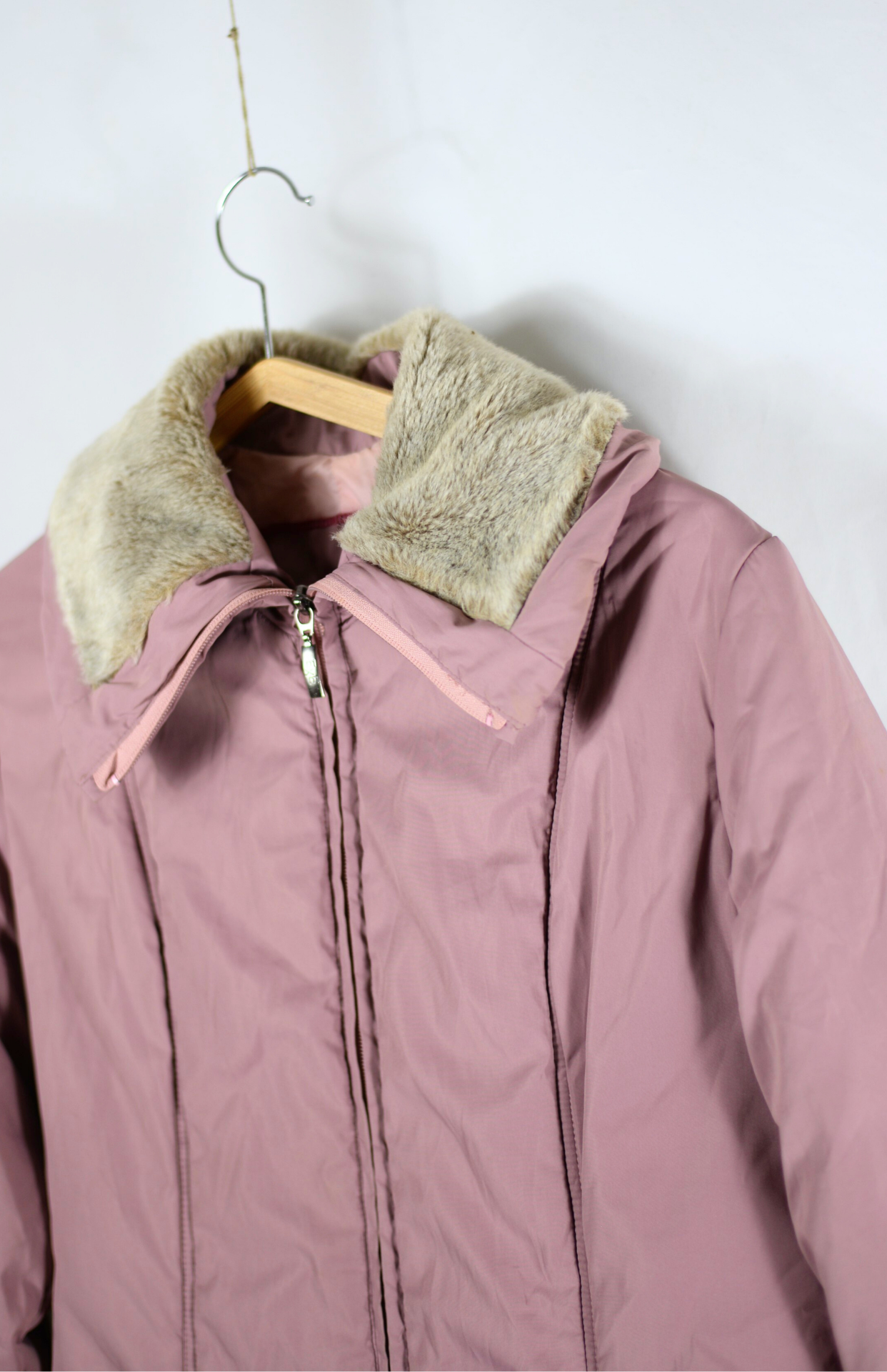 Delší retro pastelová bunda / kabátek. Má detal kožíšku na límečku a přeskách v pase. Cute vintage kousek. Zapíná se na zip.