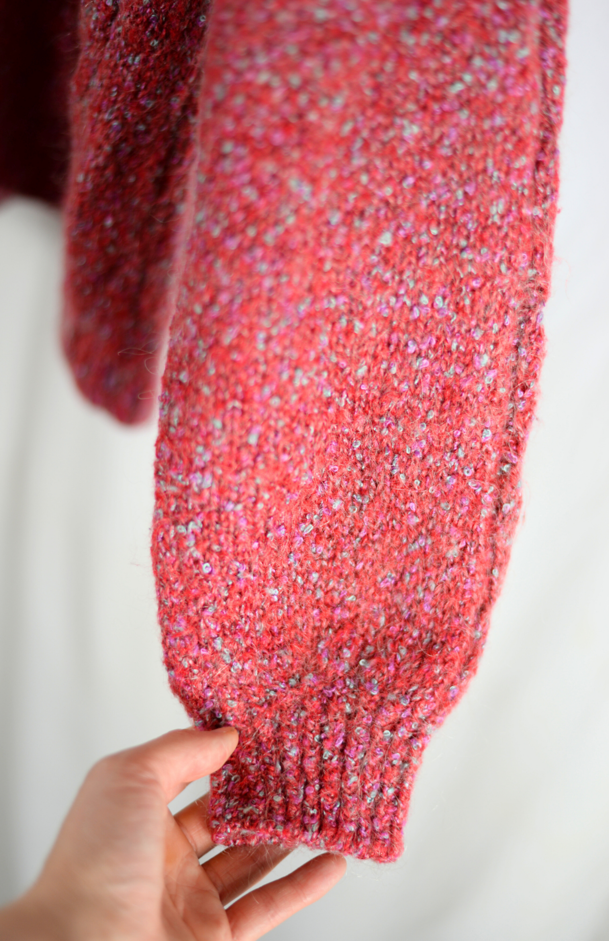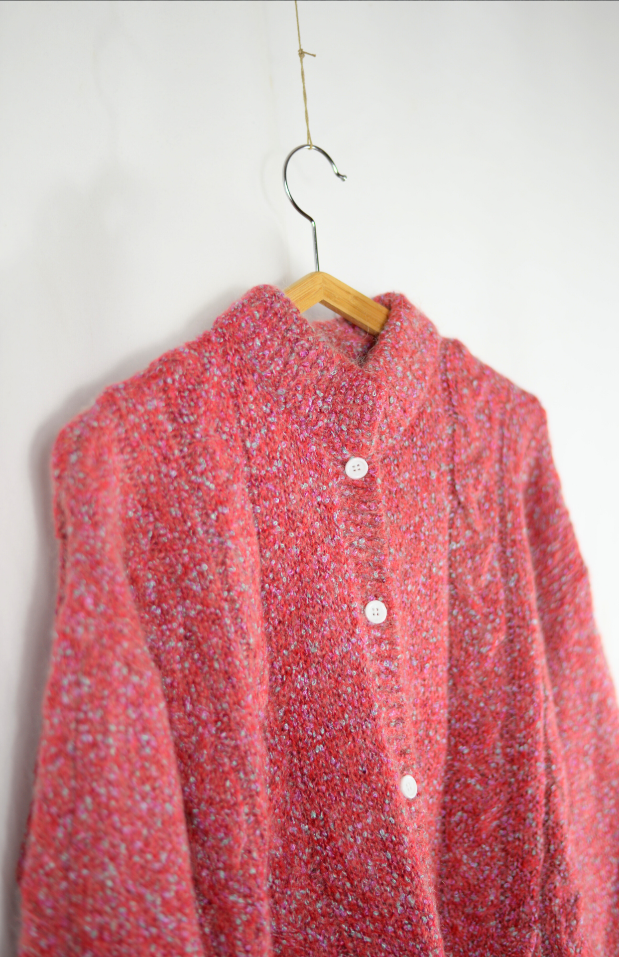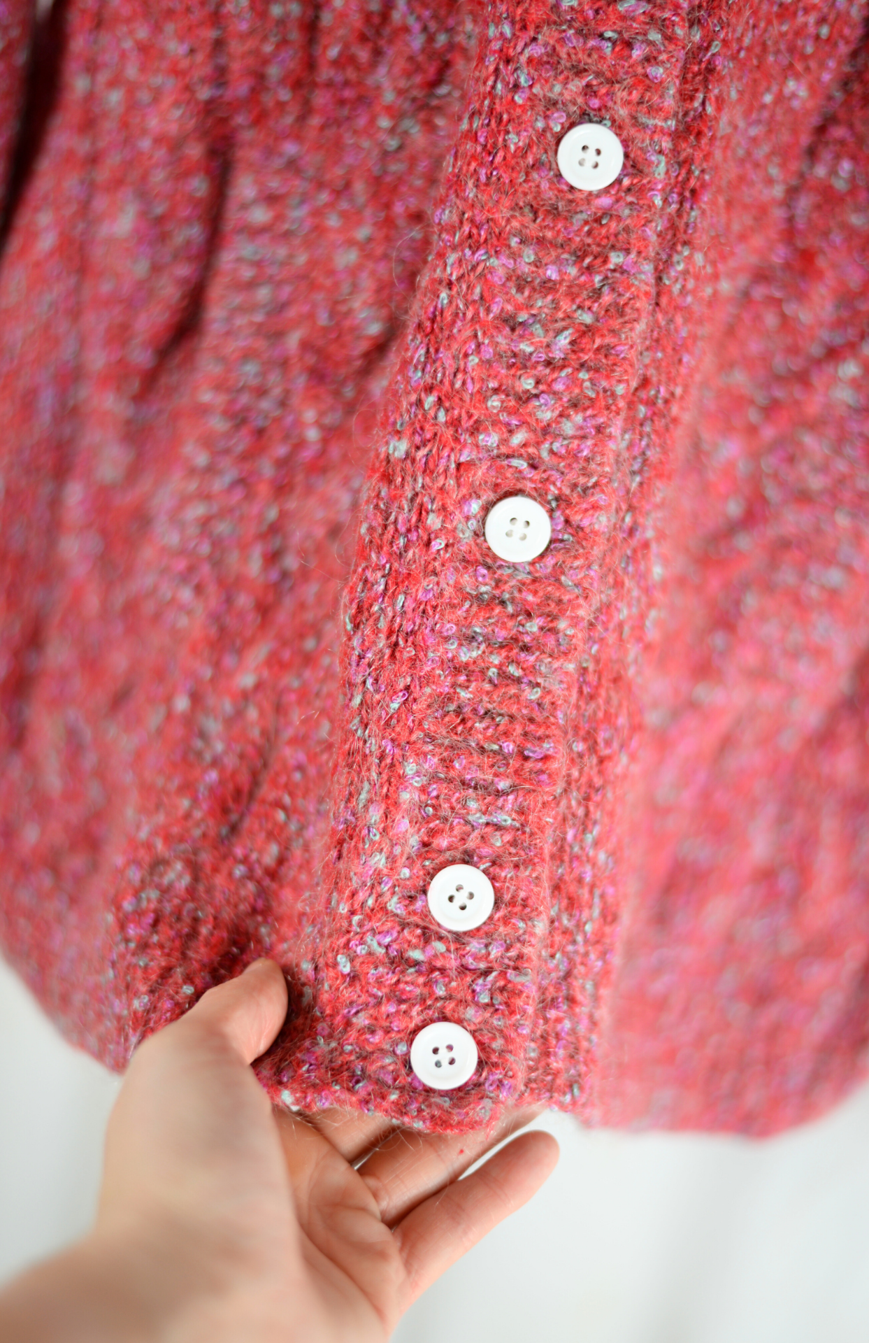 Malinově růžový, silnější svetr s barevným žíháním. Propínací na bílé knoflíčky, má dorbně nabraný rukáv a stojáček u krku. Po stranách s kapsami. Dílem ruční práce.