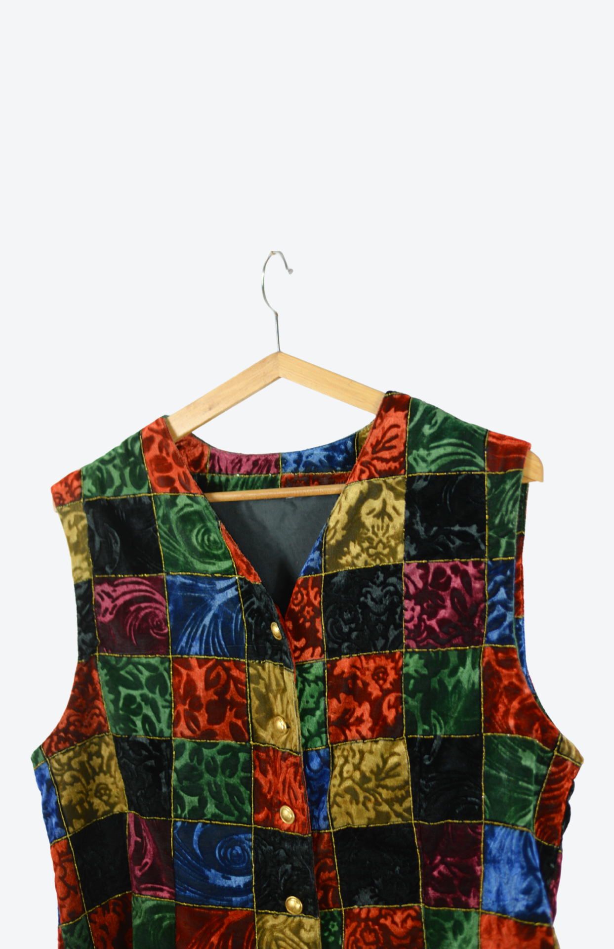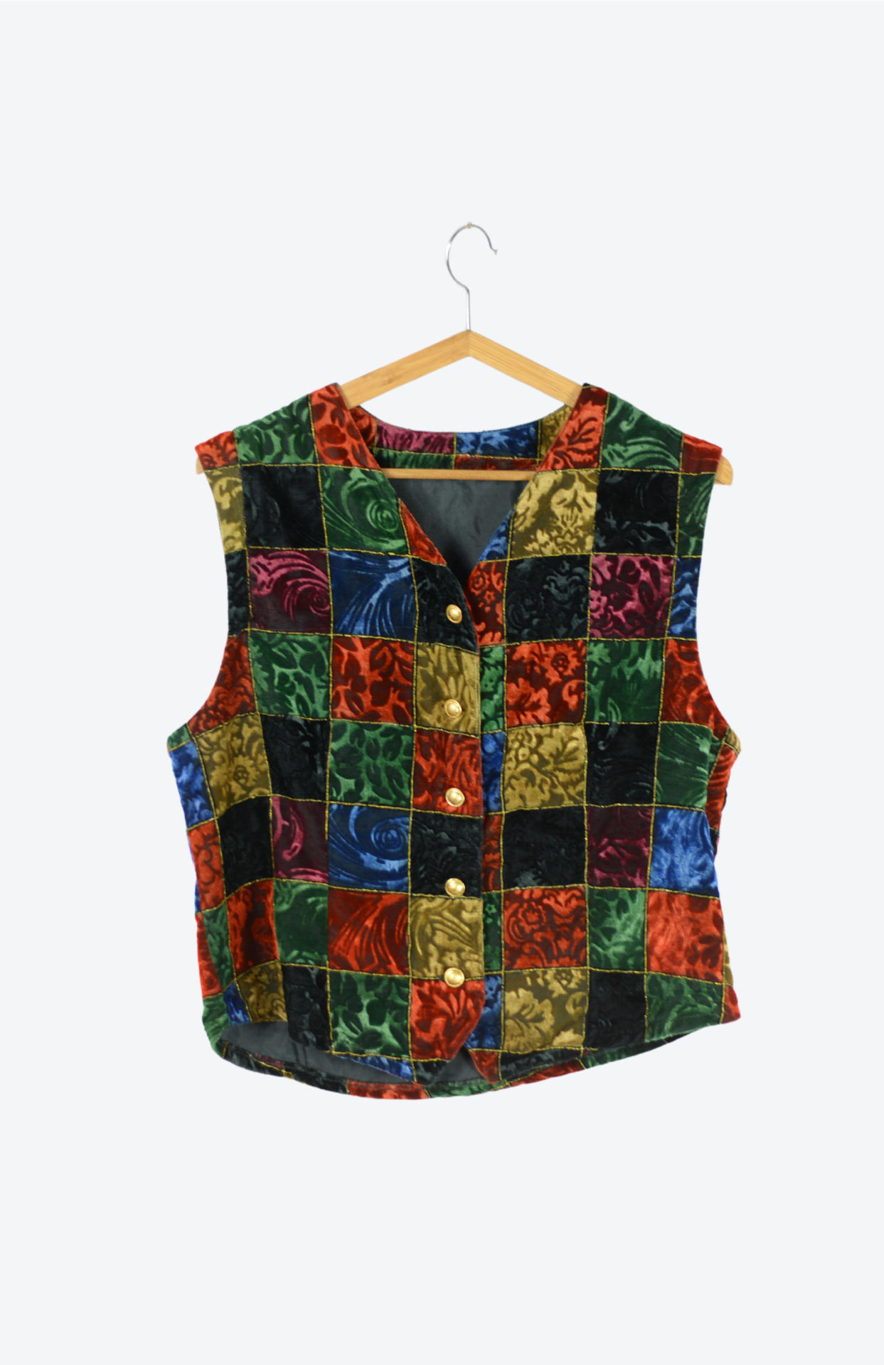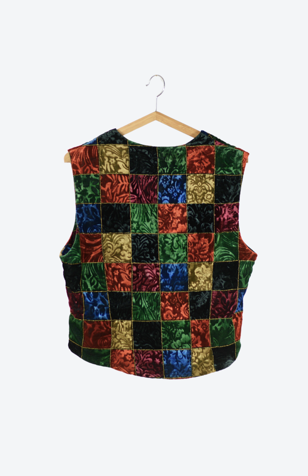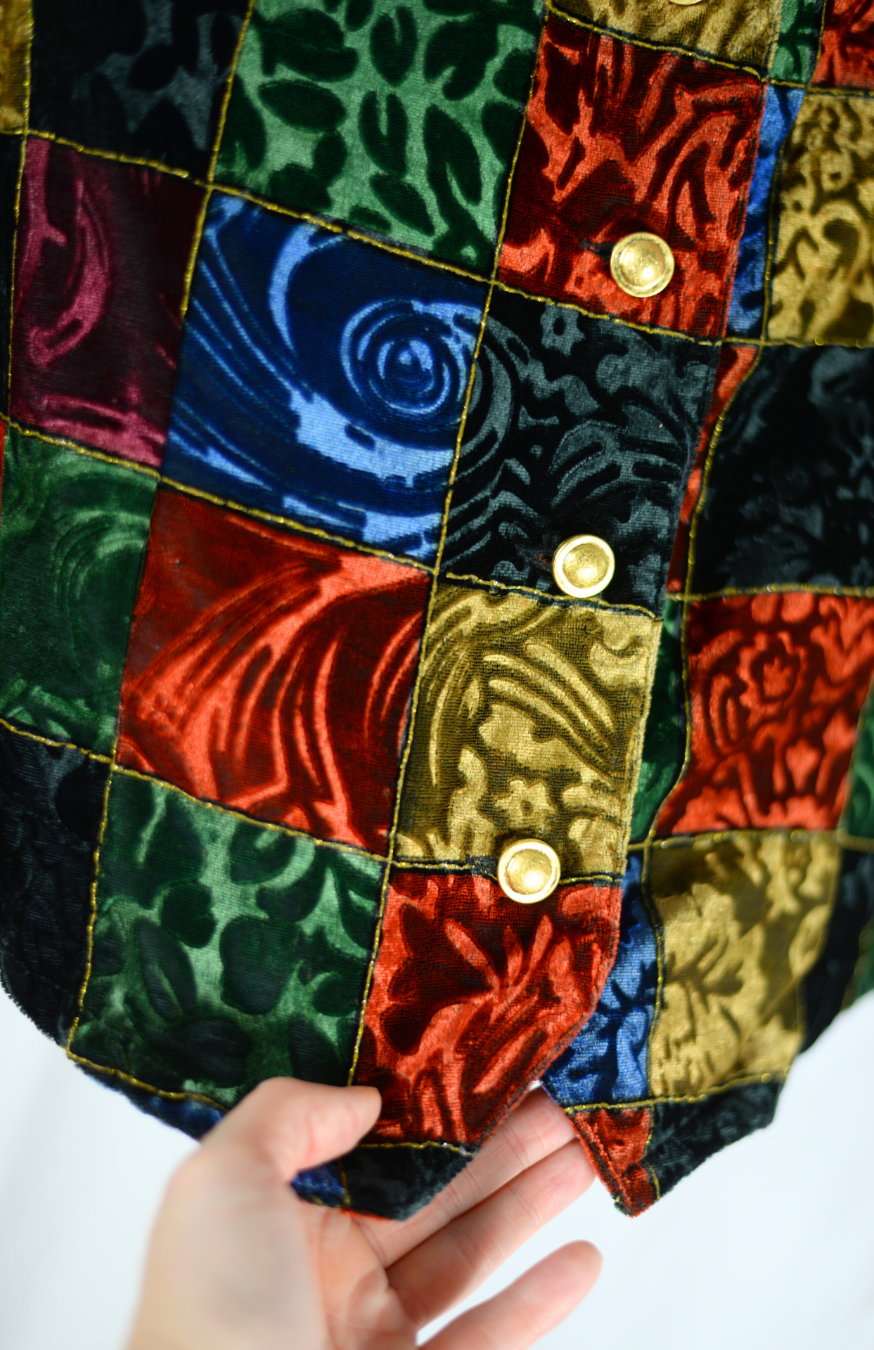 Sametová vesta s kostkami a listovým vzorem. Vzorovaná z obou stran. Má saténovou černou podšívku a pěkné zlaté knoflíčky.