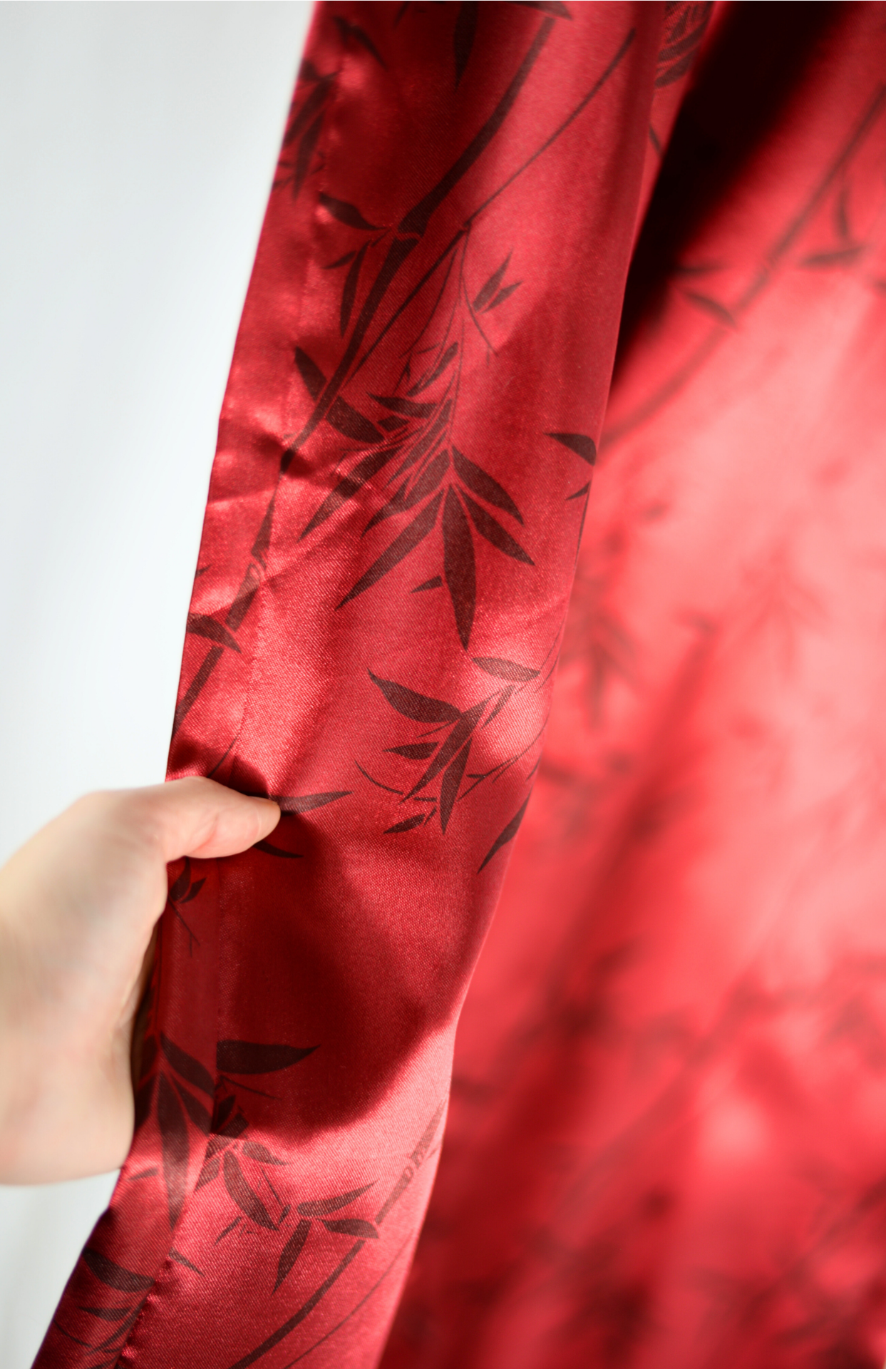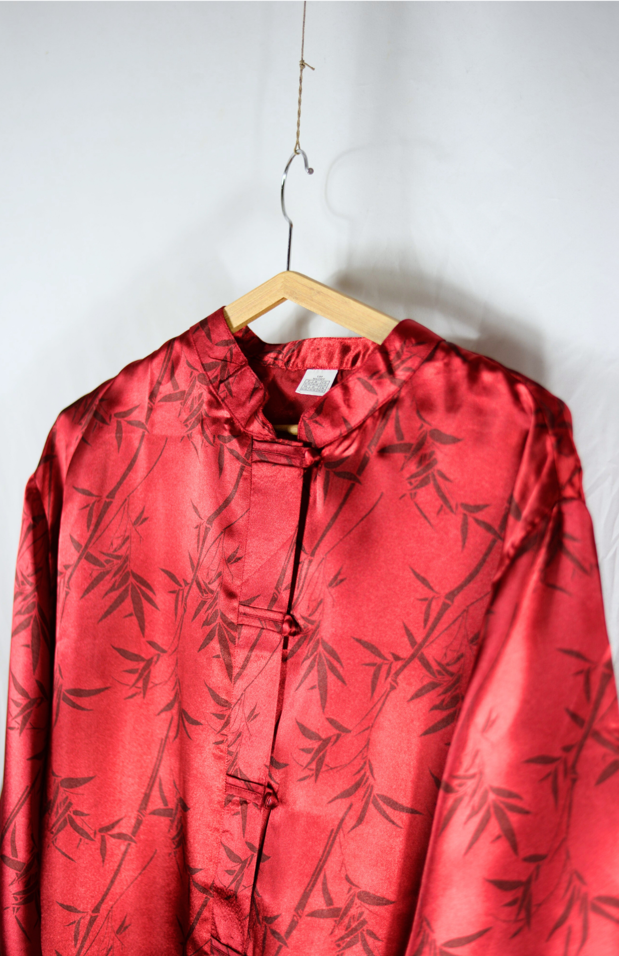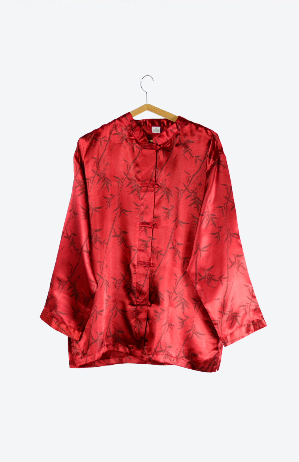 Saténové pyžámko s motivem bambusových větví a zapínáním na průvleky. Asia vibe, volný střih a příjemný saténový materiál. Komplet topu + kalhot.