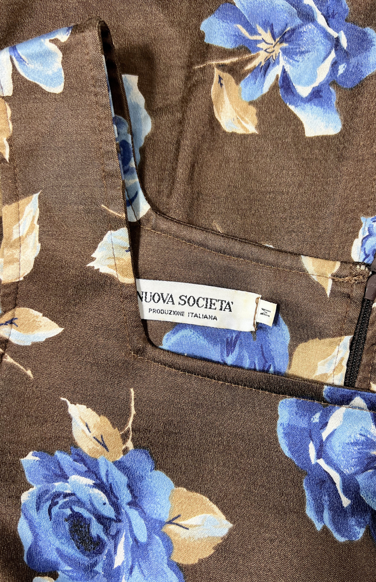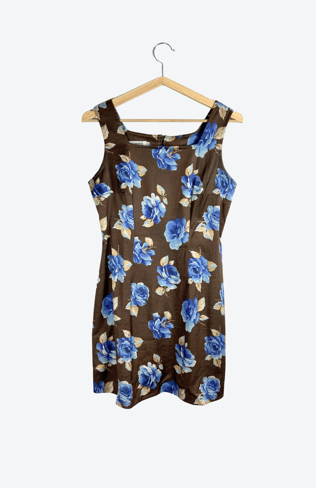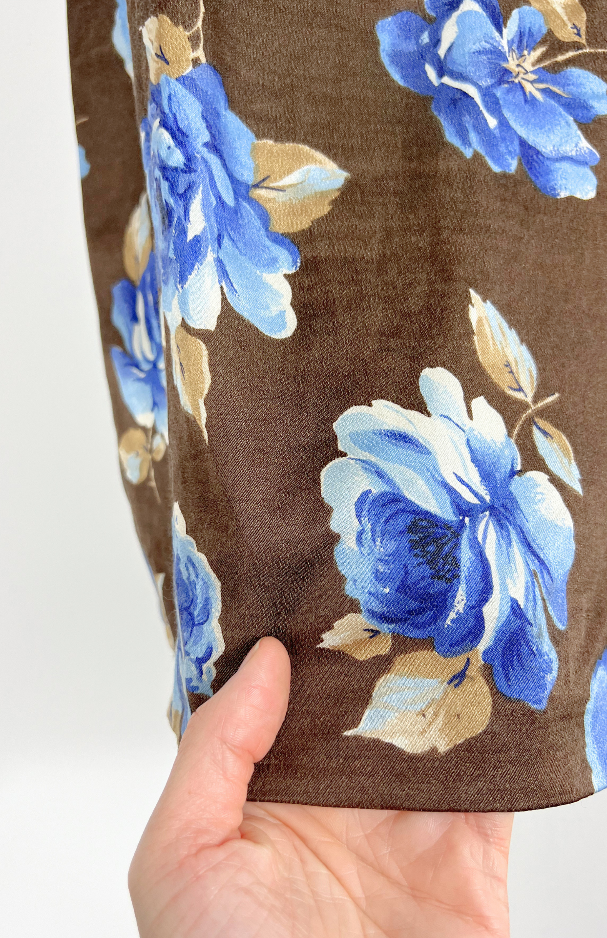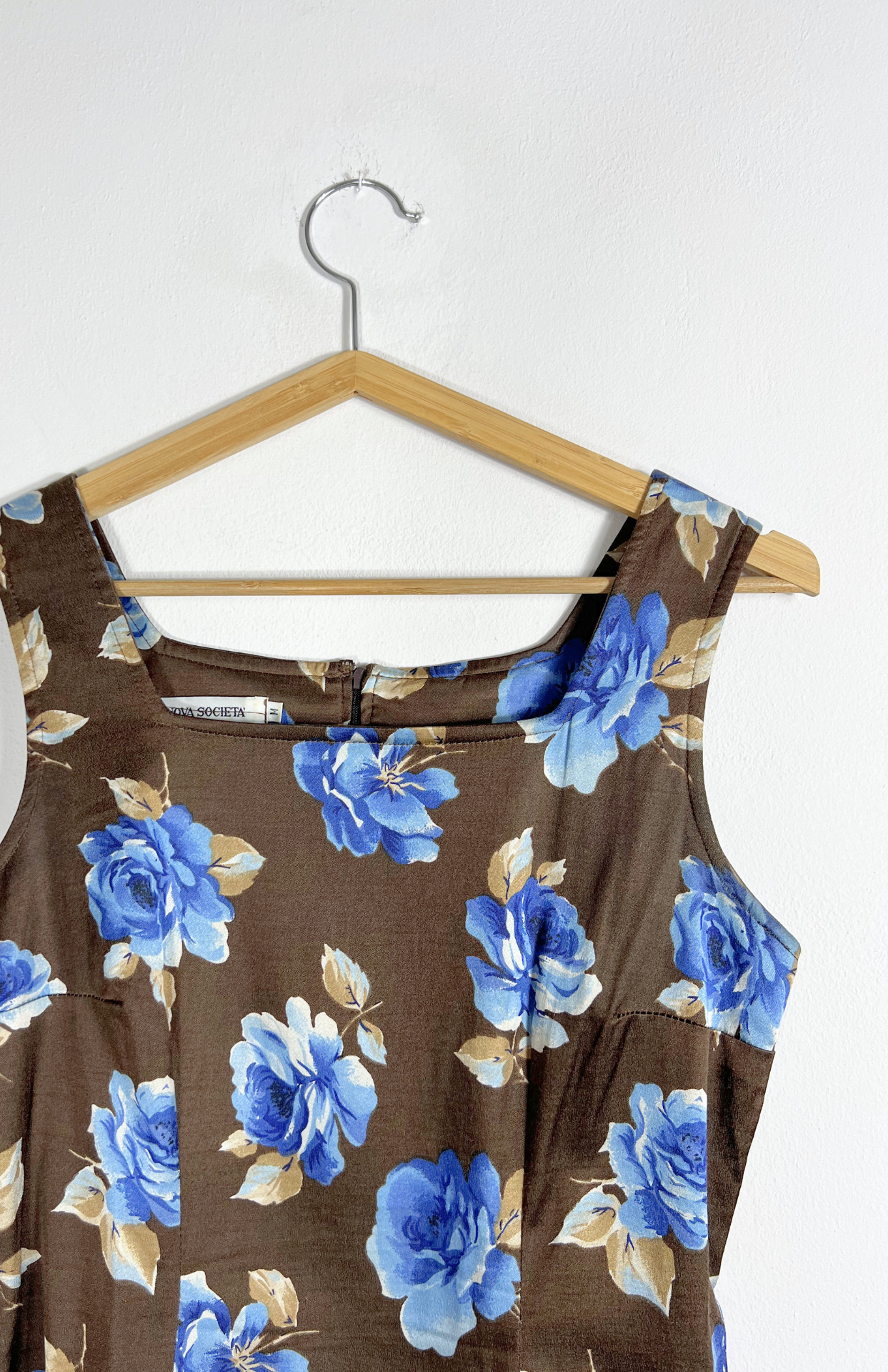 Retro šaty ze silného saténu. Mají silná ramínka, hnědá podklad a modré květy. Na zádech zip.