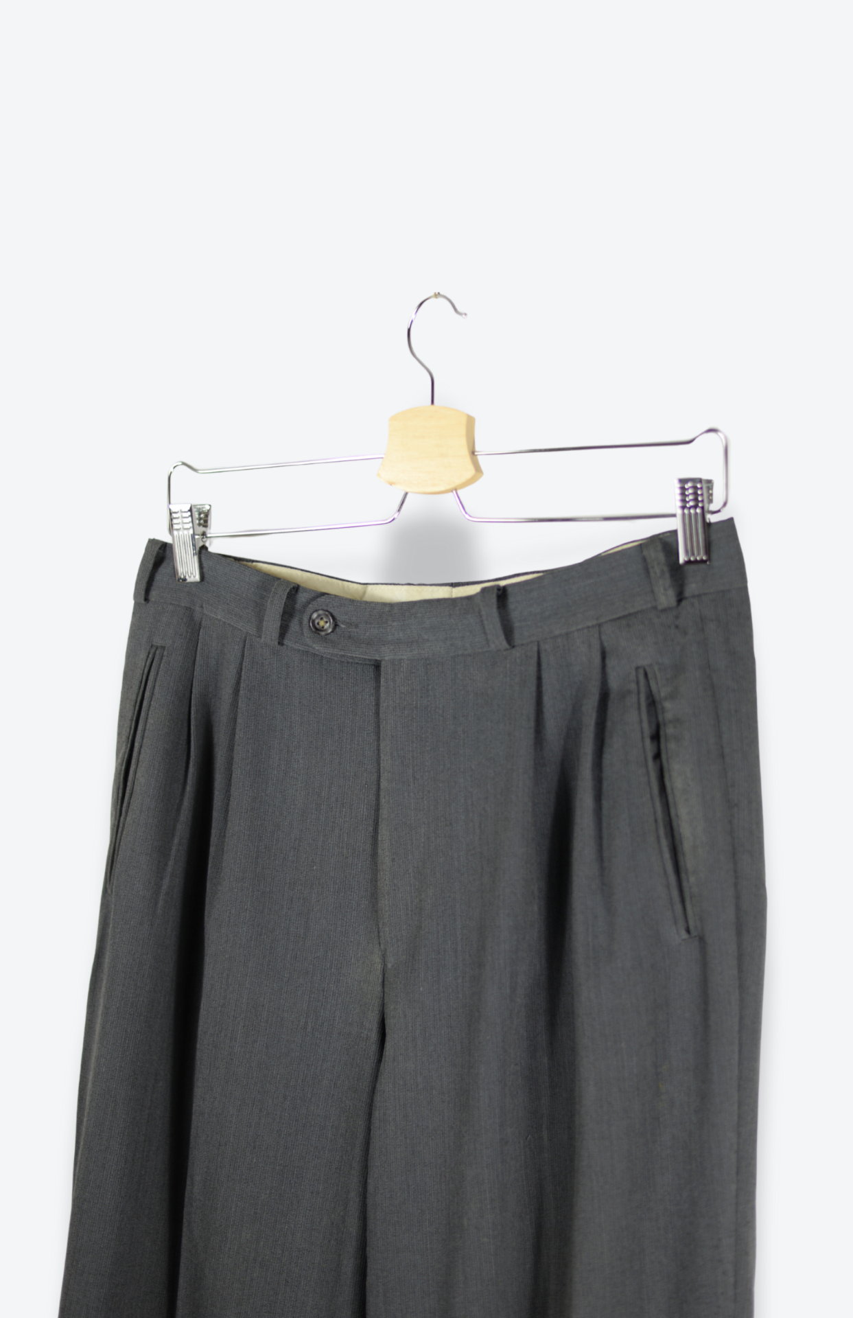 Šedé elegantní společenské kalhoty do pasu. Mají vyšší pas, jemné puky a kapsy vzadu. Pánské / unisex. Nohavice dost dlouhé i pro vysoké.
