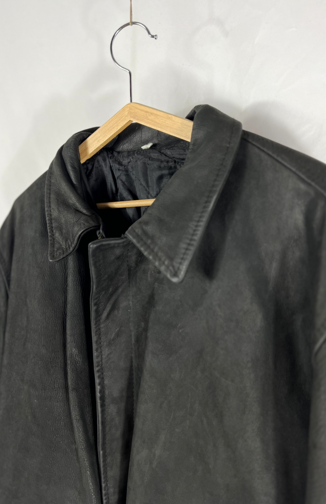 Vintage černá bunda ze silné matné kůže. Velmi pěkně zpracovaný, silný těžký kousek. Má límeček a výrazné kapsy s klopou. Uvnitř drobné kapsy se zipem. Pěkný detail s kovovou sponou. Pánská / oversize unisex.