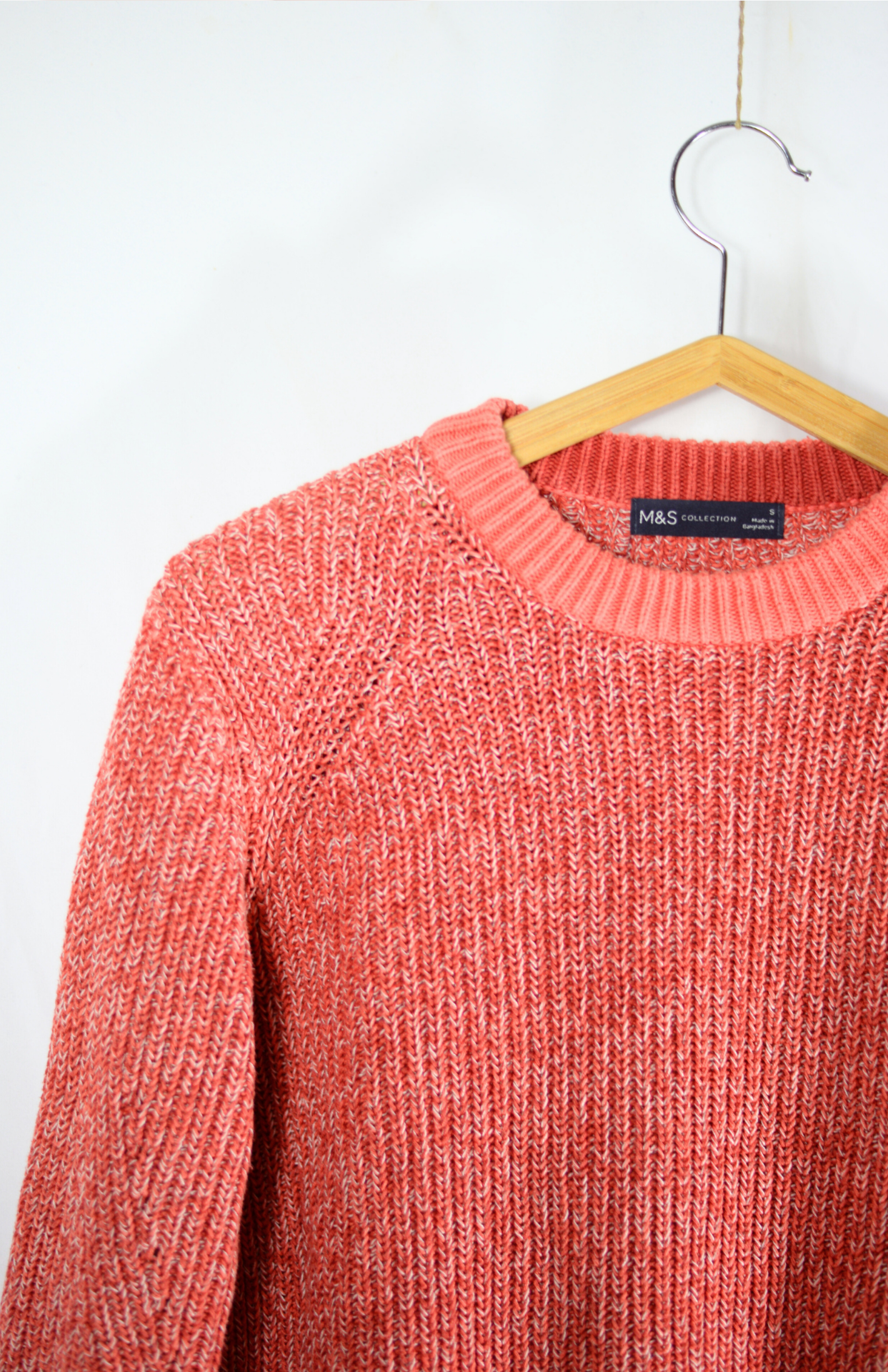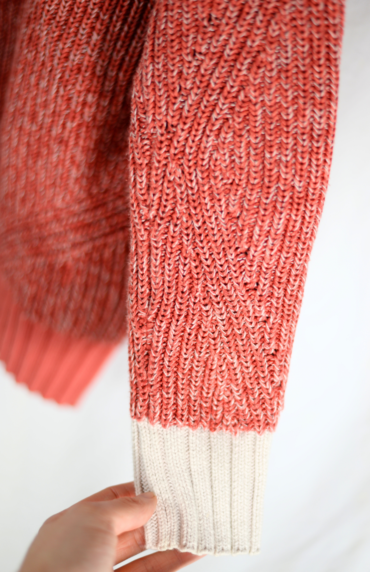 Silný, čistě bavlněný svetr s funky detaily. Krémové konce rukávů, pastelovým lem a barevné žíhání v úpletu. Pěkně zpracovaný.