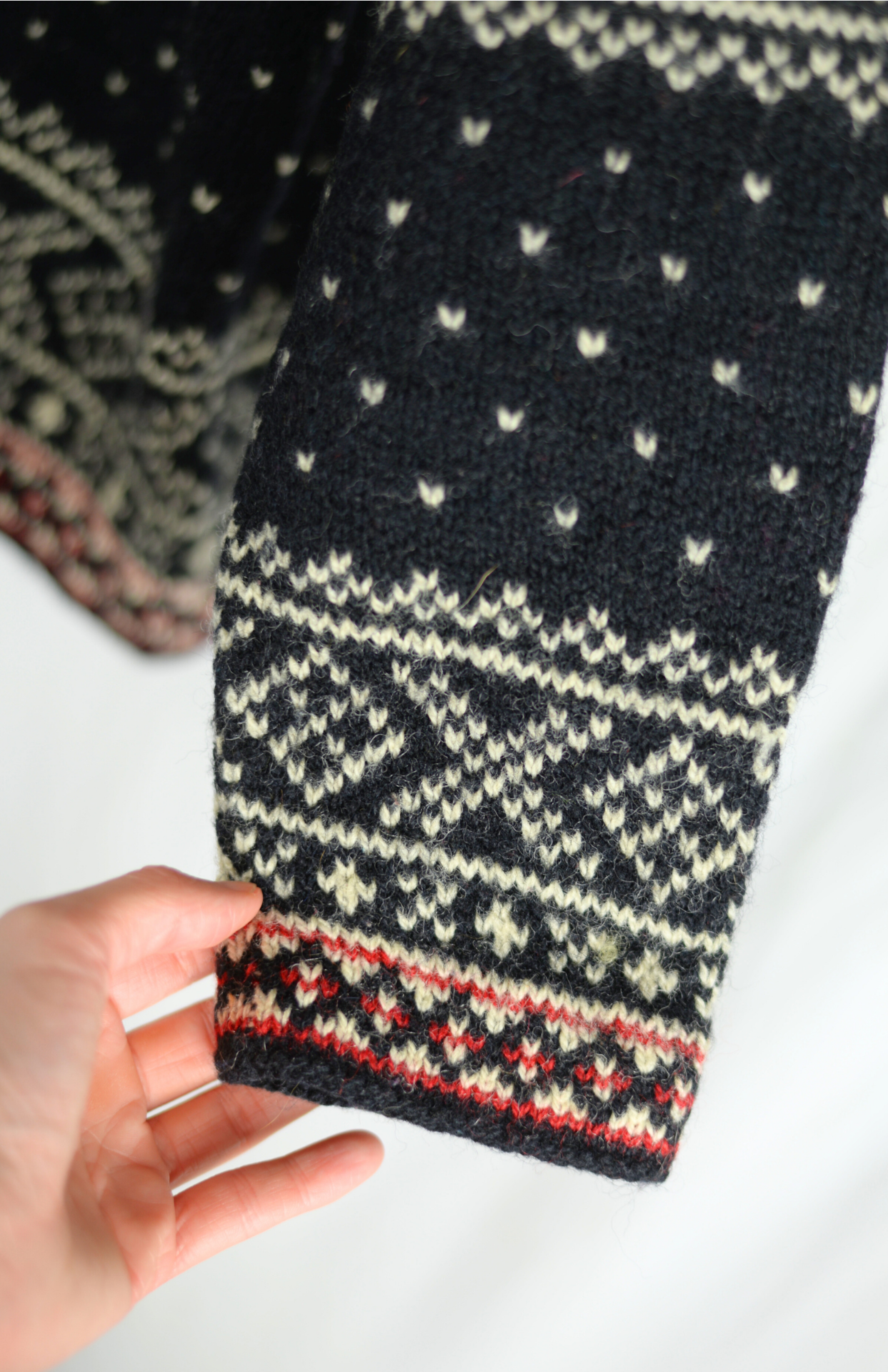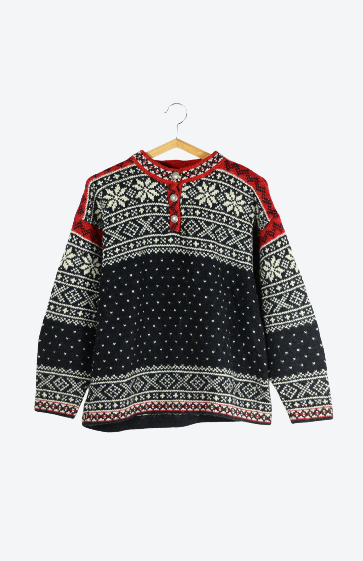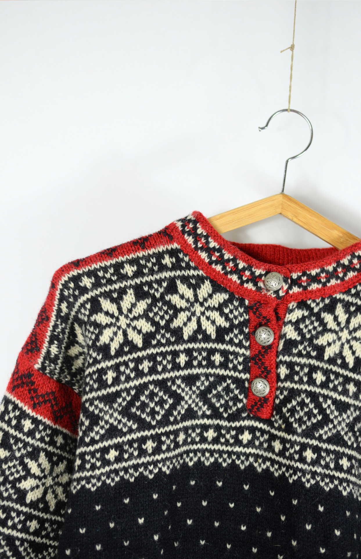 Vlněný norský svetr s vločkovým vzorem, puntíky a sytě červeným detailem. Má zdobené kovové knoflíky. Silný teplý úplet a unisex střih.