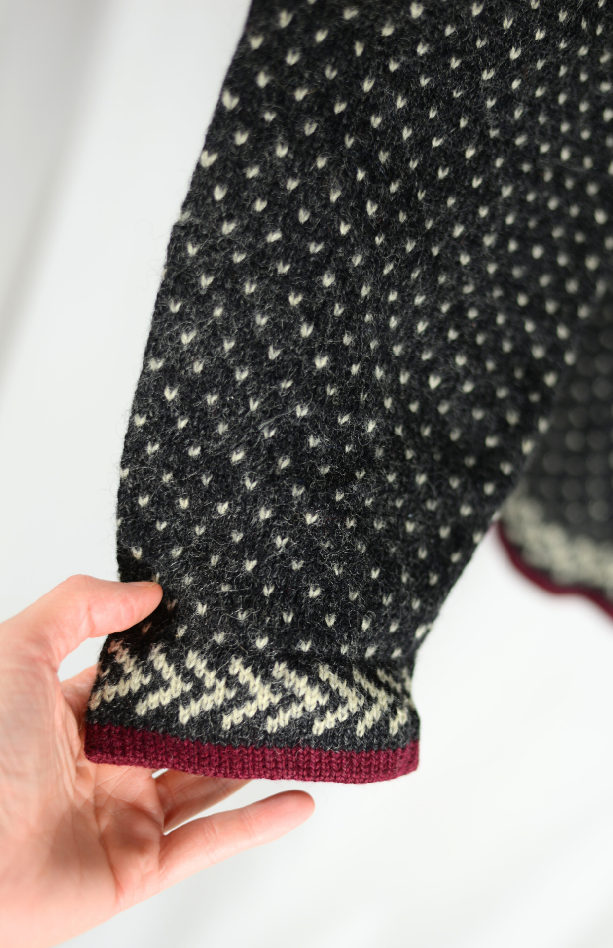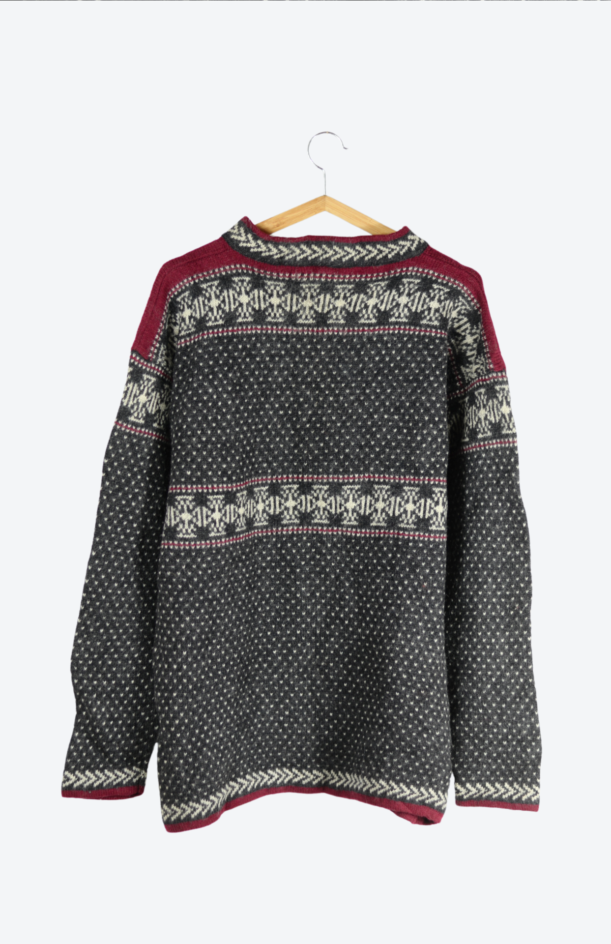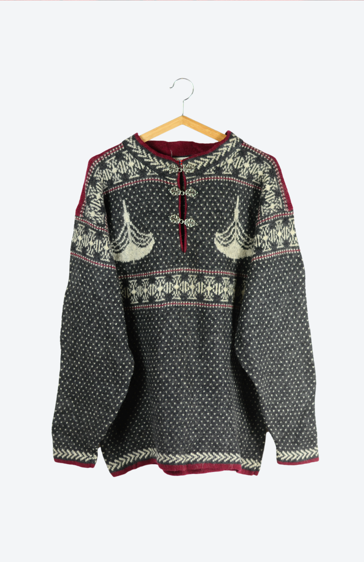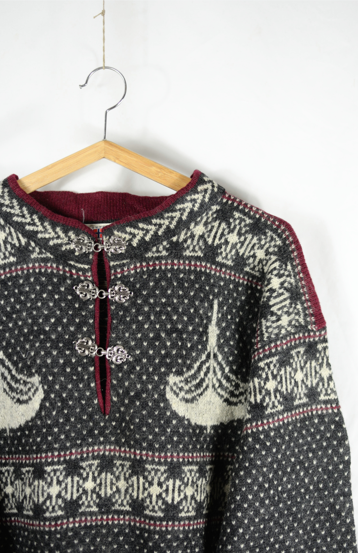 Čistě vlněný norský svetr. Má silnější teplý úplet, tmavě červený detail a originální vzory. U krku zapínání na zdobené kovové háčky. Unisex kousek.