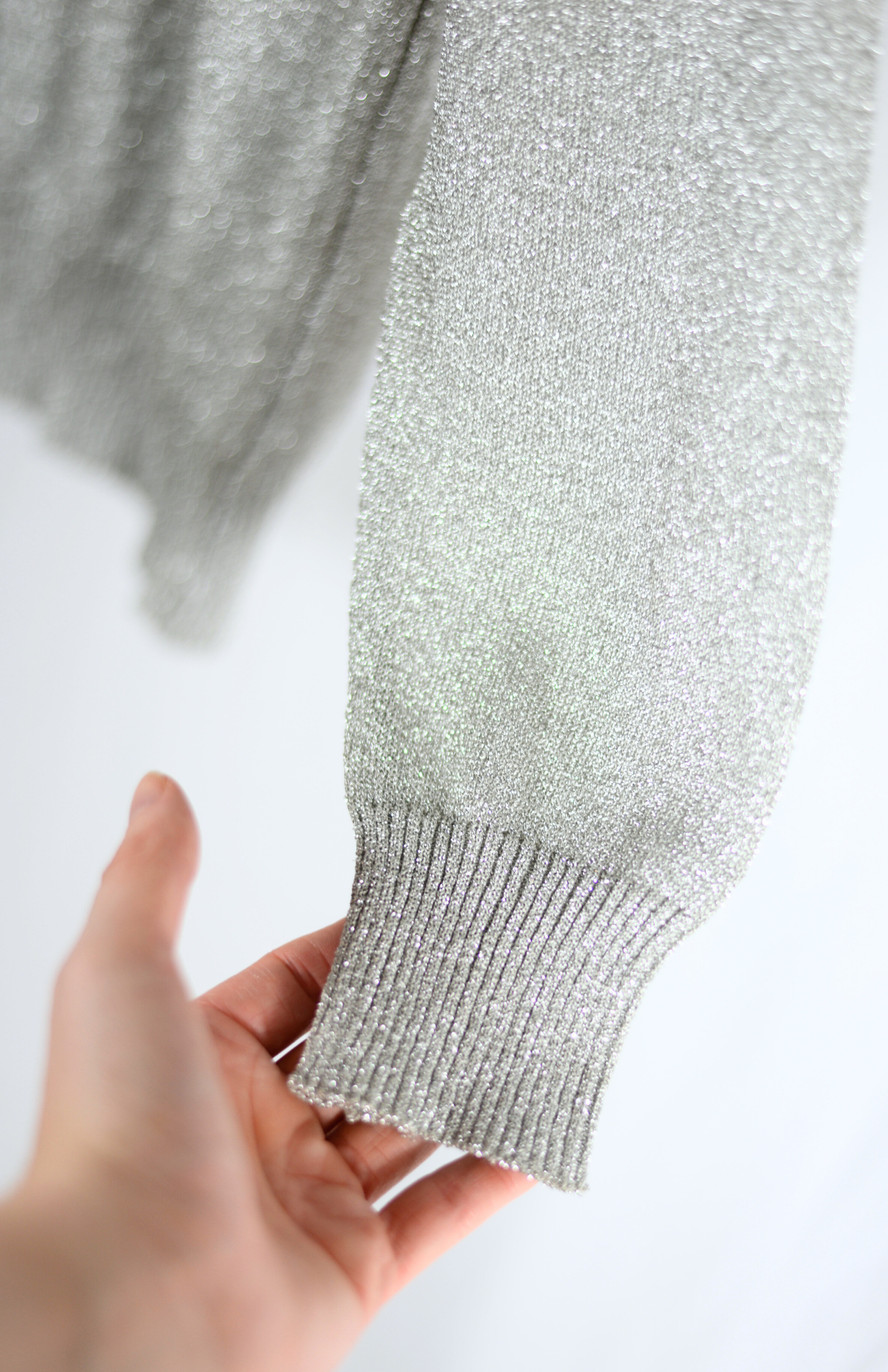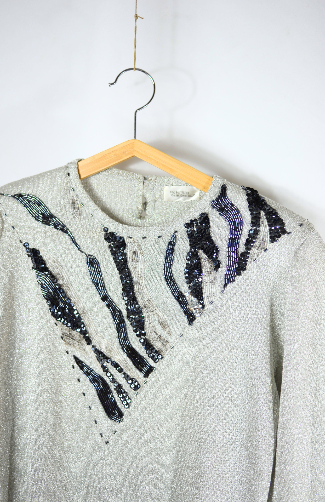 Stříbrný retro svetr s korálky vyšívaným motivem. Příjemný lehčí kousek s výrazným třpytem. Má jemně nabíraný rukáv. Stav: Ve skvělém stavu, bez vad.Materiál: 65% polyester, 35% rayonmetalic