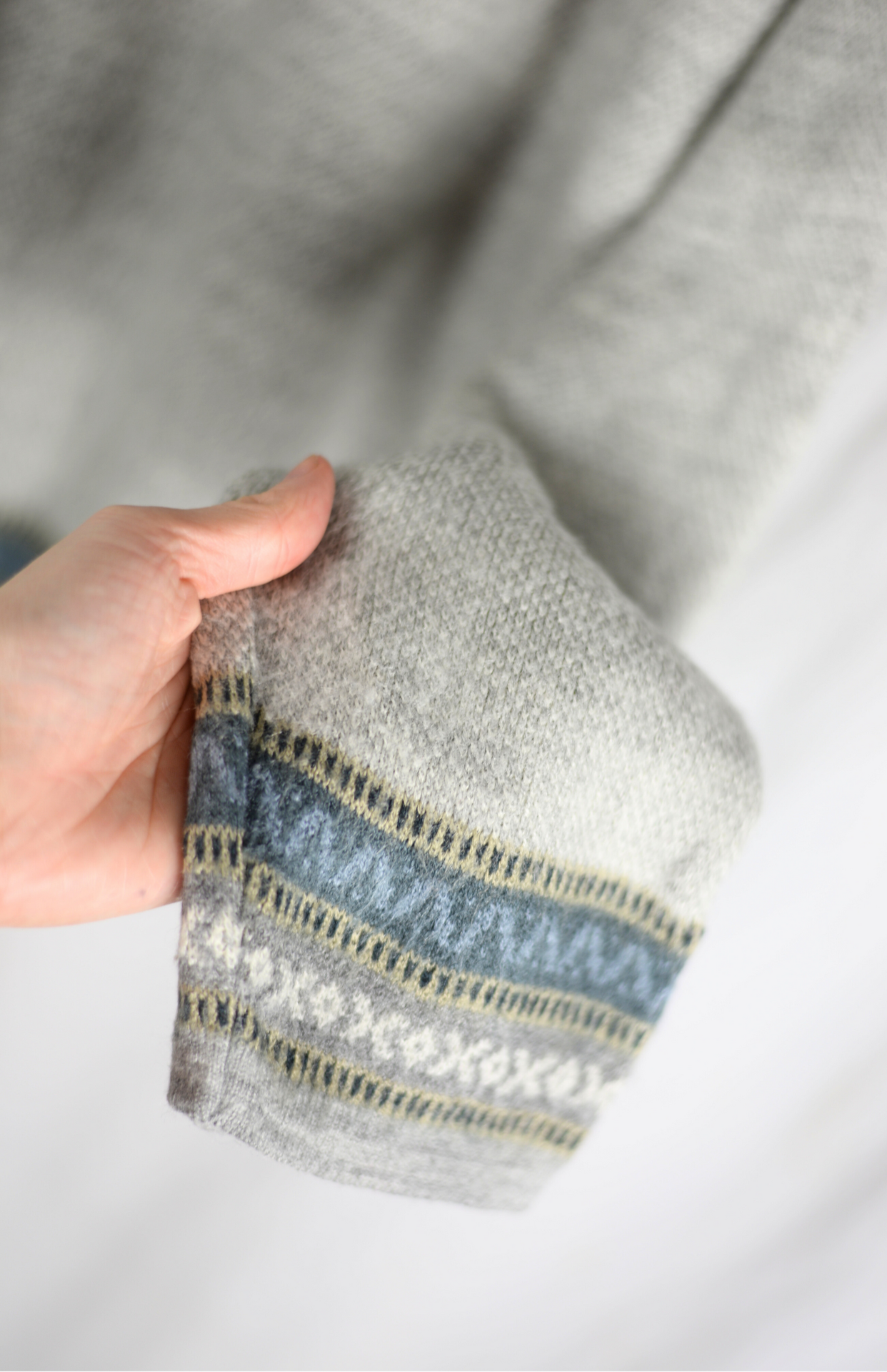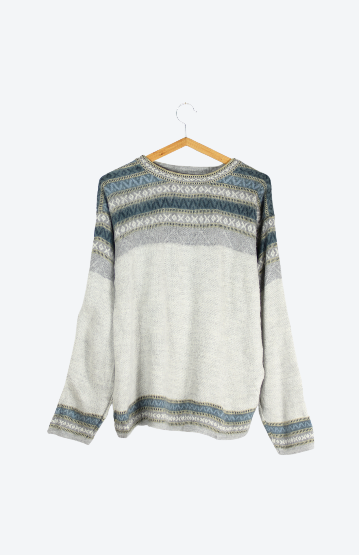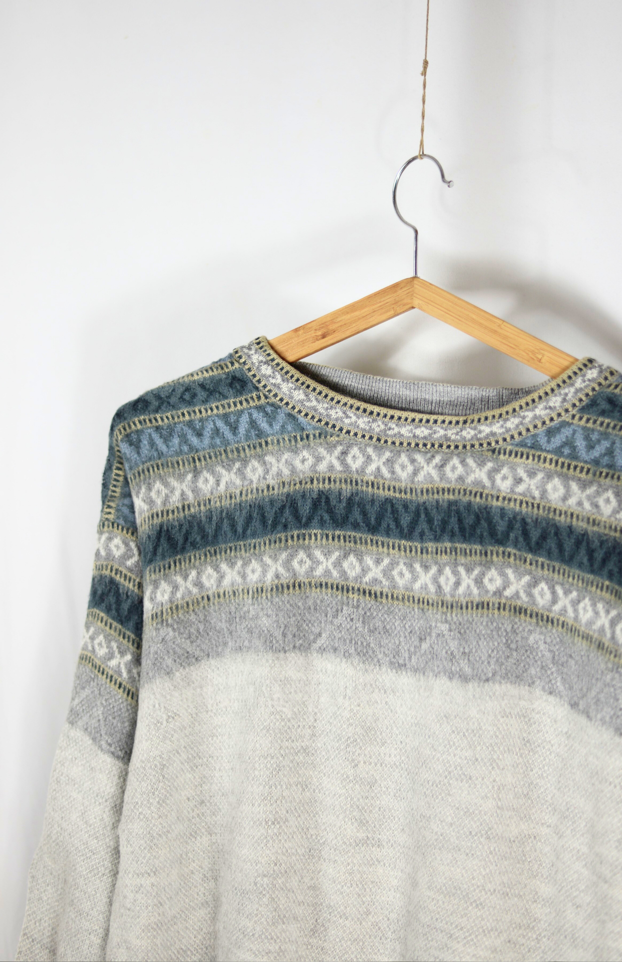 Vintage svetr s decentním vzorem na okrajích. Moc příjemný na omak. Středně silný úplet a volnější střih.Stav: Vintage kousek v perfektním stavu, bez vad.