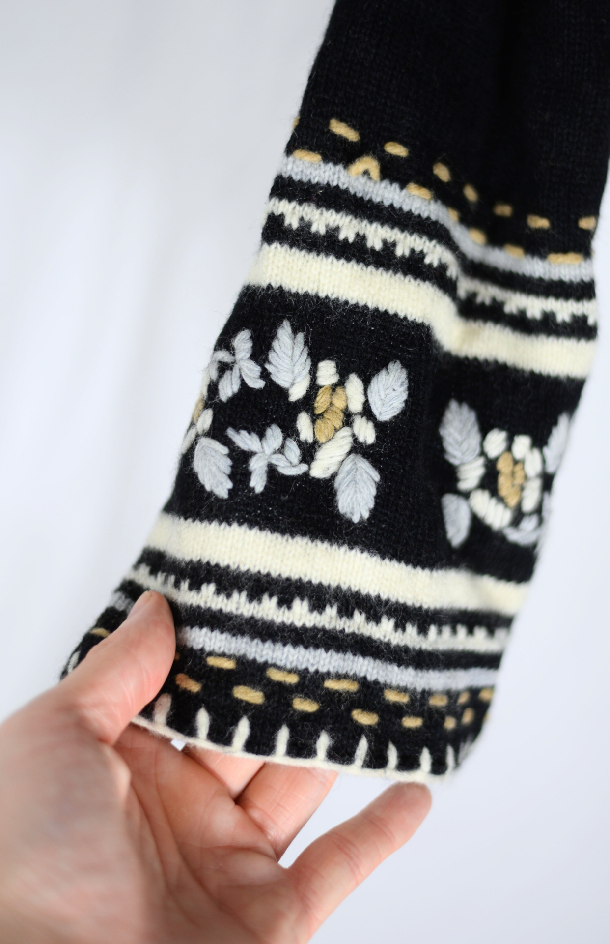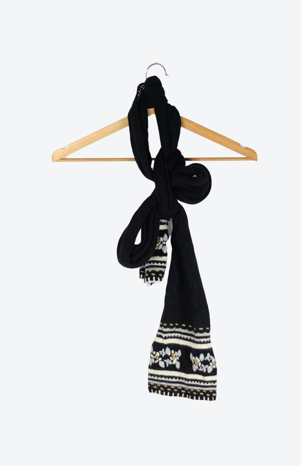 Originání tenká a super dlouhá šála z ovčí vlny. Má bílý lem a na koncích silnou výšivku s květinami. Velmi povedený kousek.