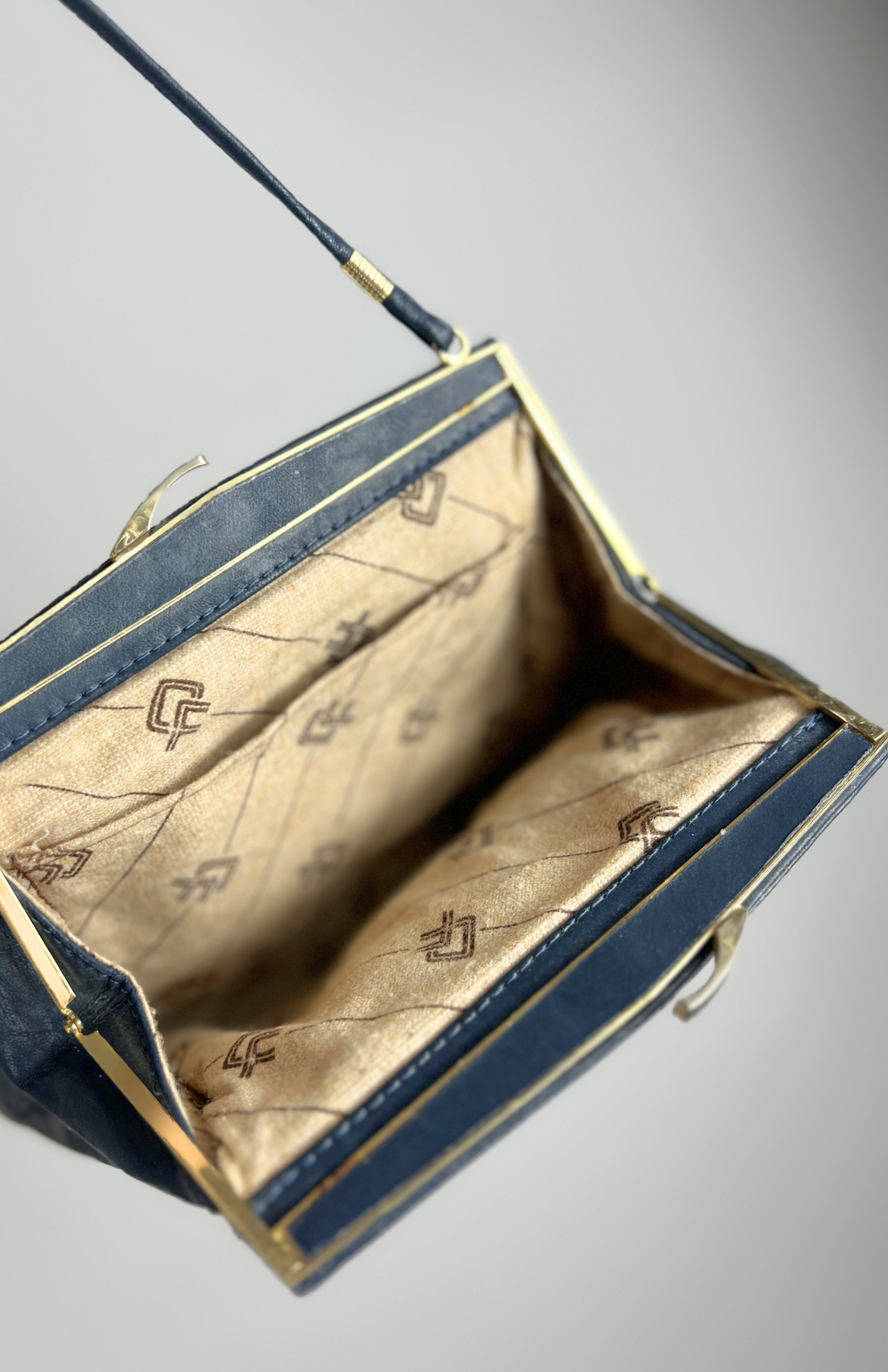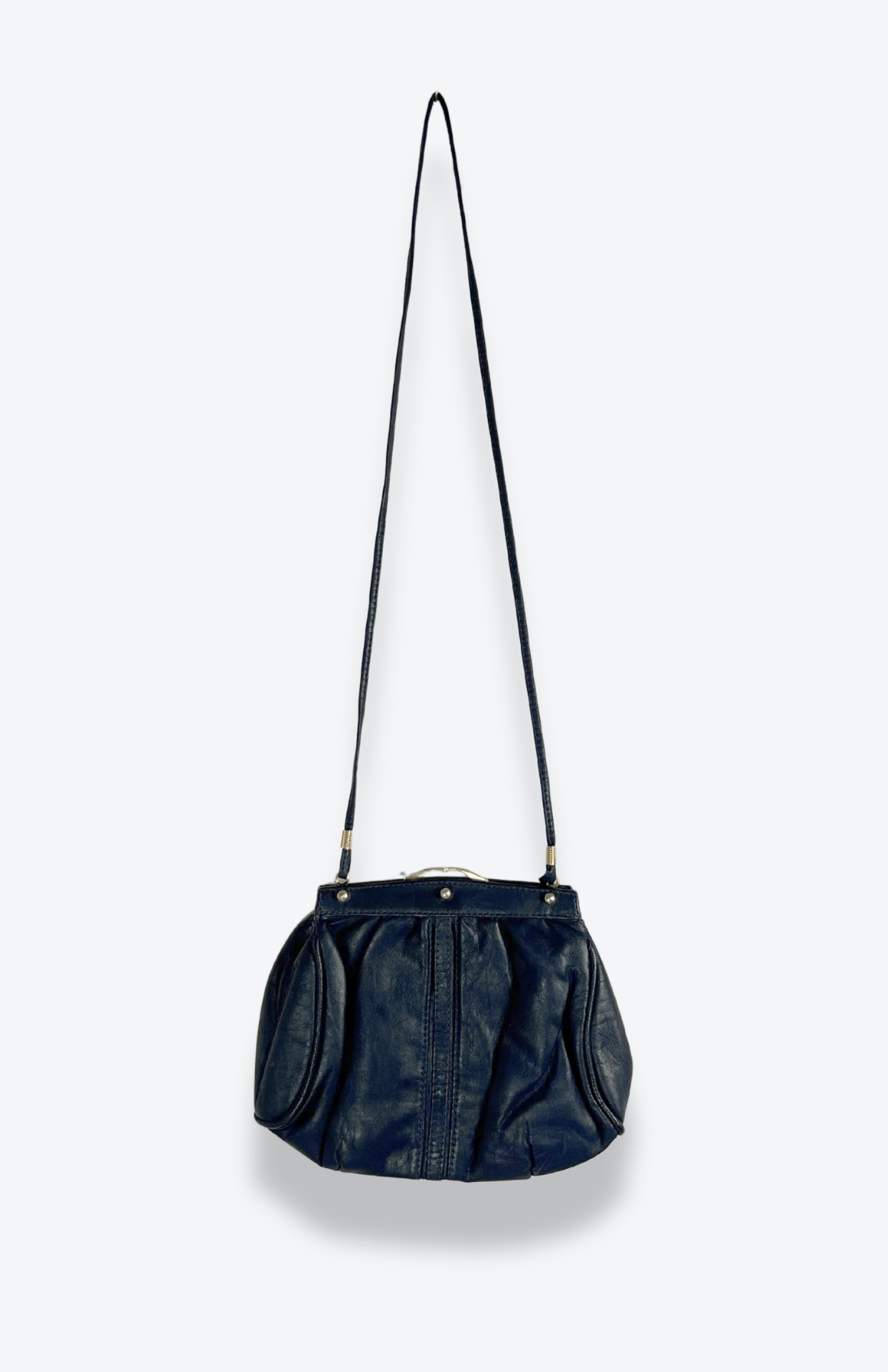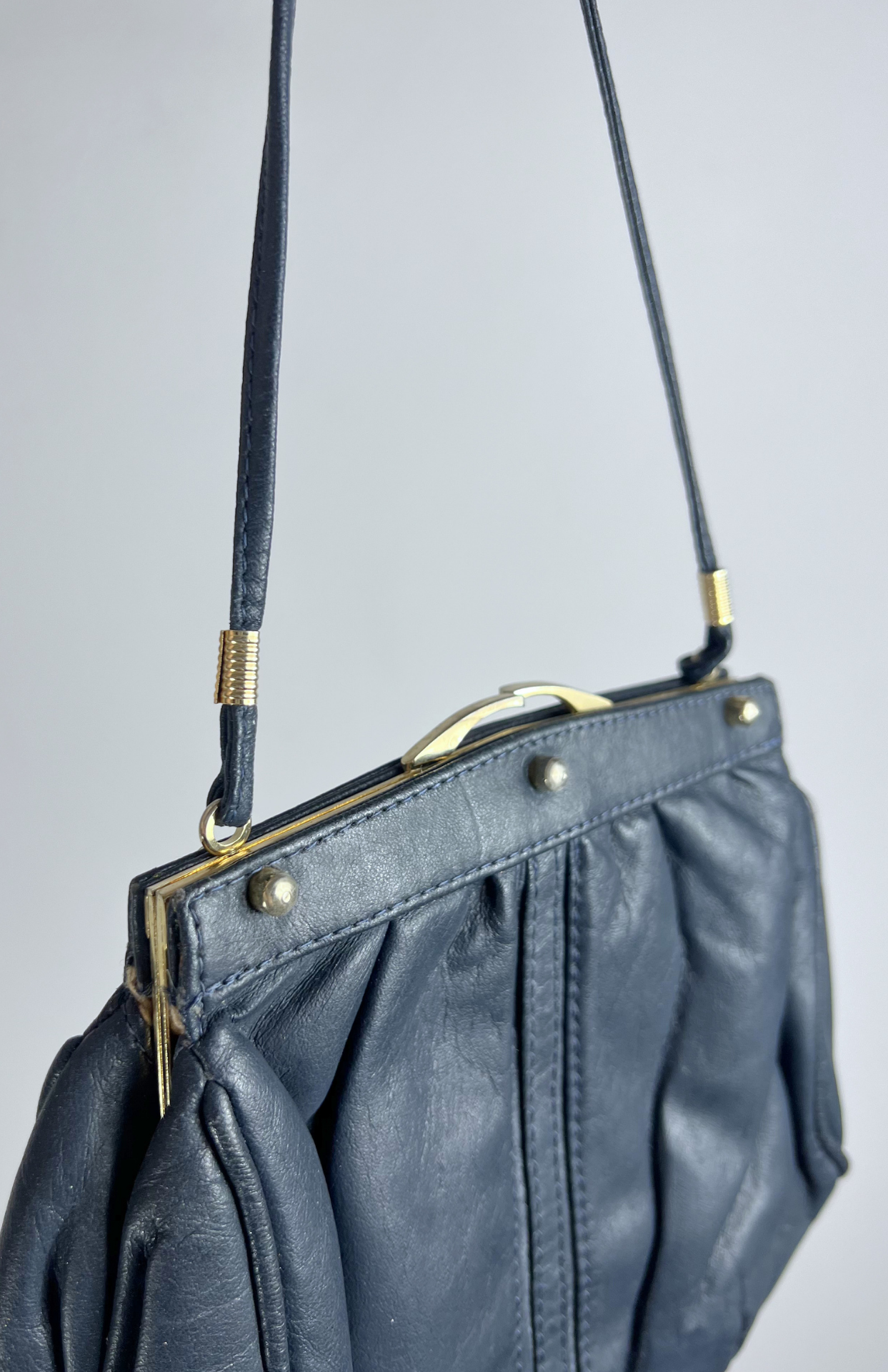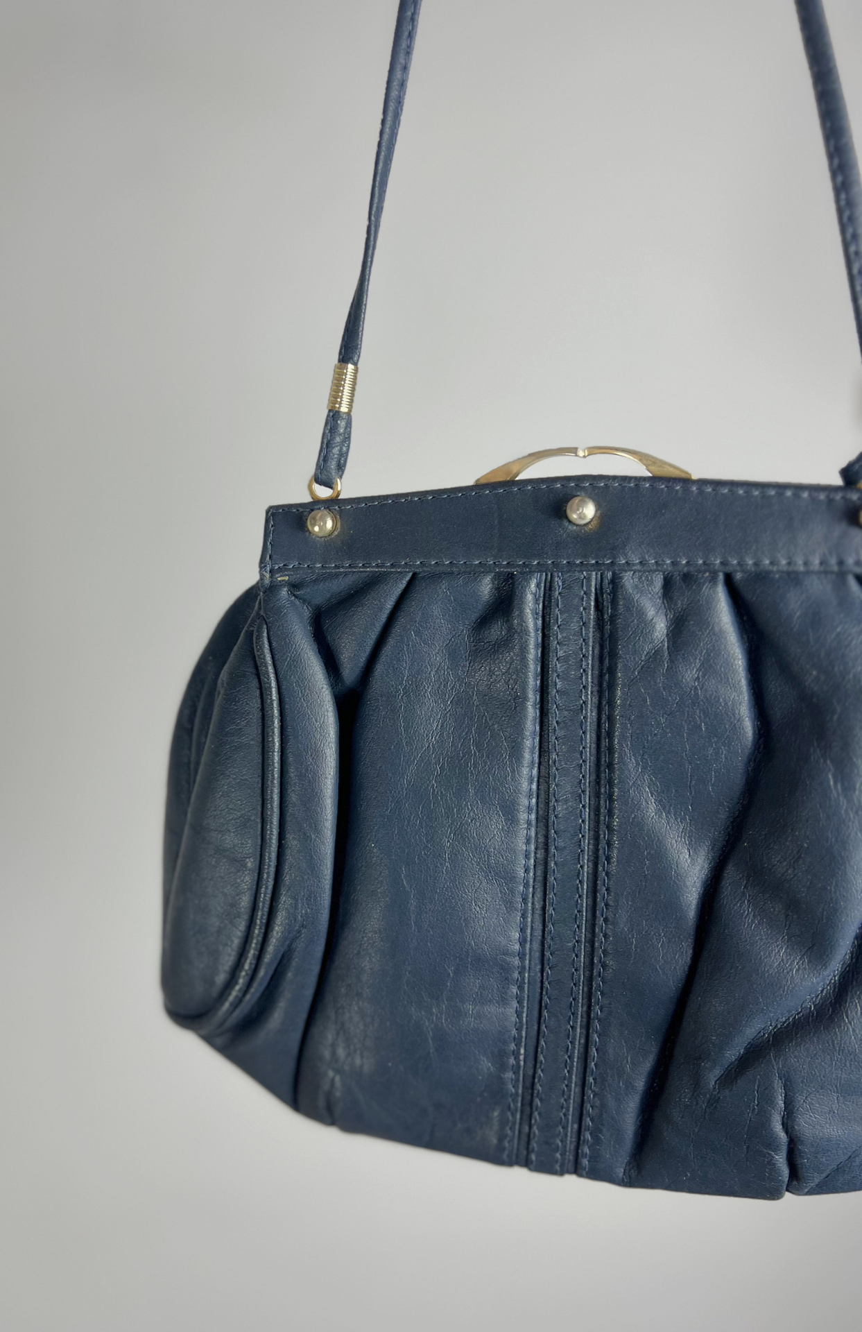 Tmavě modrá vintage kožená kabelka. Má zacvakávací zapínání a dlouhý tenký popruh.