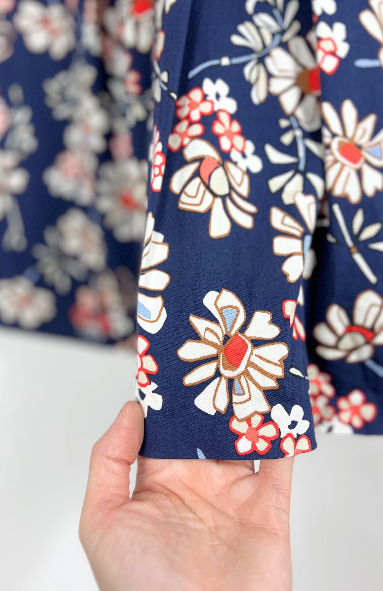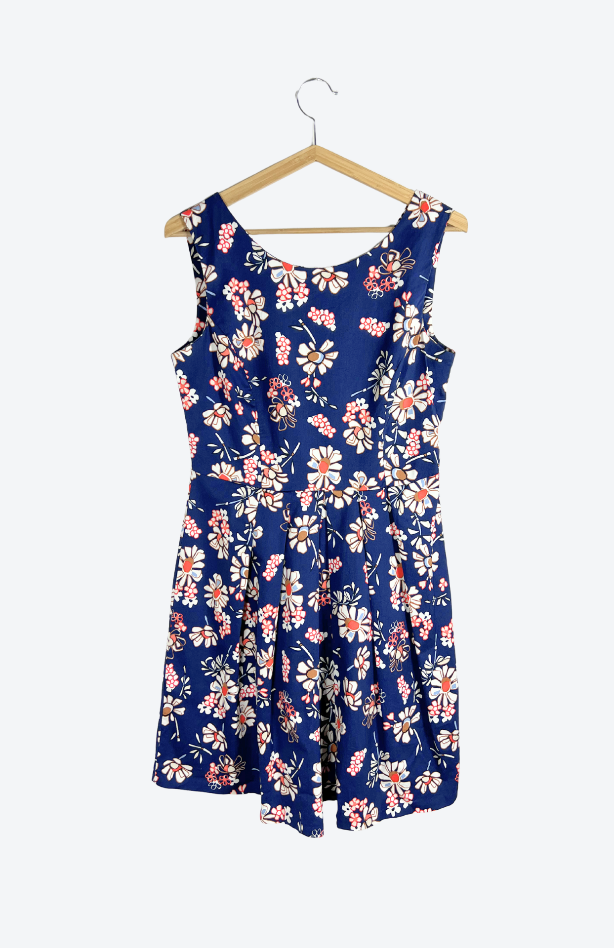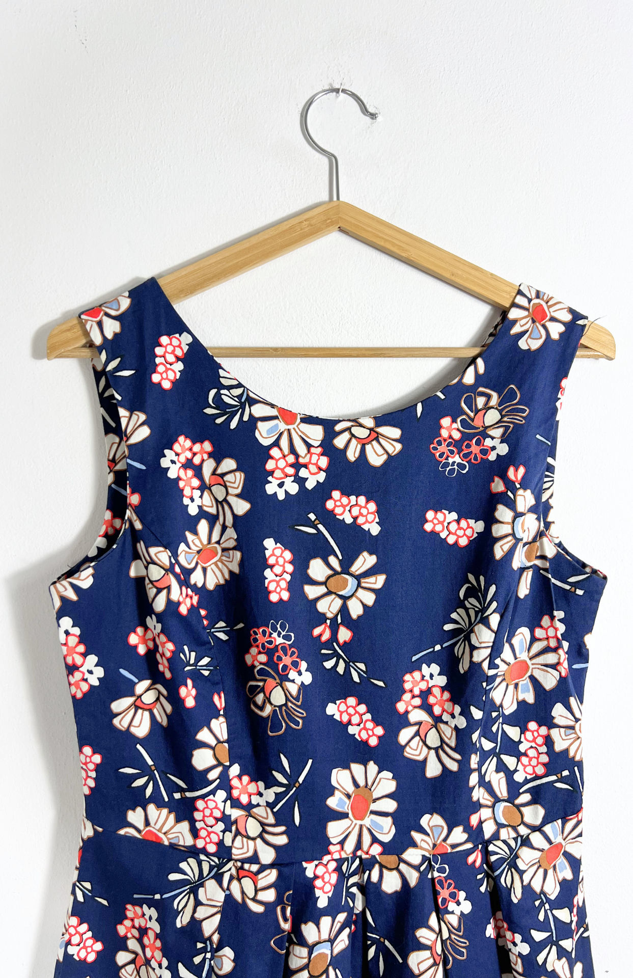 Tmavě modré květinové retro šaty. Silnější bavlněné plátno. Vzadu mají zip a vykrojený výstřih do véčka. Skládaná sukně, pěkně zpracovaný vintage kousek.