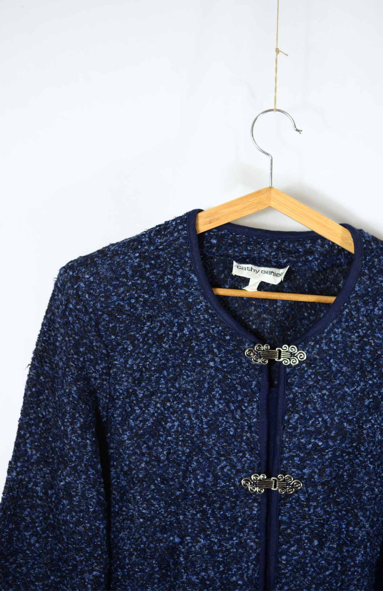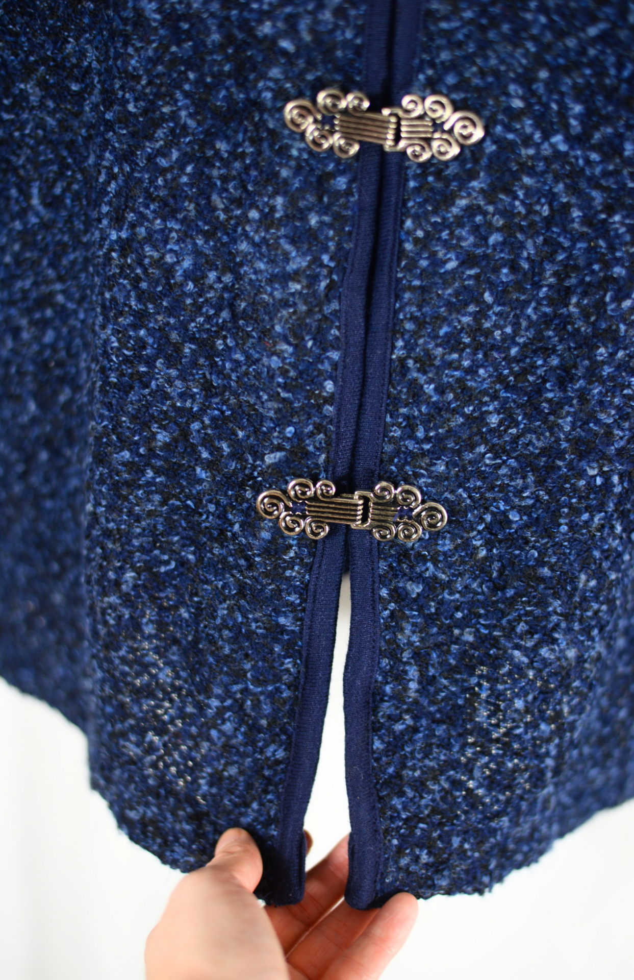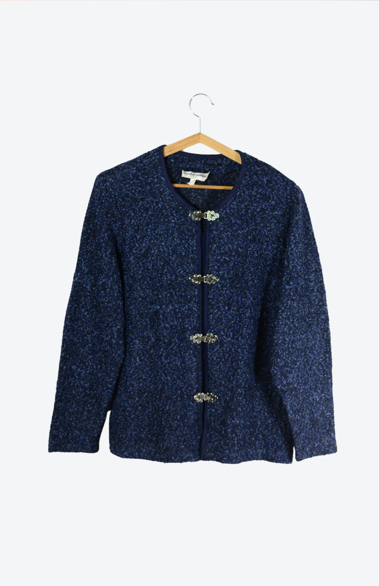Tmavě modrý žíhaný norský svetr se zdobenými háčky po celé své délce. Má lehčí úplet s barevným žíháním.Stav: Ve skvělém stavu, bez vad.Materiál: 100% vlna, 50% akryl
