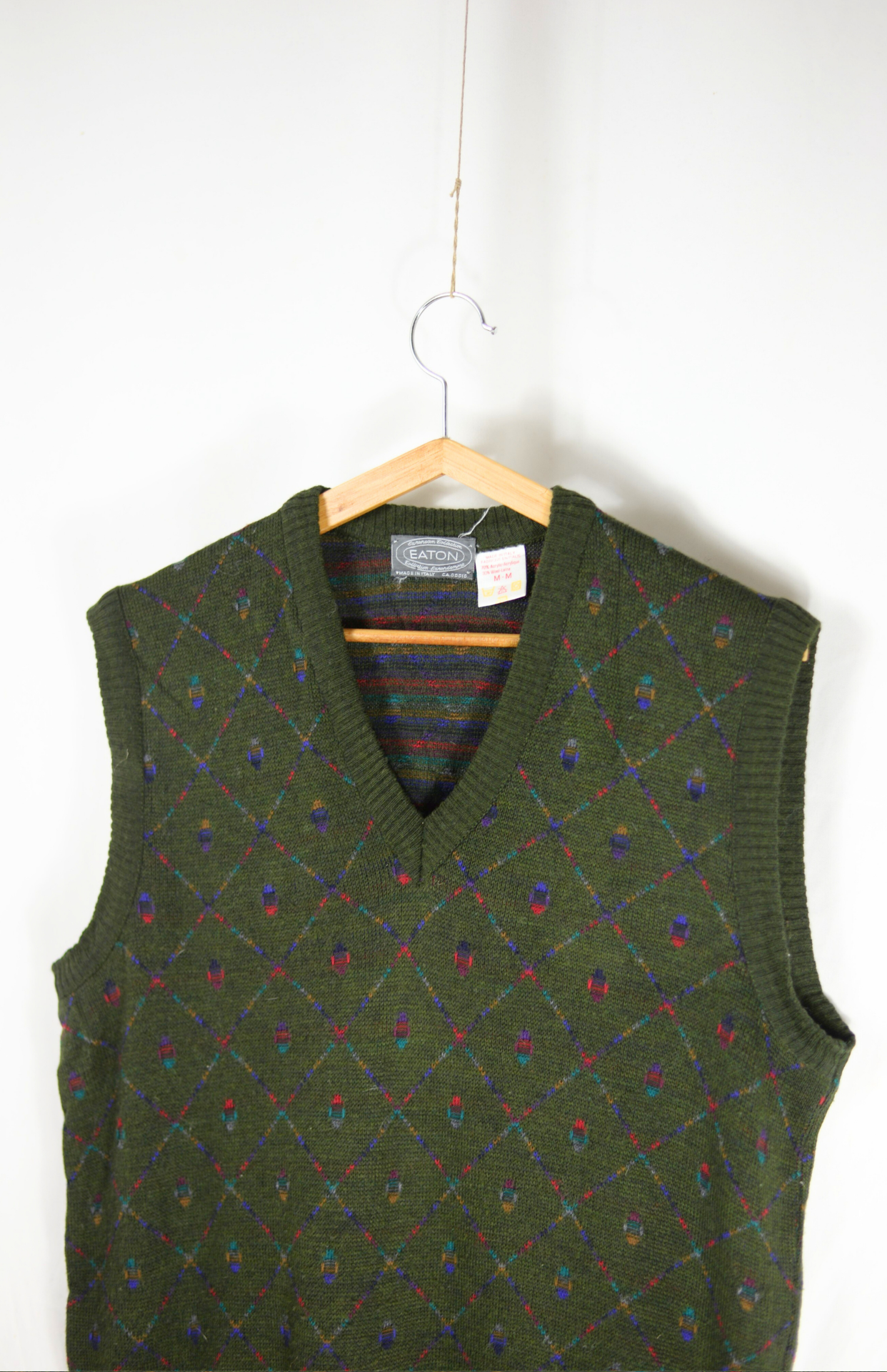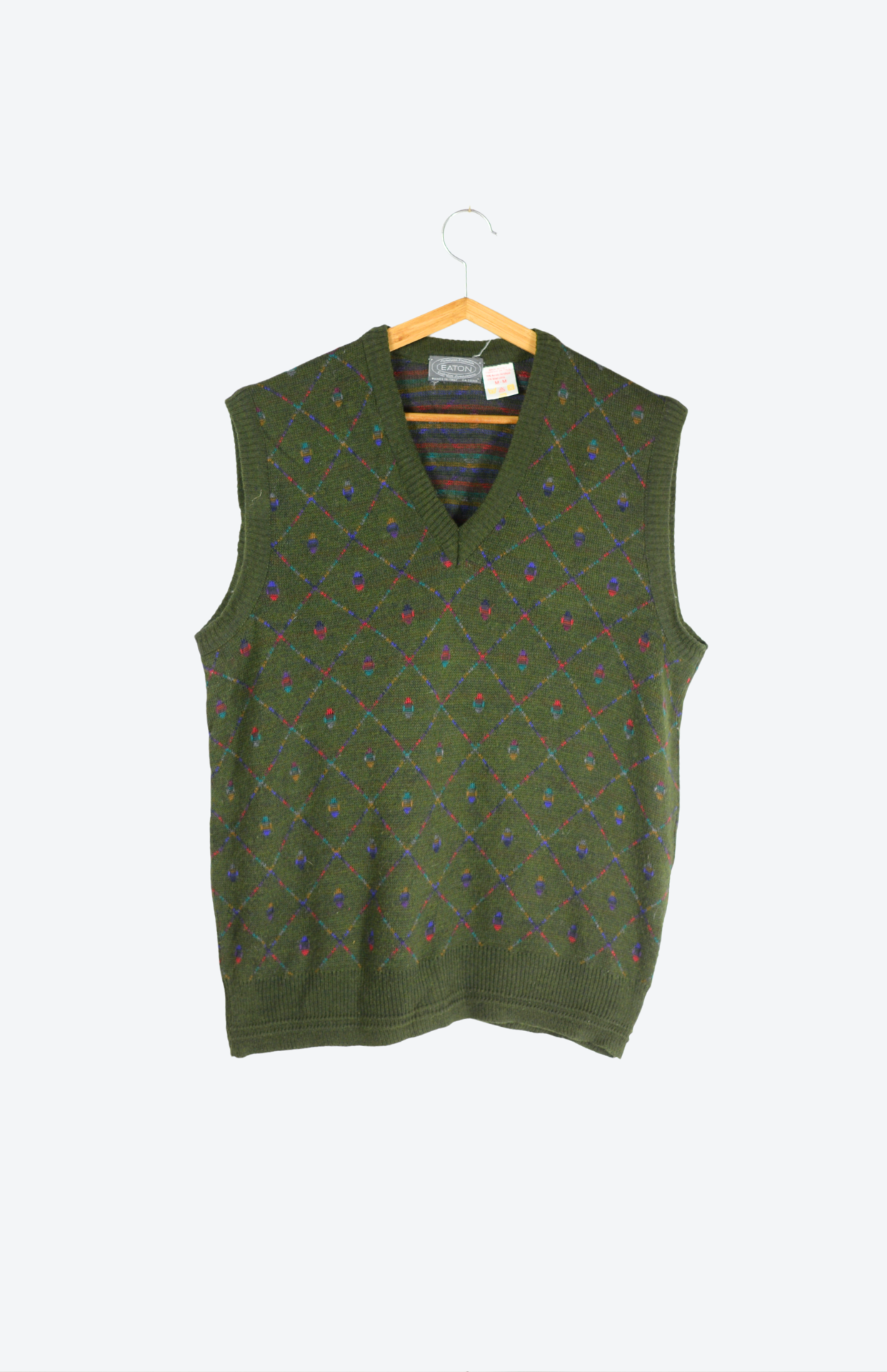 Tmavě zelená vesta s drobným barevným vzorem. Unisex střih, pěkně zpracovaná.