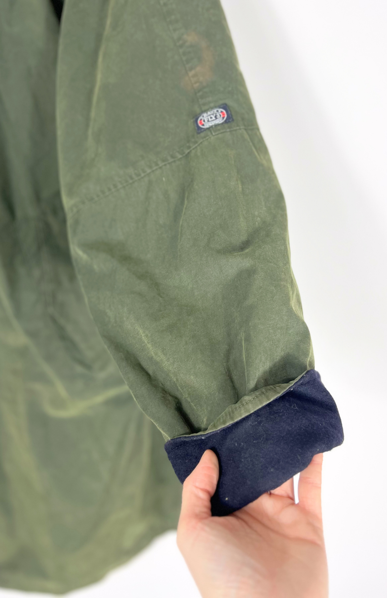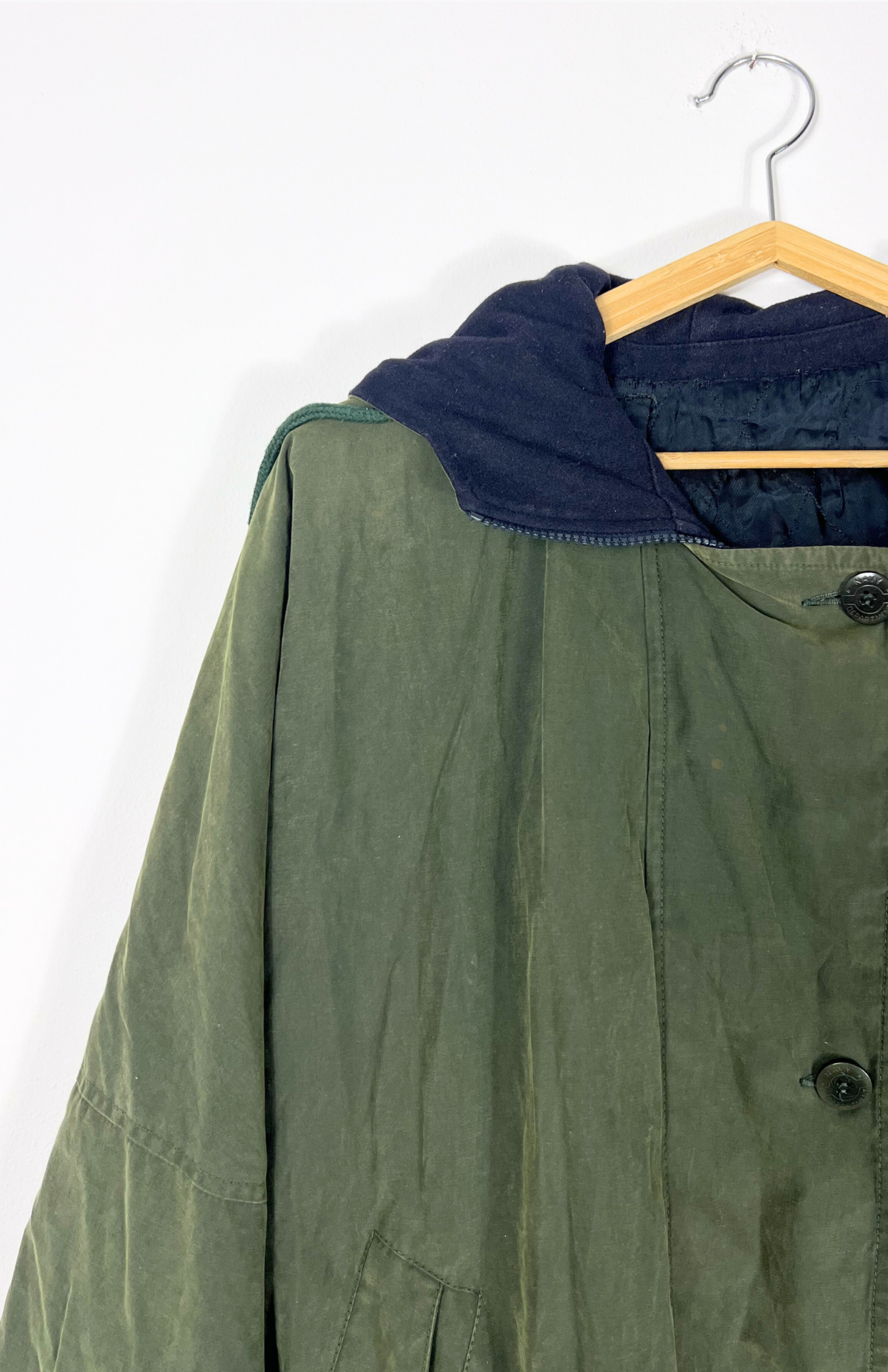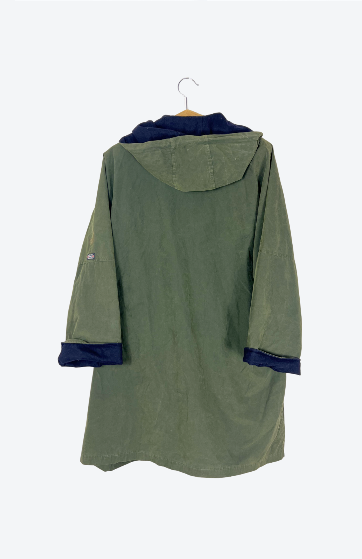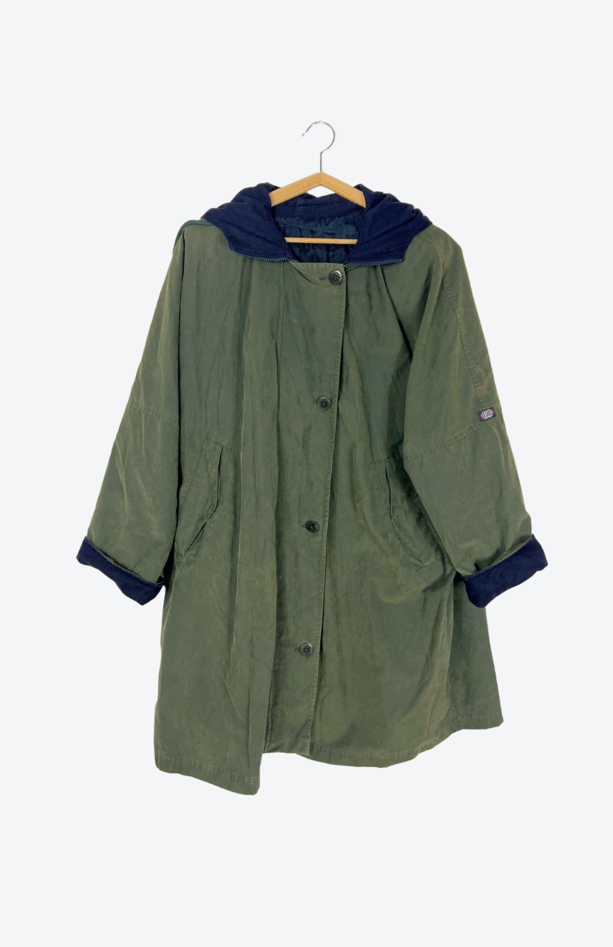 Tmavě zelený retro kabát. Má kapuci a zapínání na zip a knoflíky. Lehce zateplený kousek s prošívanou podšívkou. Delší střih, na omak ze semišového textilu.
