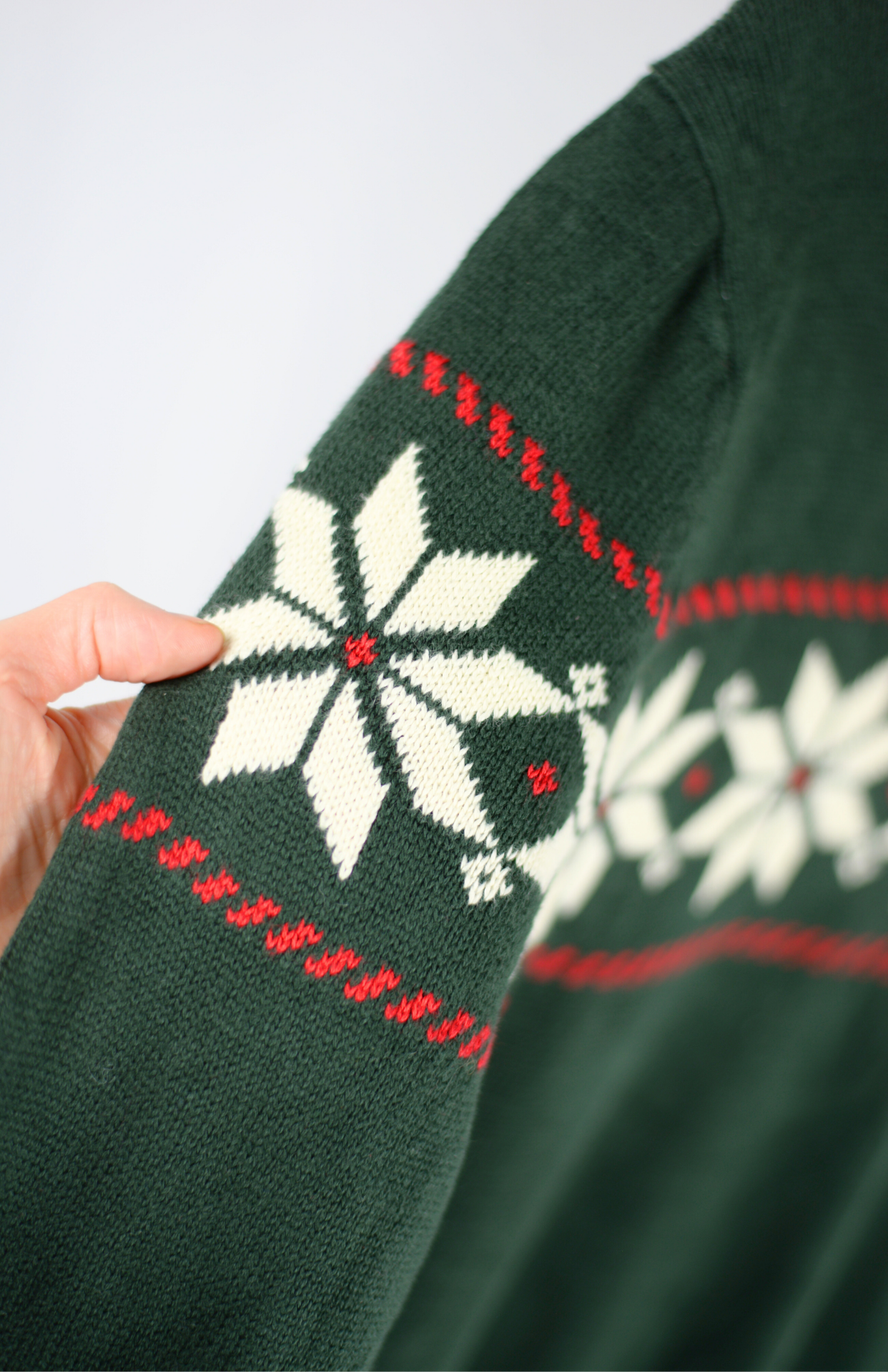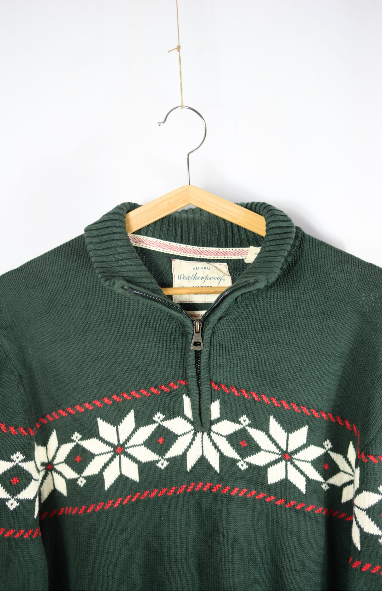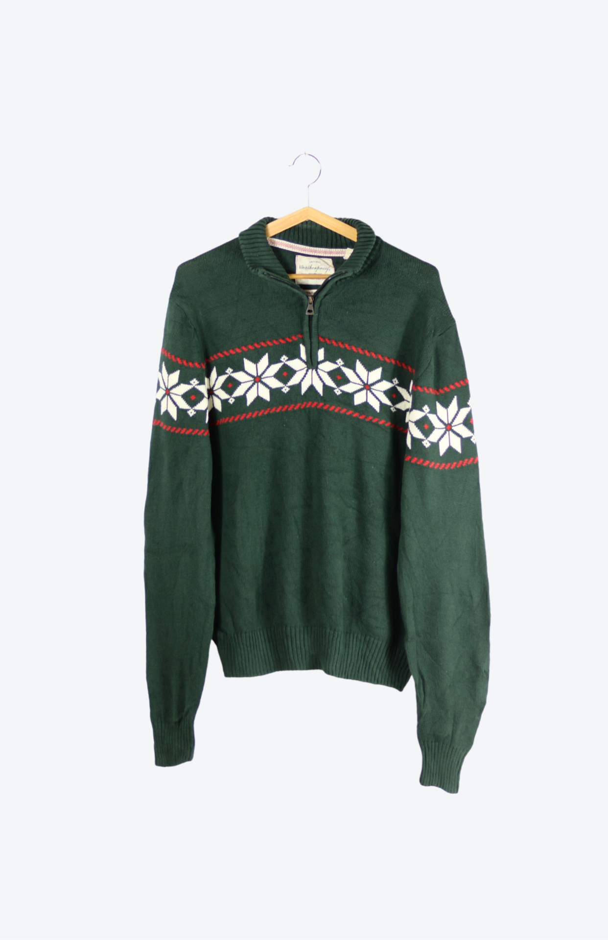 Vintage svetr se zimním vzorem. Má lehce nabíraný rukáv, rozhalenku na zip a středně silný úplet. Pěkně zpracovaný. Unisex střih.