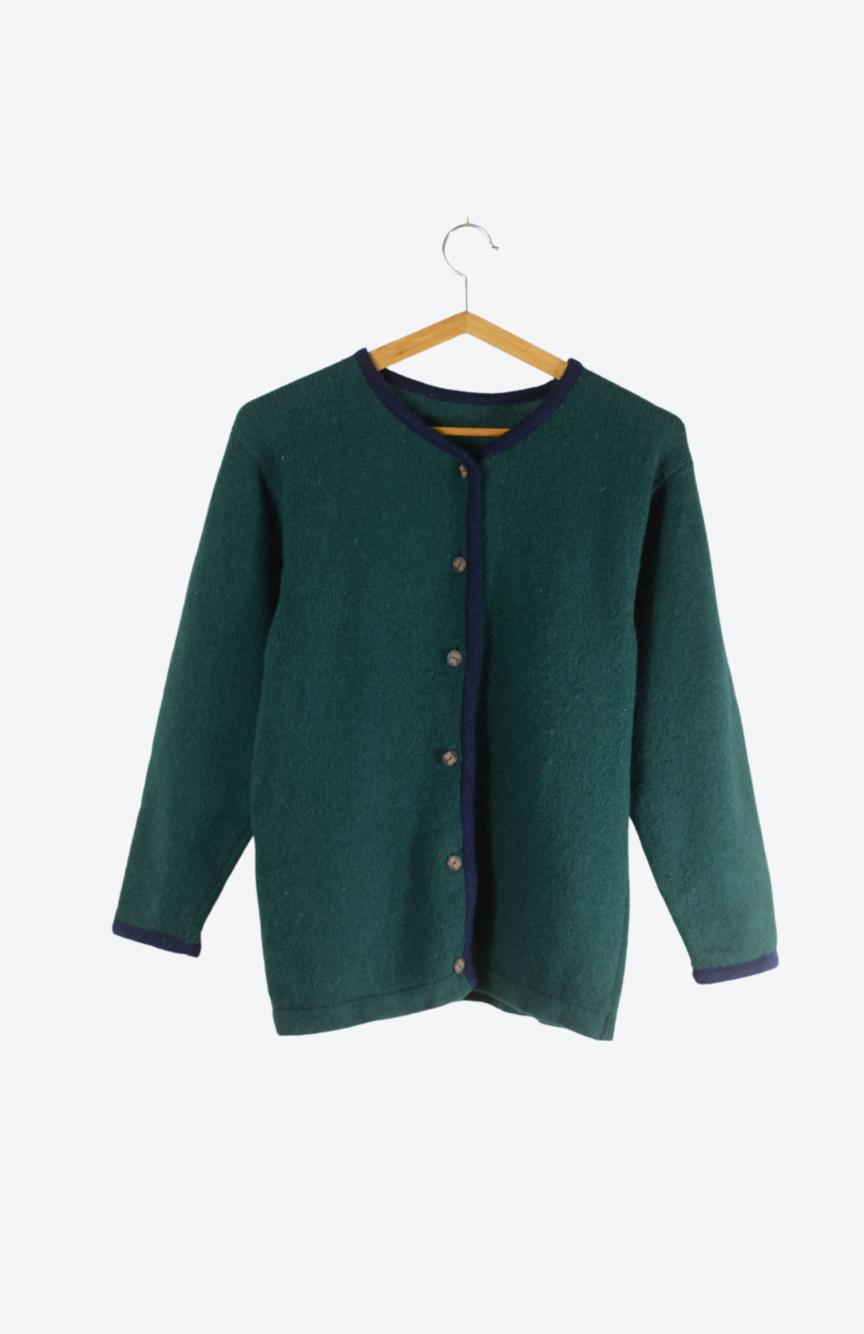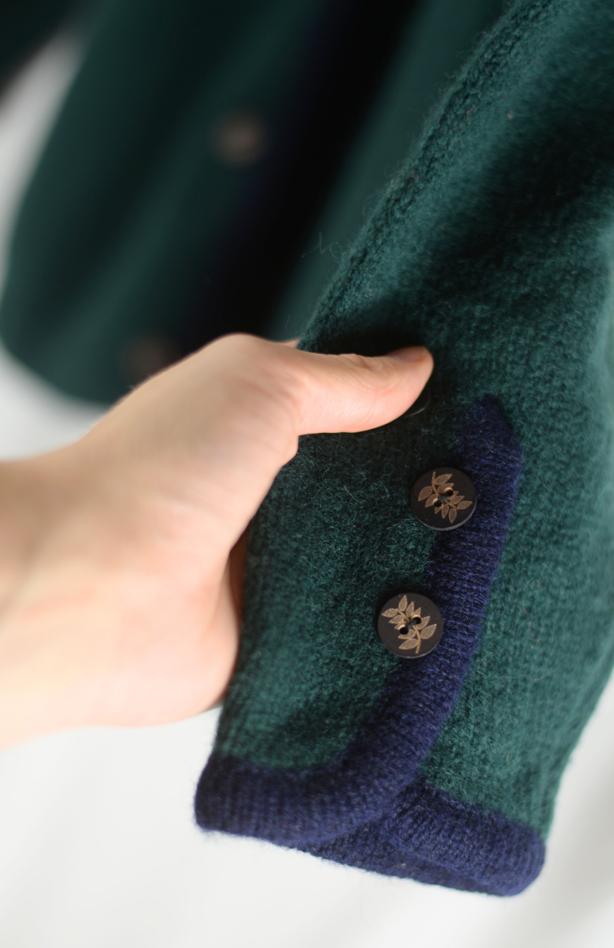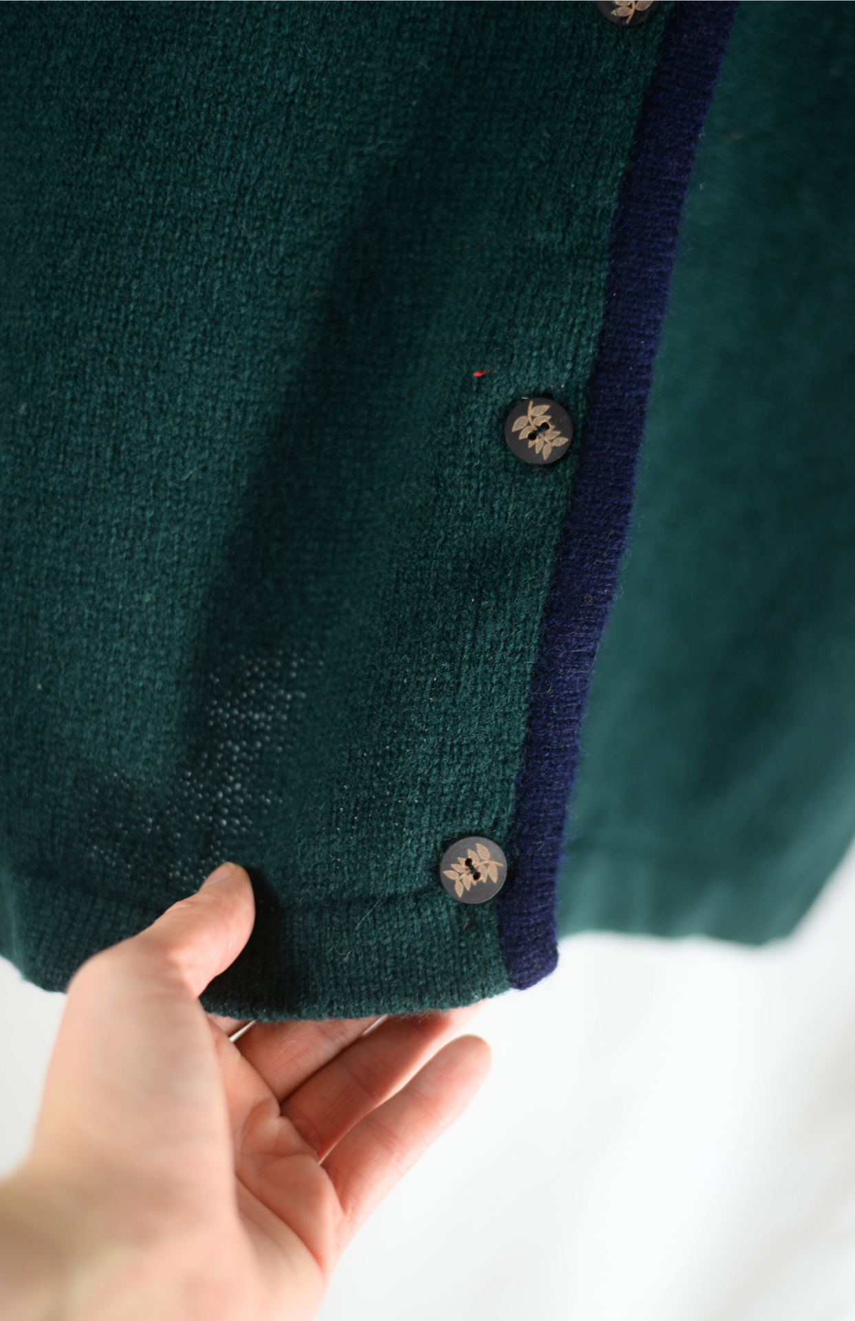 Tmavě zelený tyrolský svetr s dřevěnými knoflíčky a tmavě modrým lemem.