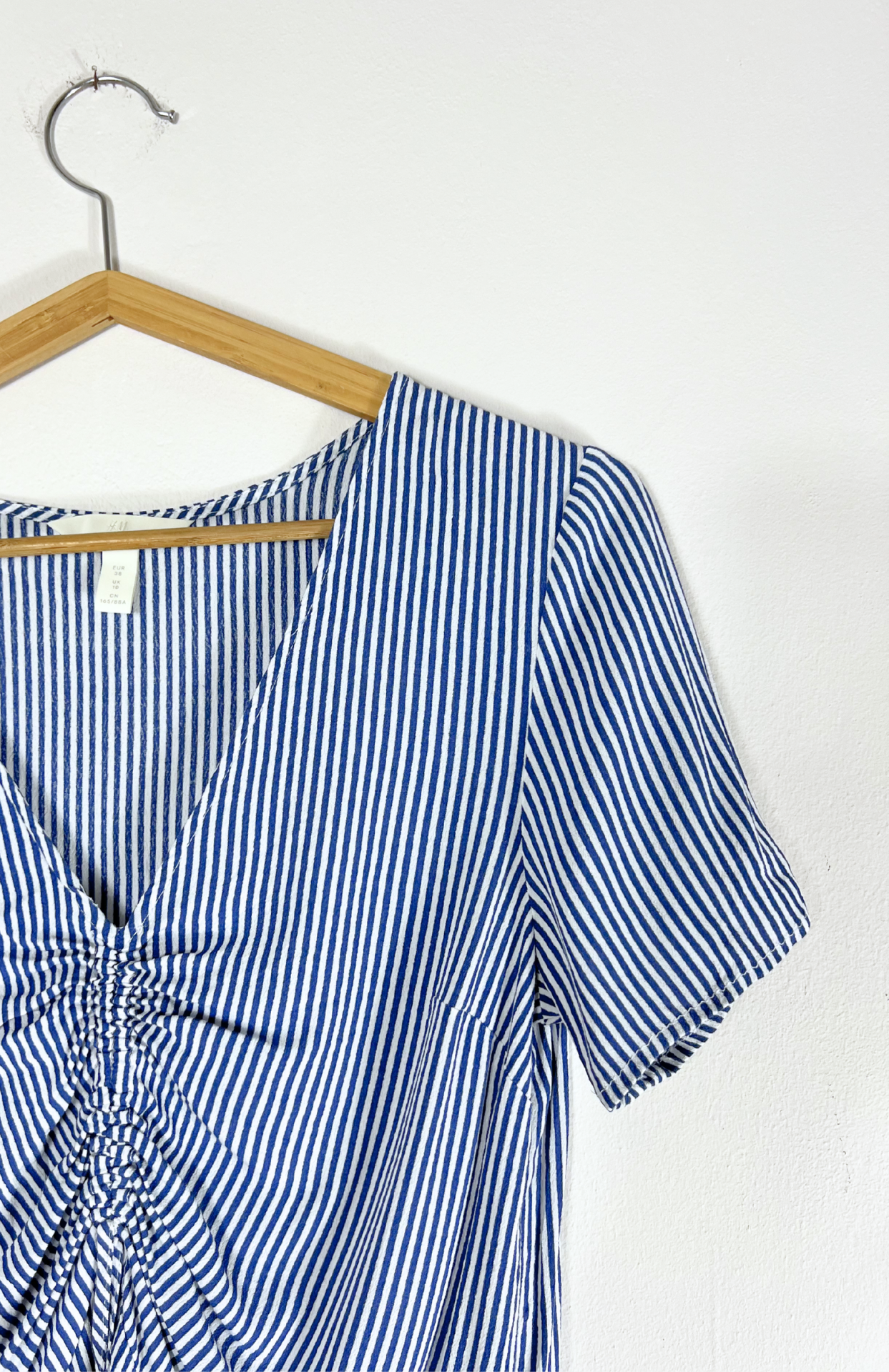 Top s modrým proužkem. Má volánek na spodním lemu a řasení se stahovací šňůrkou na středu.