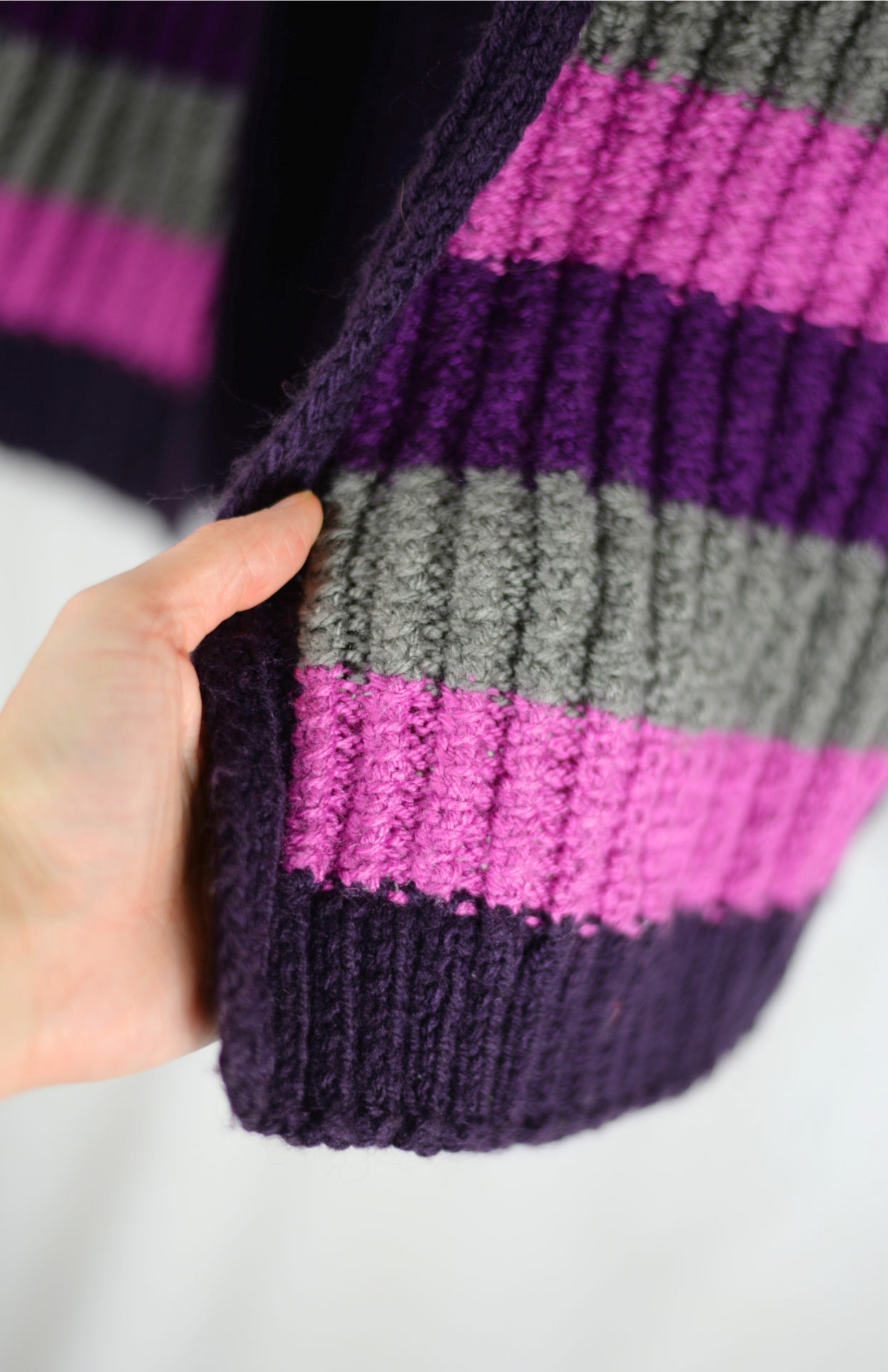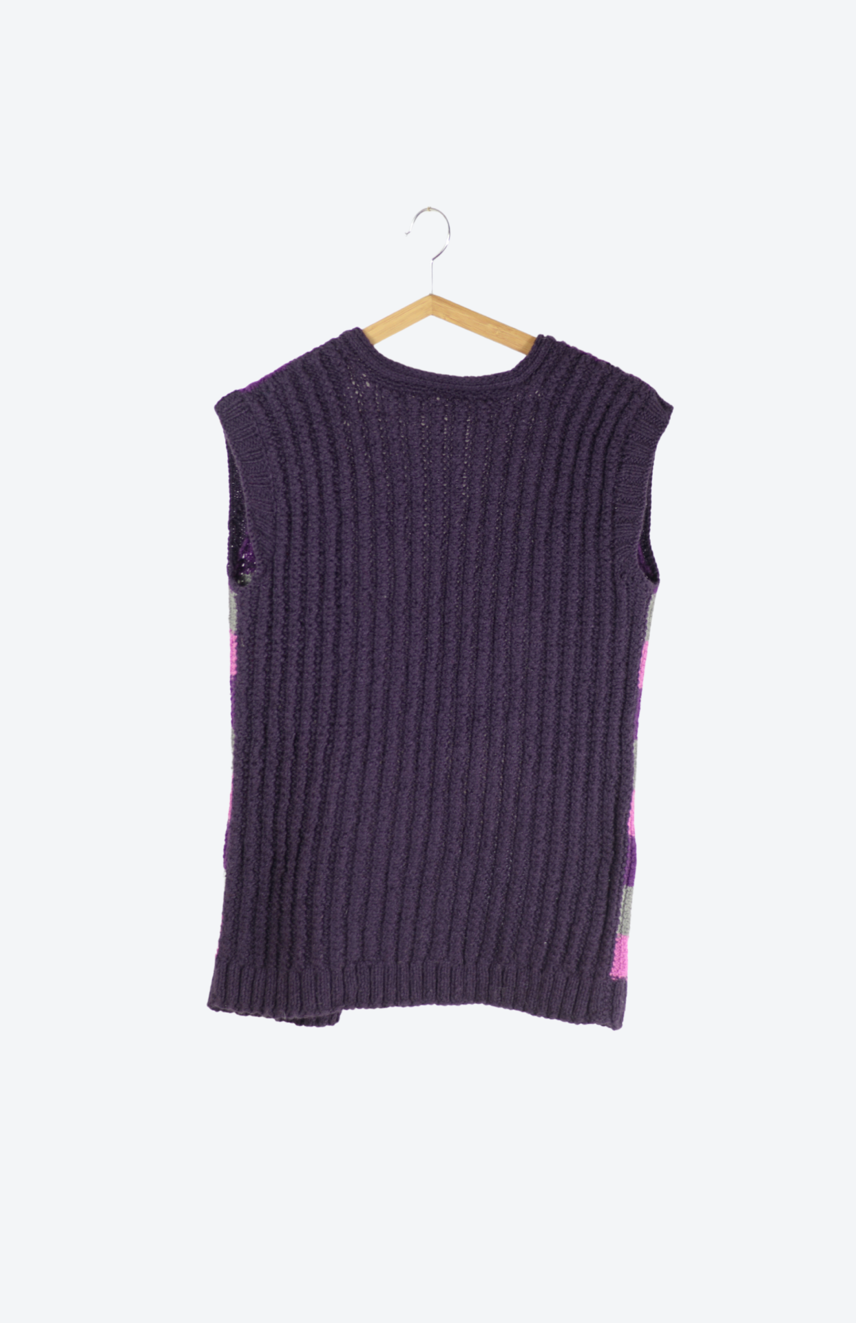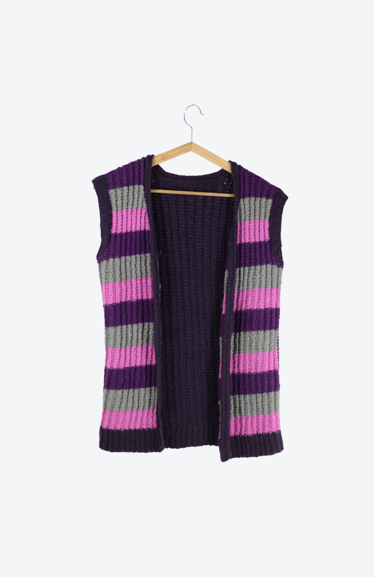 Silná pletená retro vesta s barevnými proužky. Má hrubší vzor a střih bez zapínání.