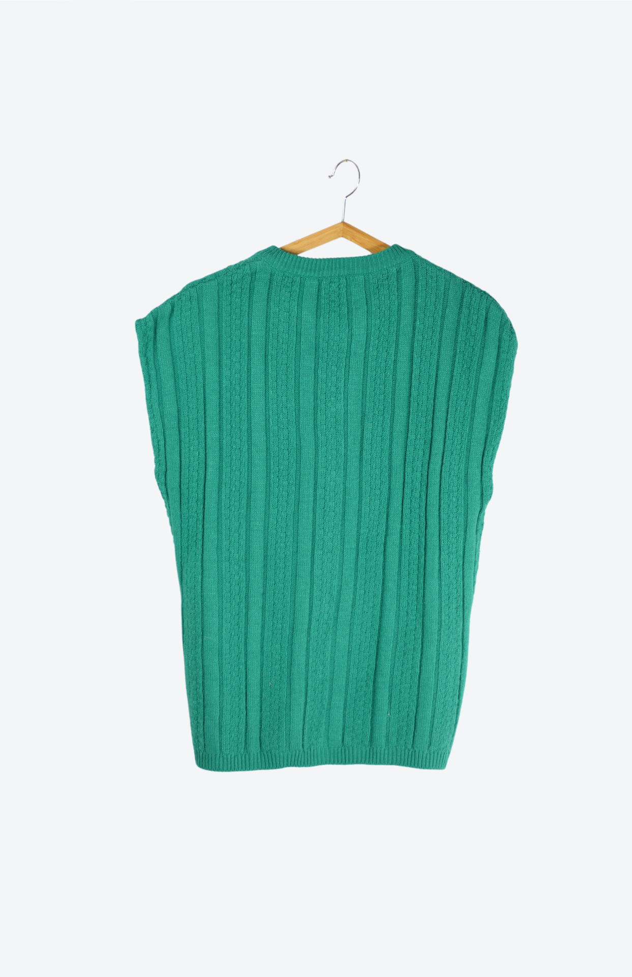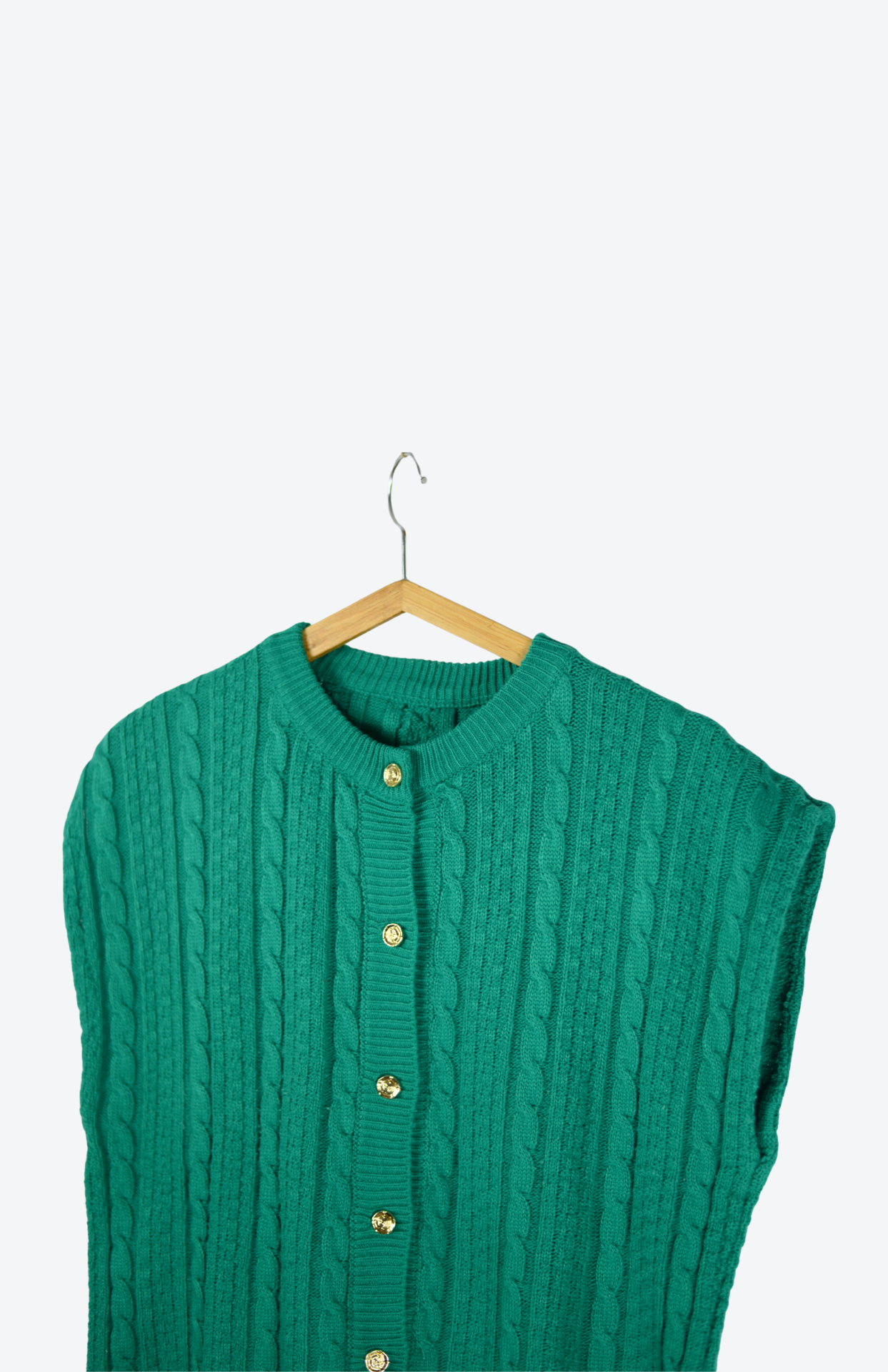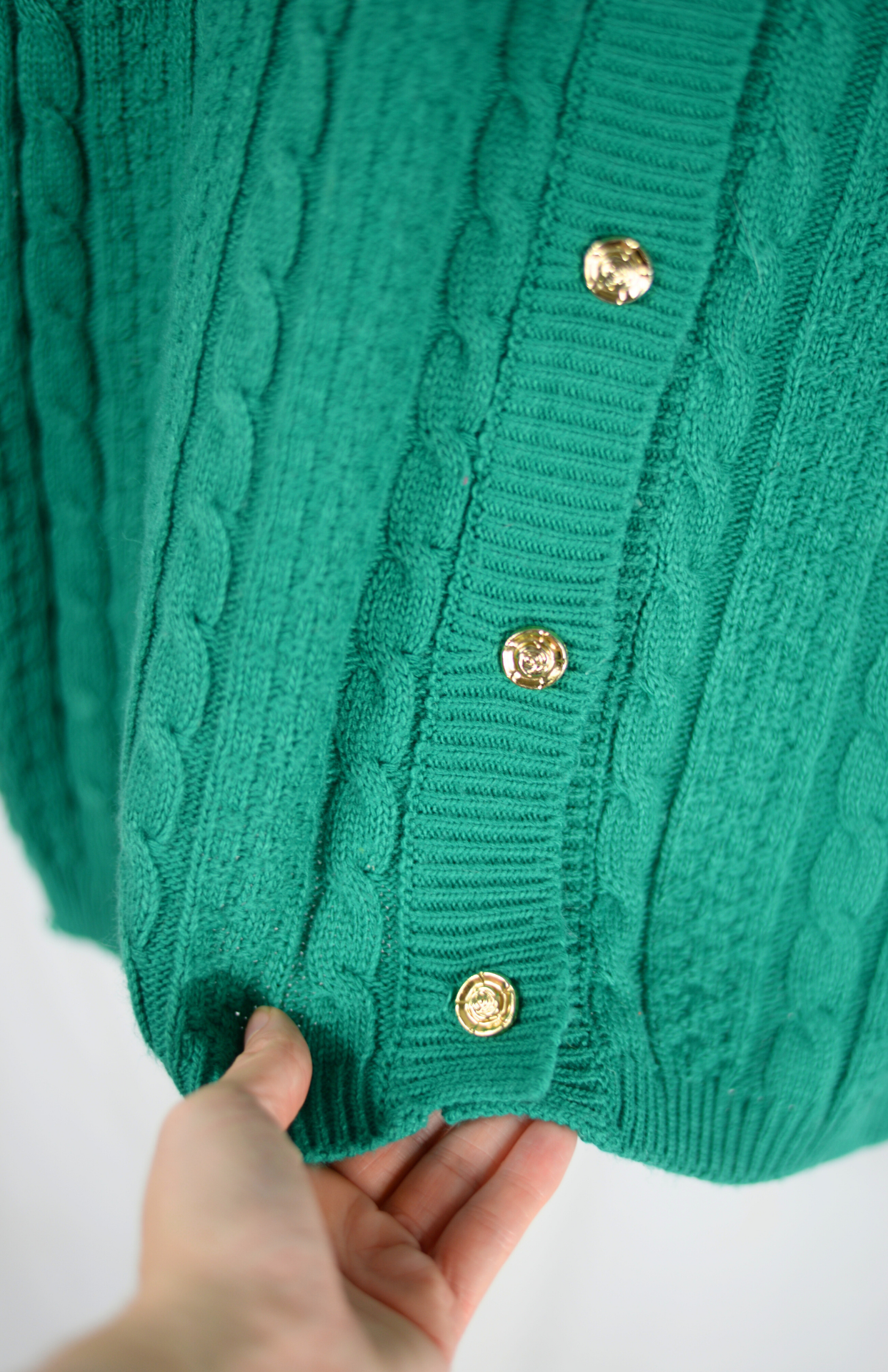 Sytě zelená vlněná vesta s copánkovým vzorem. Má výrazné, zdobené zlaté knoflíky a delší střih. Středně silný úplet.