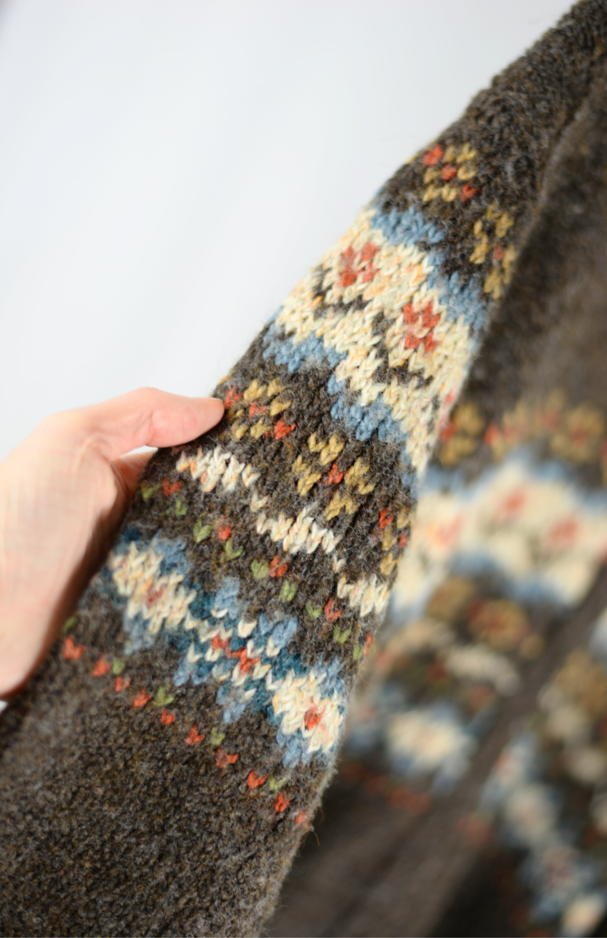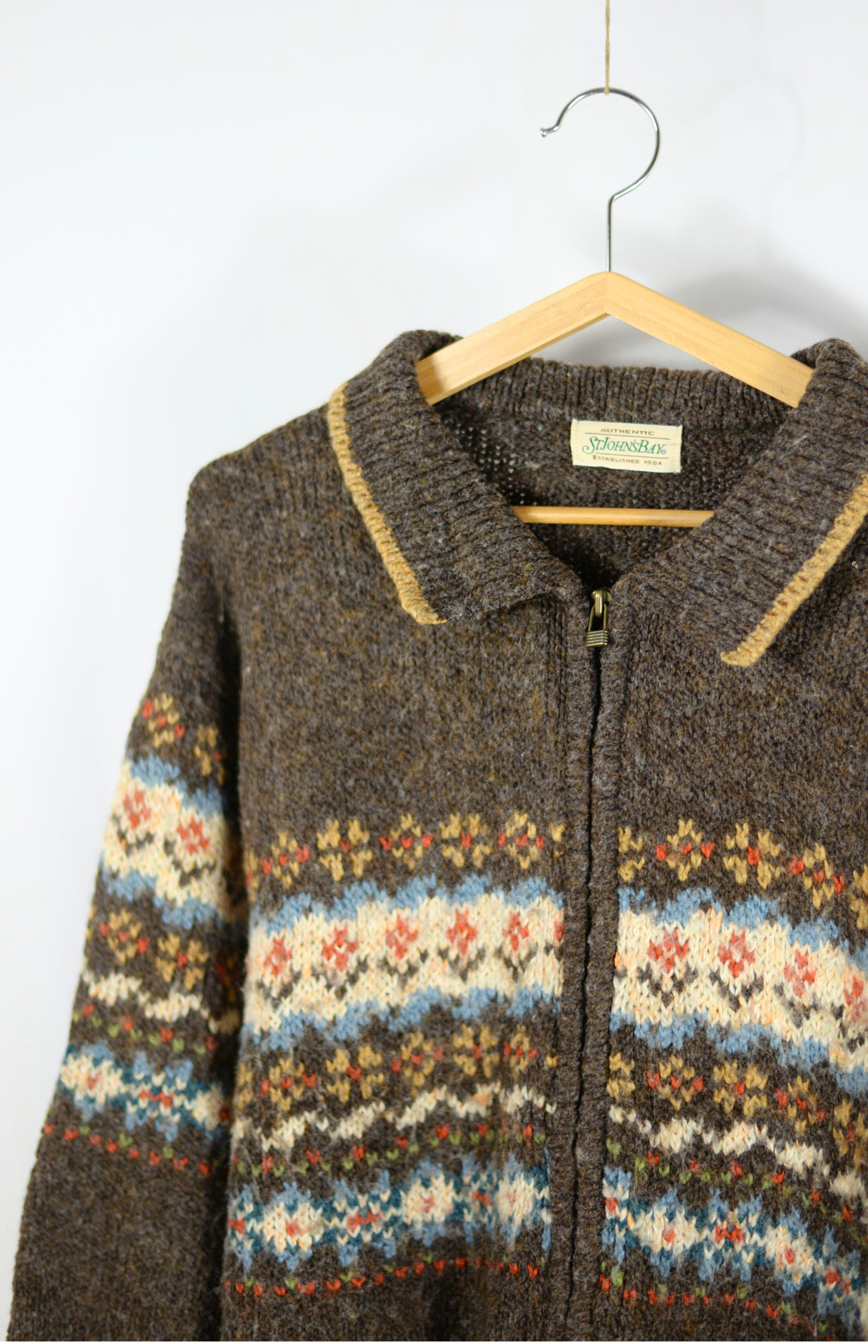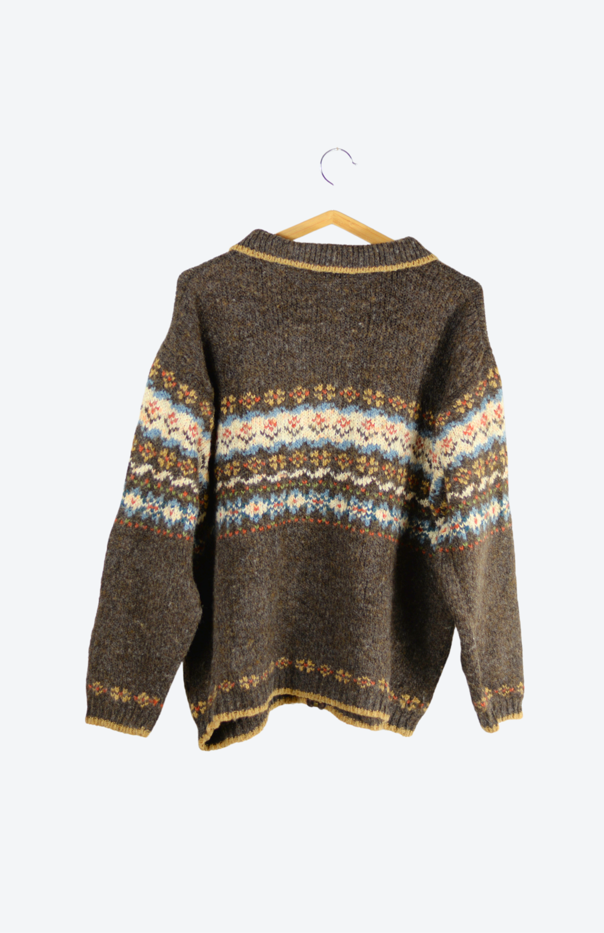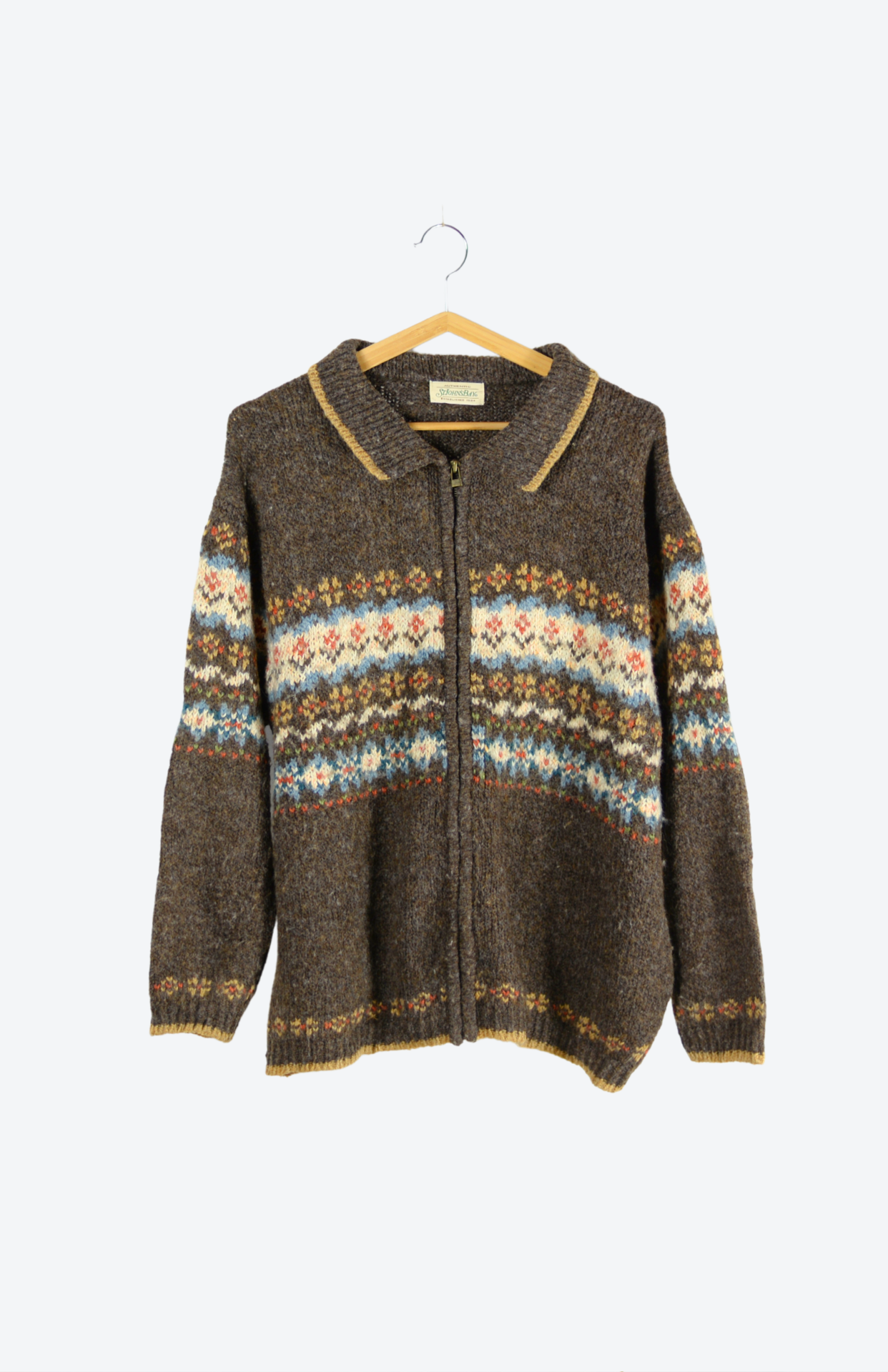 Vinatge svetr s funky barevným vzorem. Má pěkný límeček, zapínání na středu na zip a středně silný úplet. Pěkně zpracovaný.