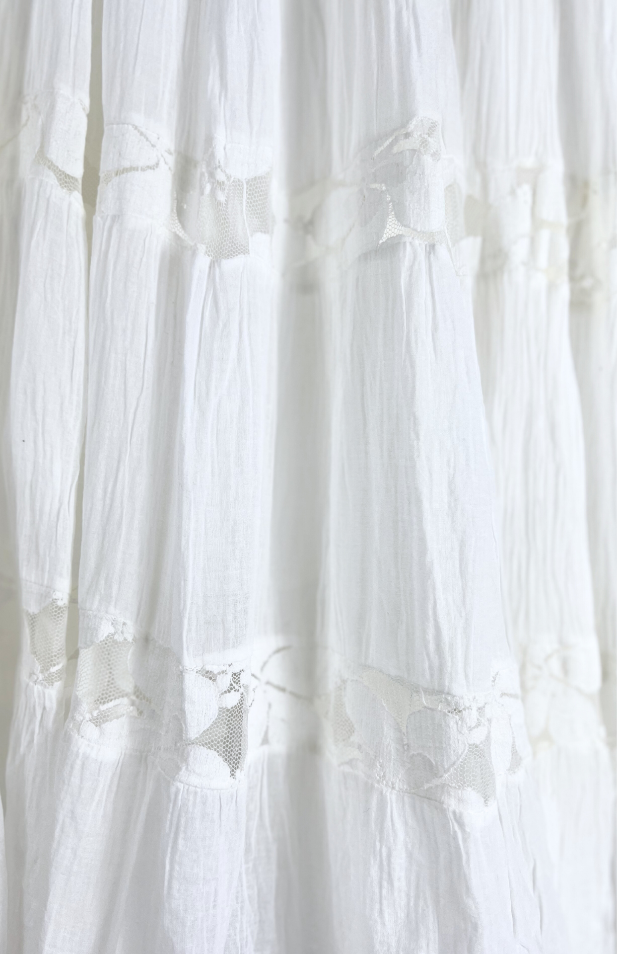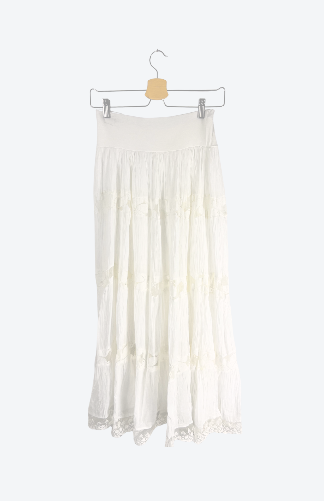 Vintage bílá sukně květinovou krajkou a postupným volnem. Má příjemný pružný pas.
