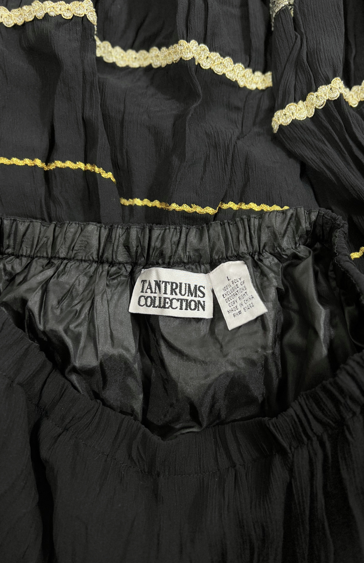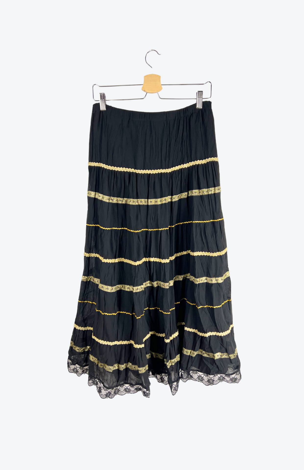 Dlouhá vintage točivá sukně. Má velmi pružný pas, krajkový detail na konci lemu a zlaté zdobené proužky. Hutnější kousek se saténovou spodničkou.