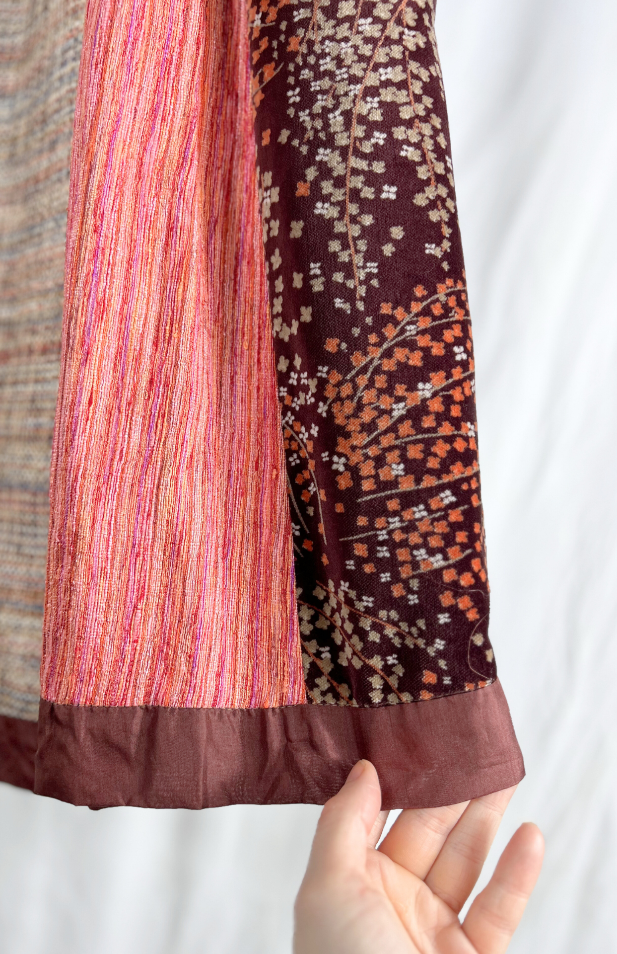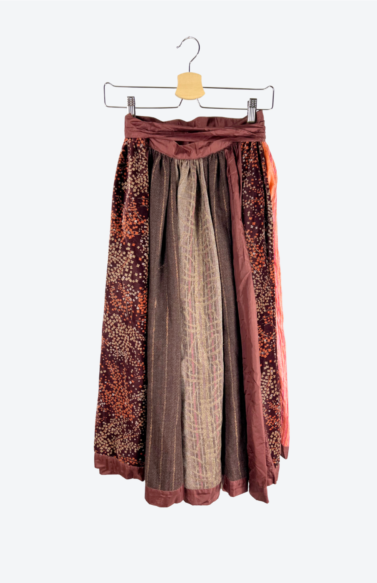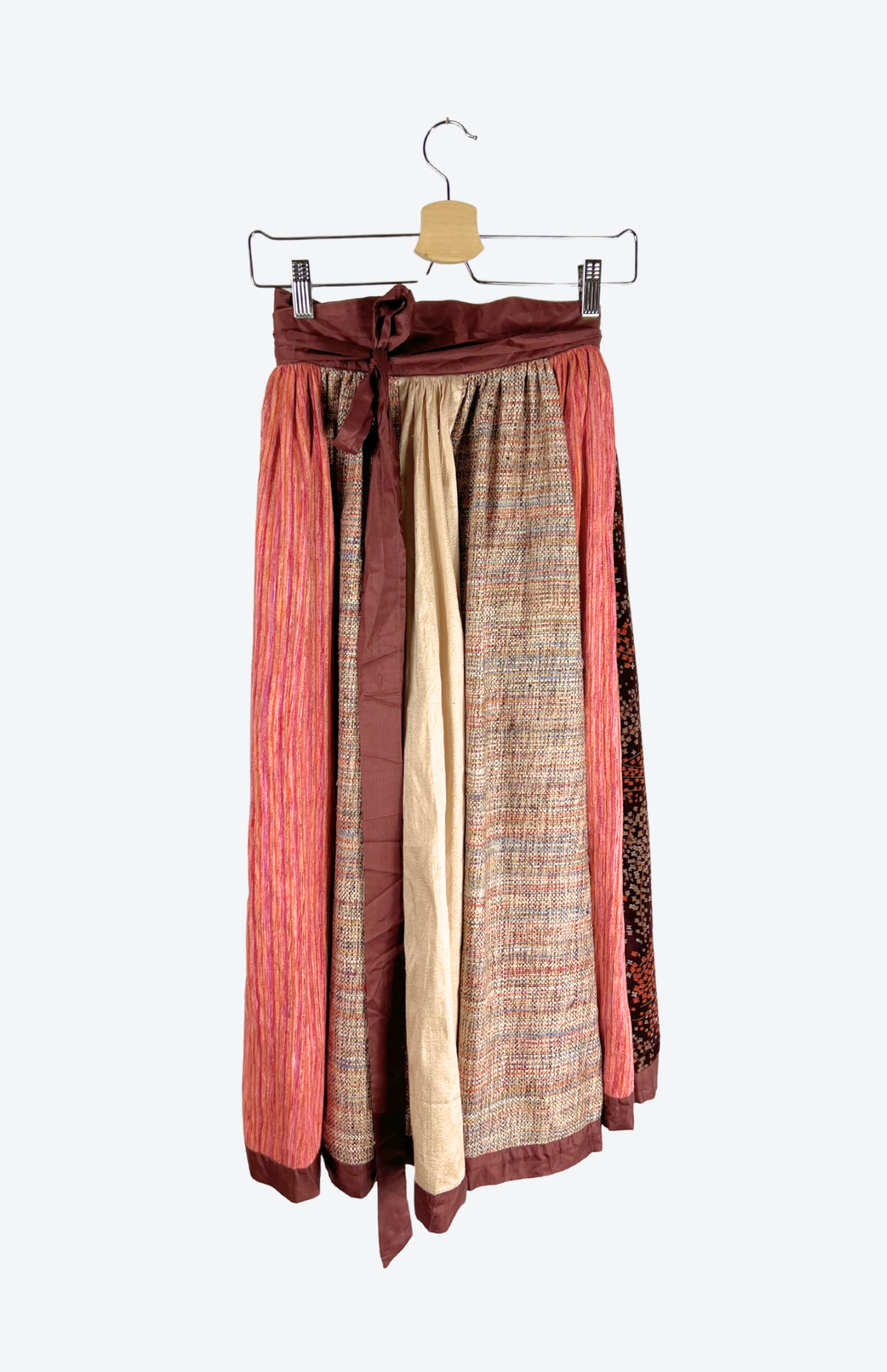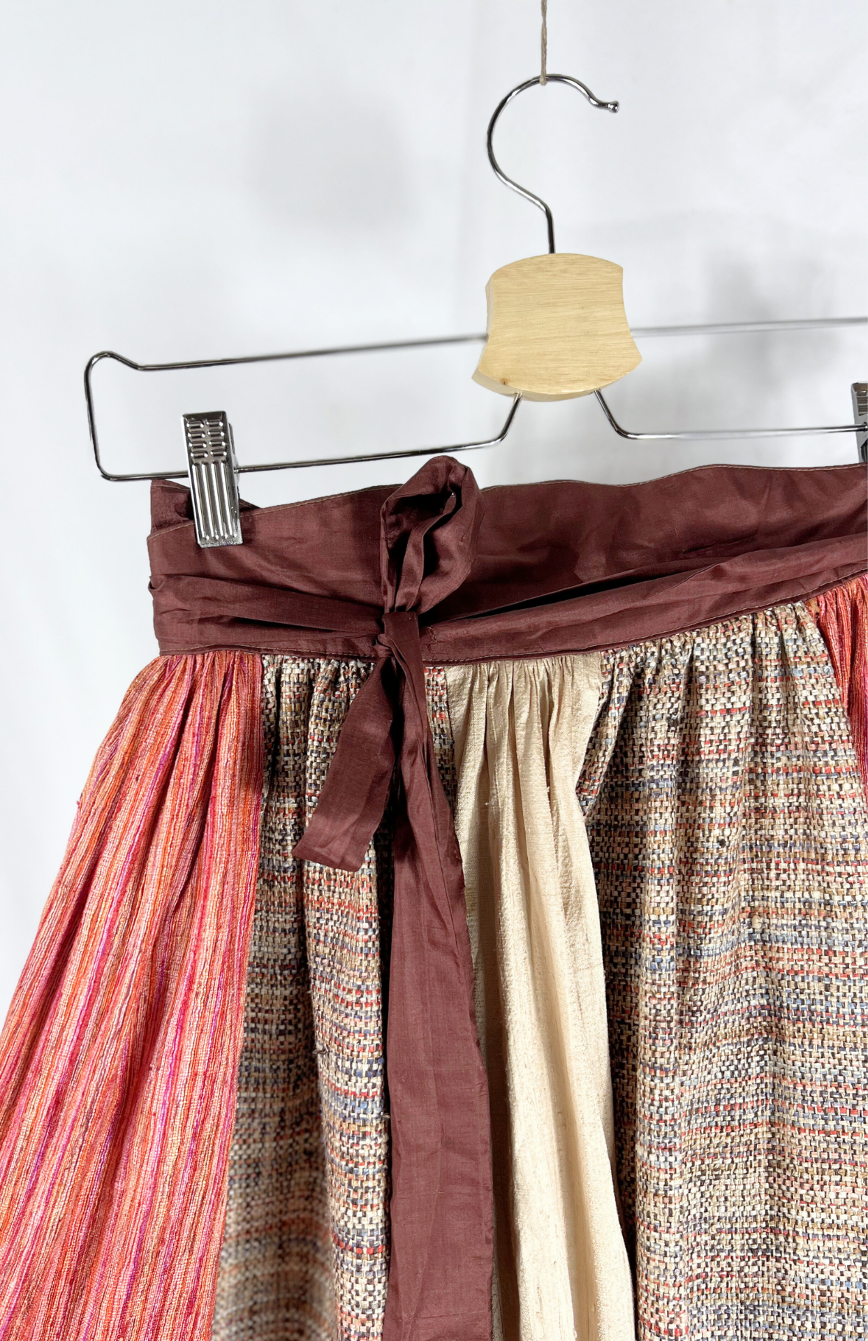 Vintage sukně s barevnými pruhy z různých materiálů. Květinový samet, barevný tvíd, krepová krémová, lehká cihlová-- Originální kousek s vázáním v pase.