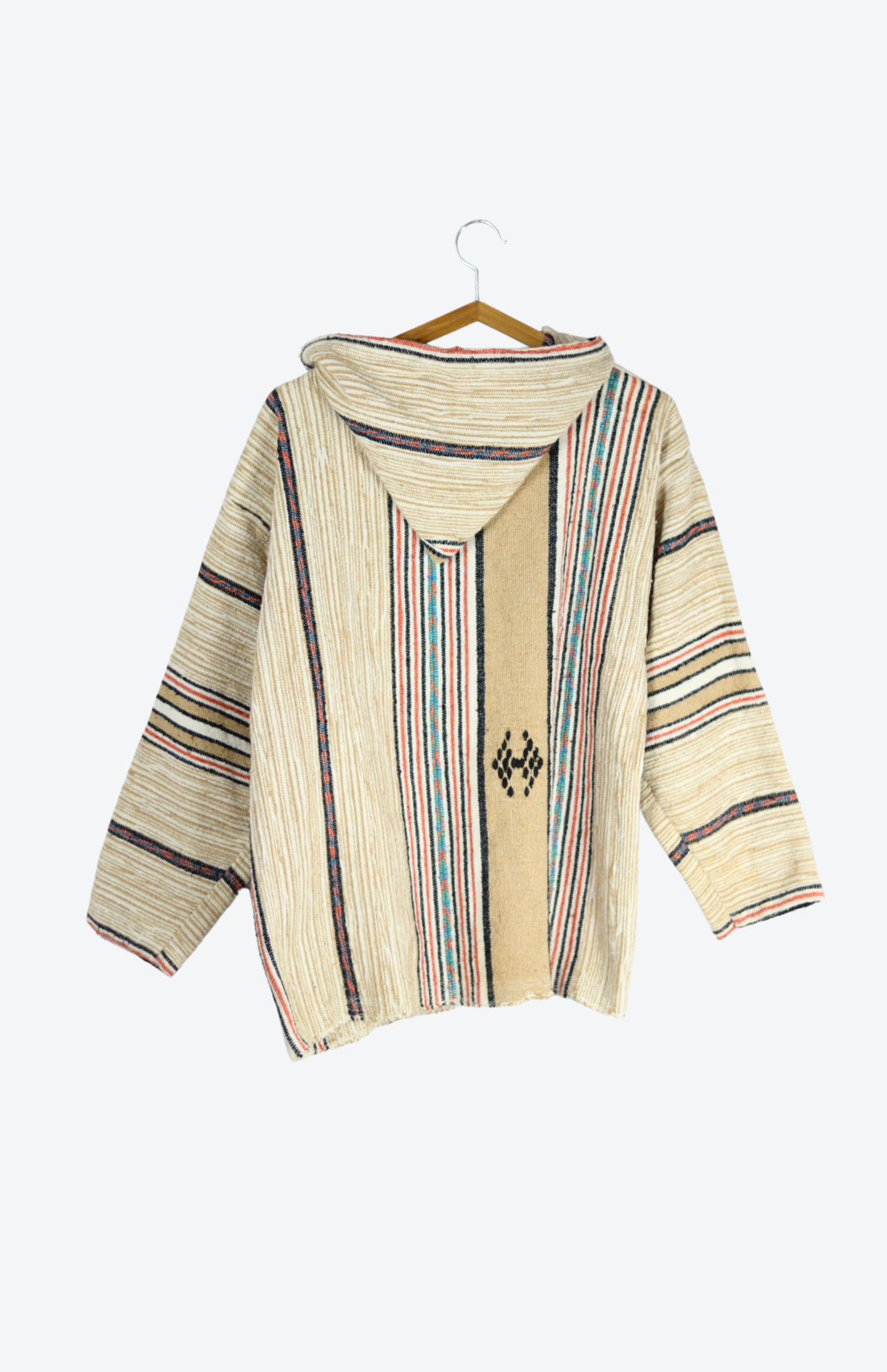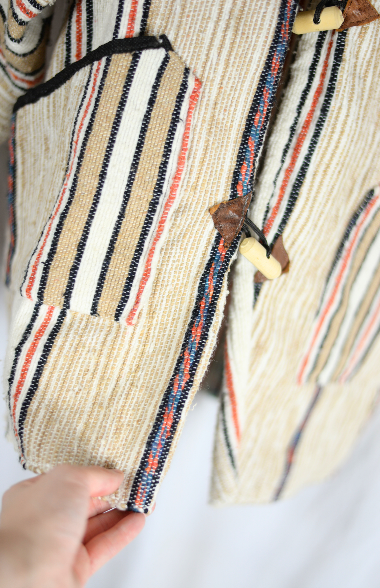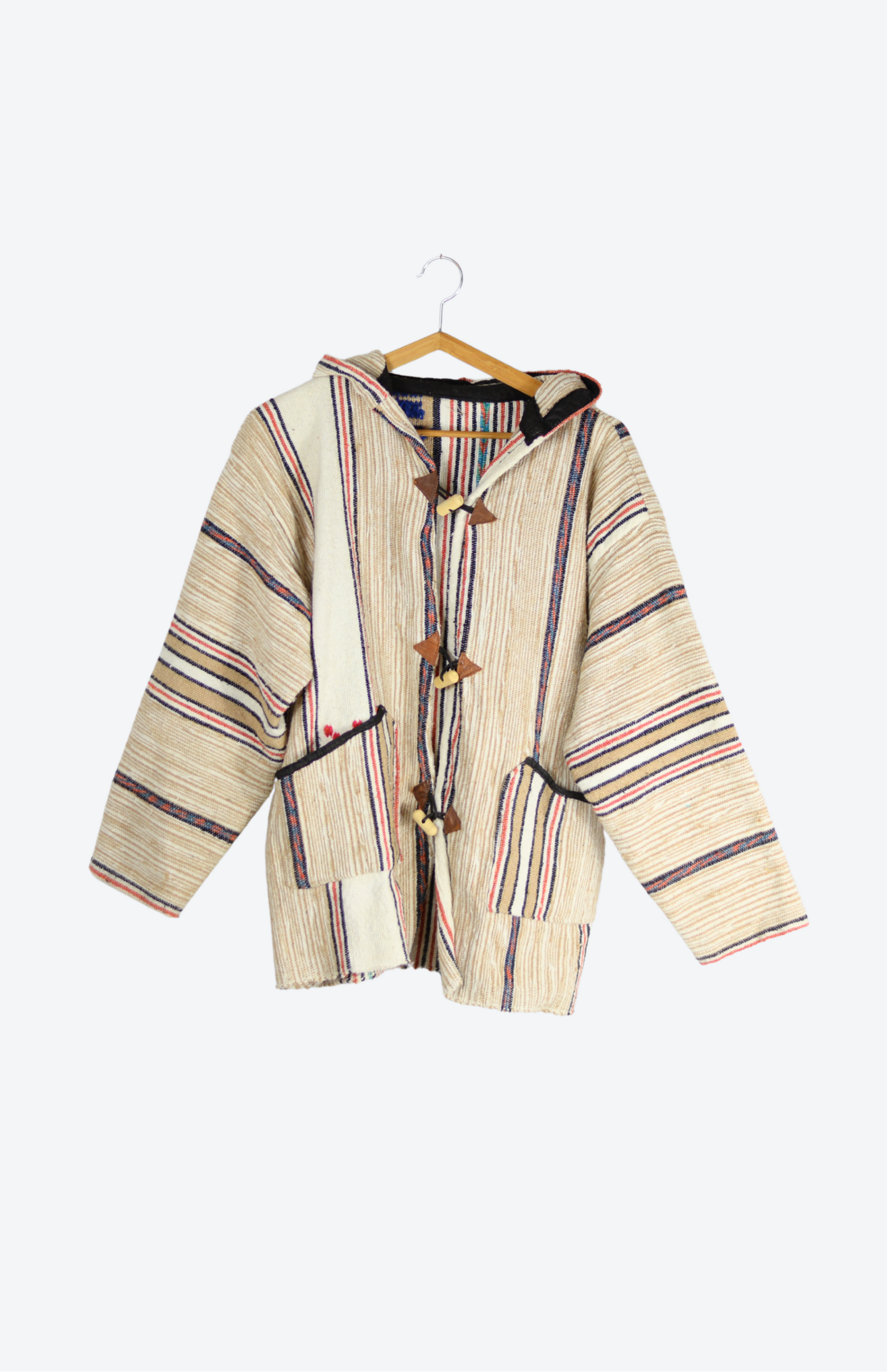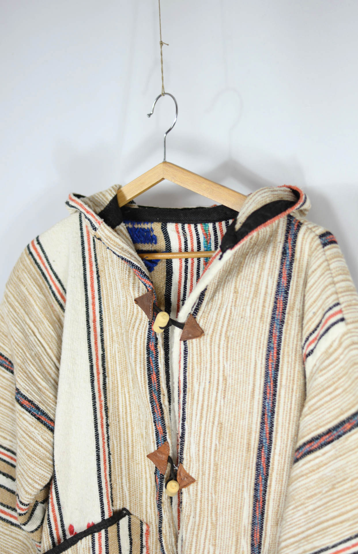Vintage boho svetr/kabátek ve stylu mexické baji. Má průvlekové zapínání s dřevěnými knoflíky. Kožený detail přešití šňůrek. Vzadu kapuca, vpředu kapsy po stranách. Originální a pěkně zpracovaný kousek.
