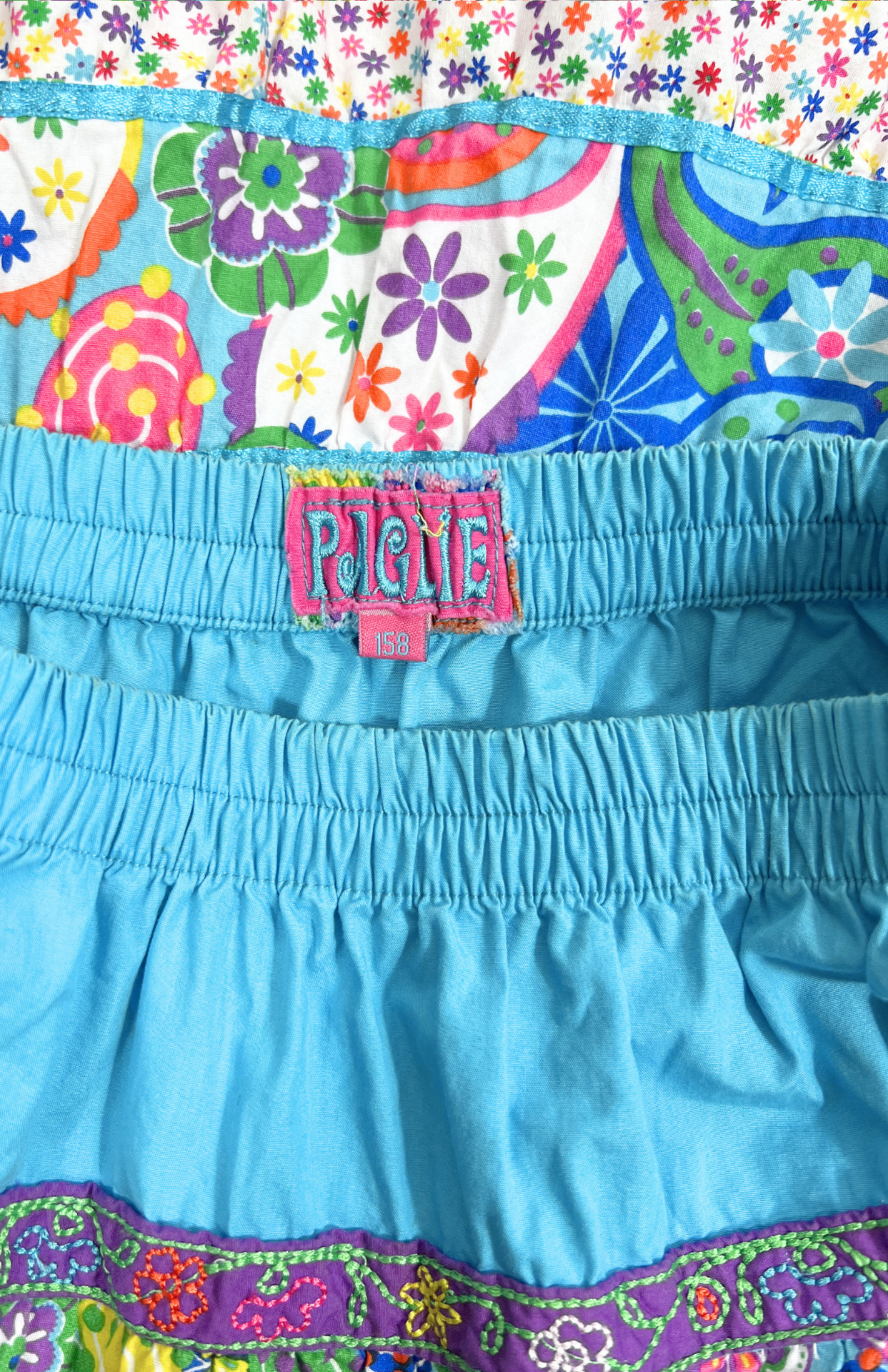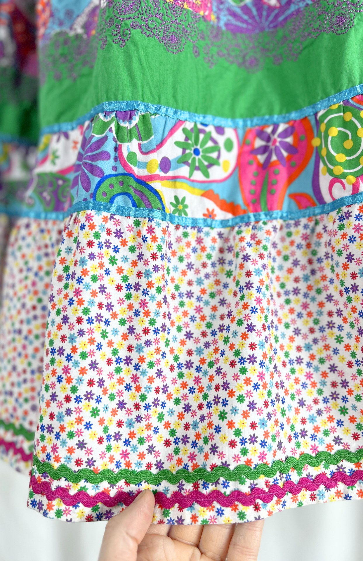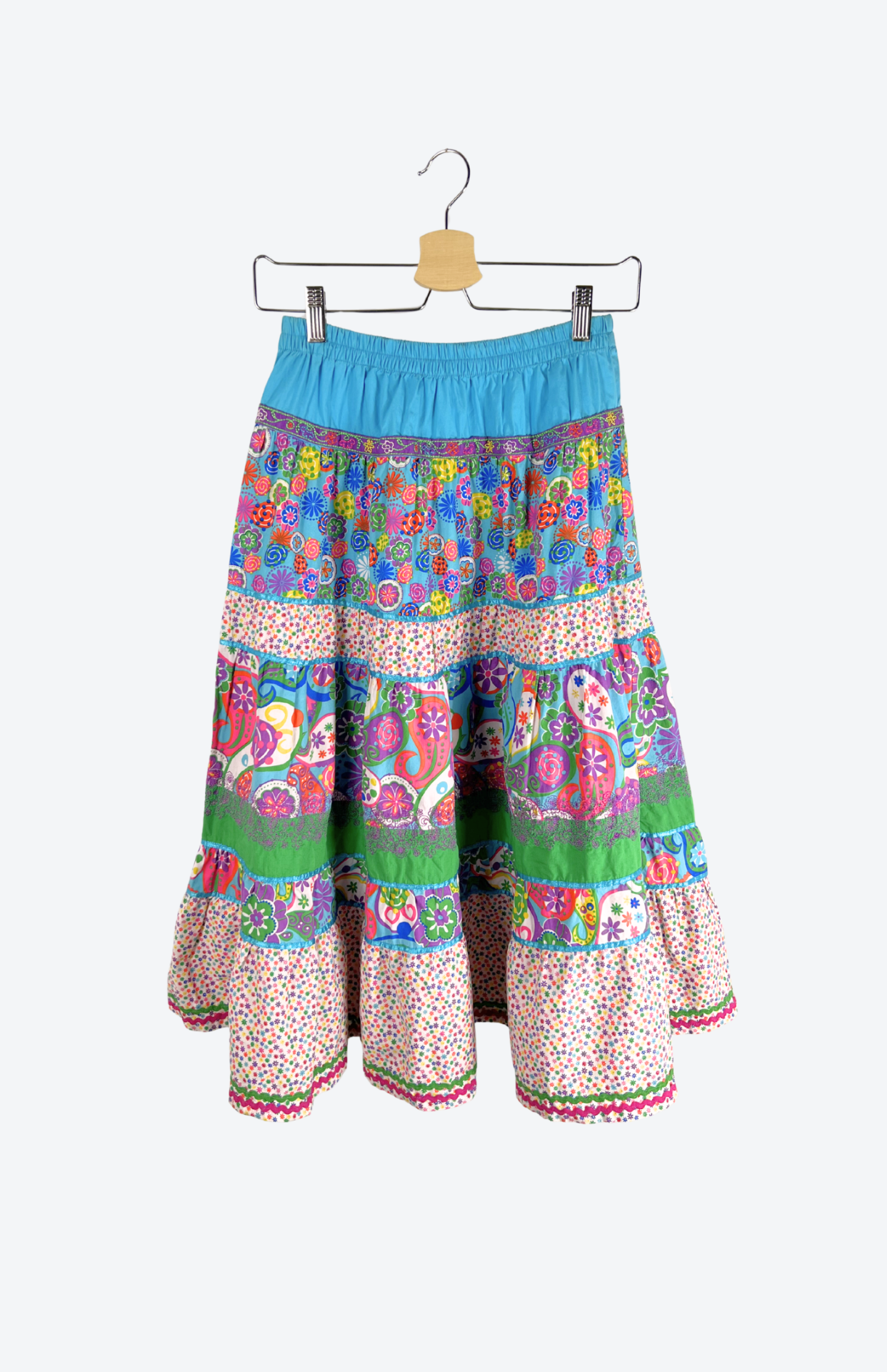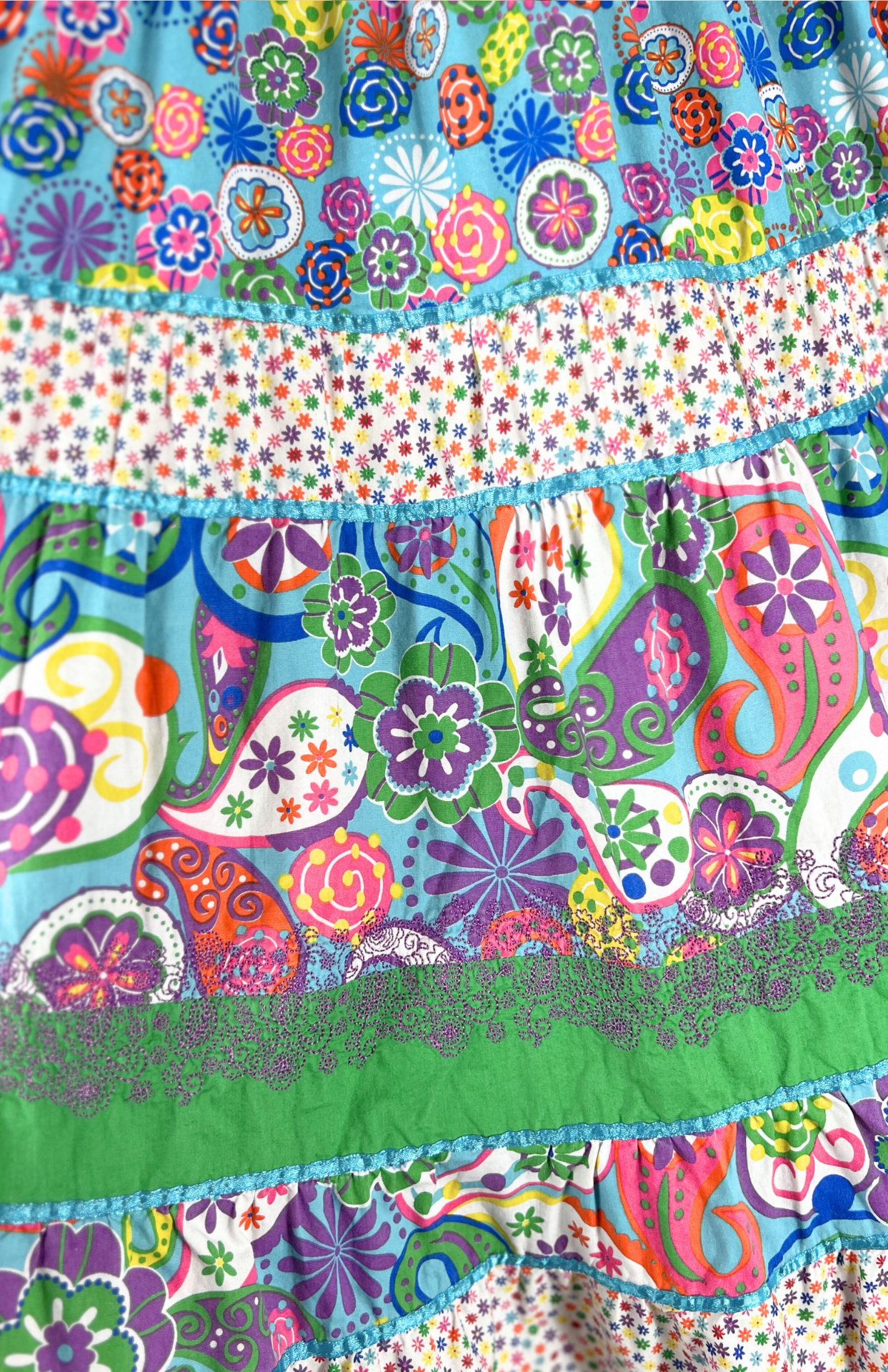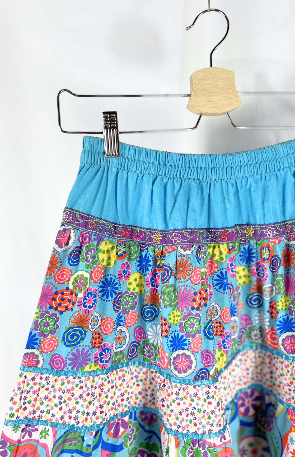 Roztomilá, bohatá točivá sukně. Má velmi pružný pas, barevný vzor s kvítky a lemování barevnou stužkou podél spodního lemu. Pěkně zpracovaný, originální kousek.
