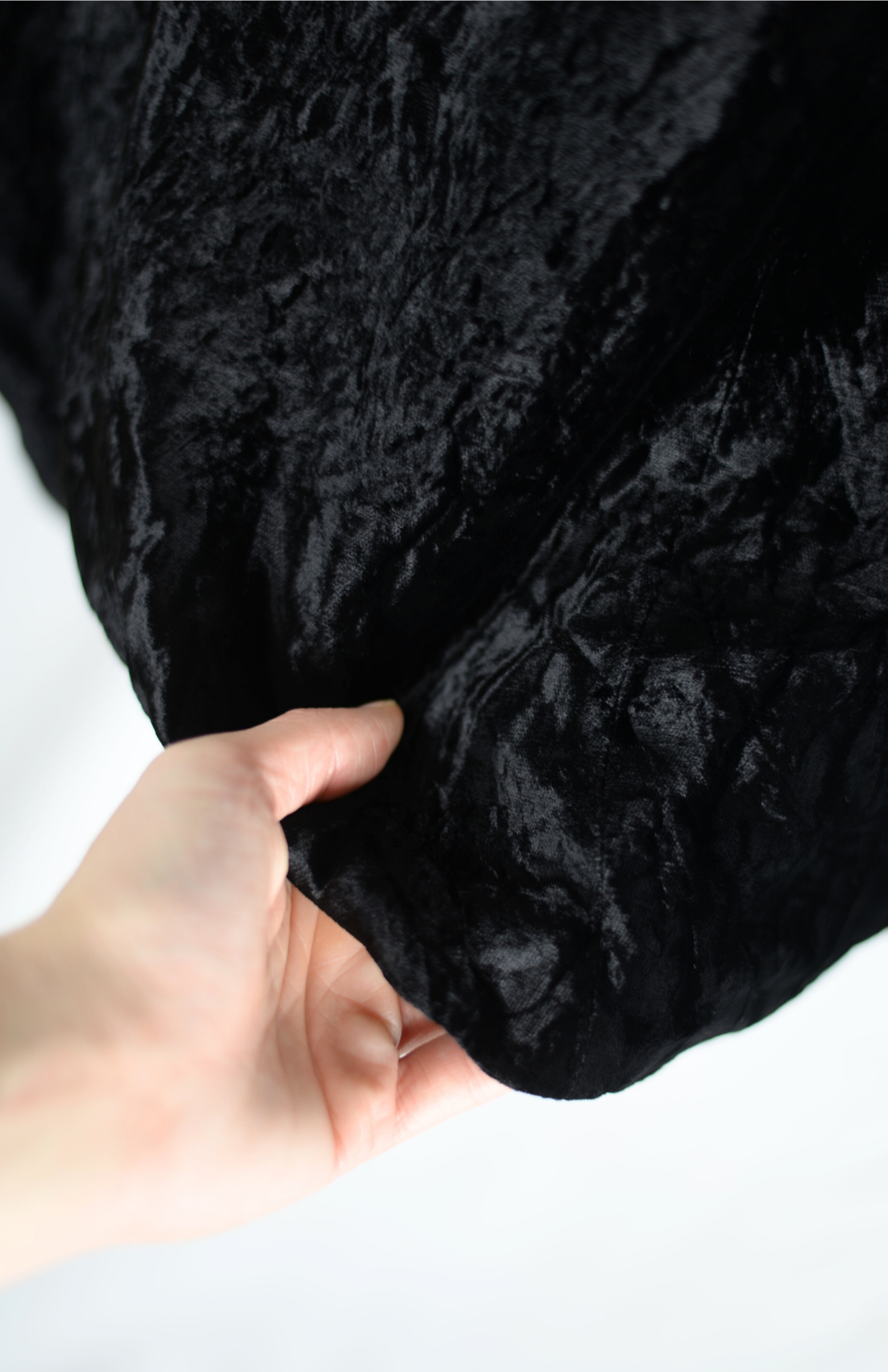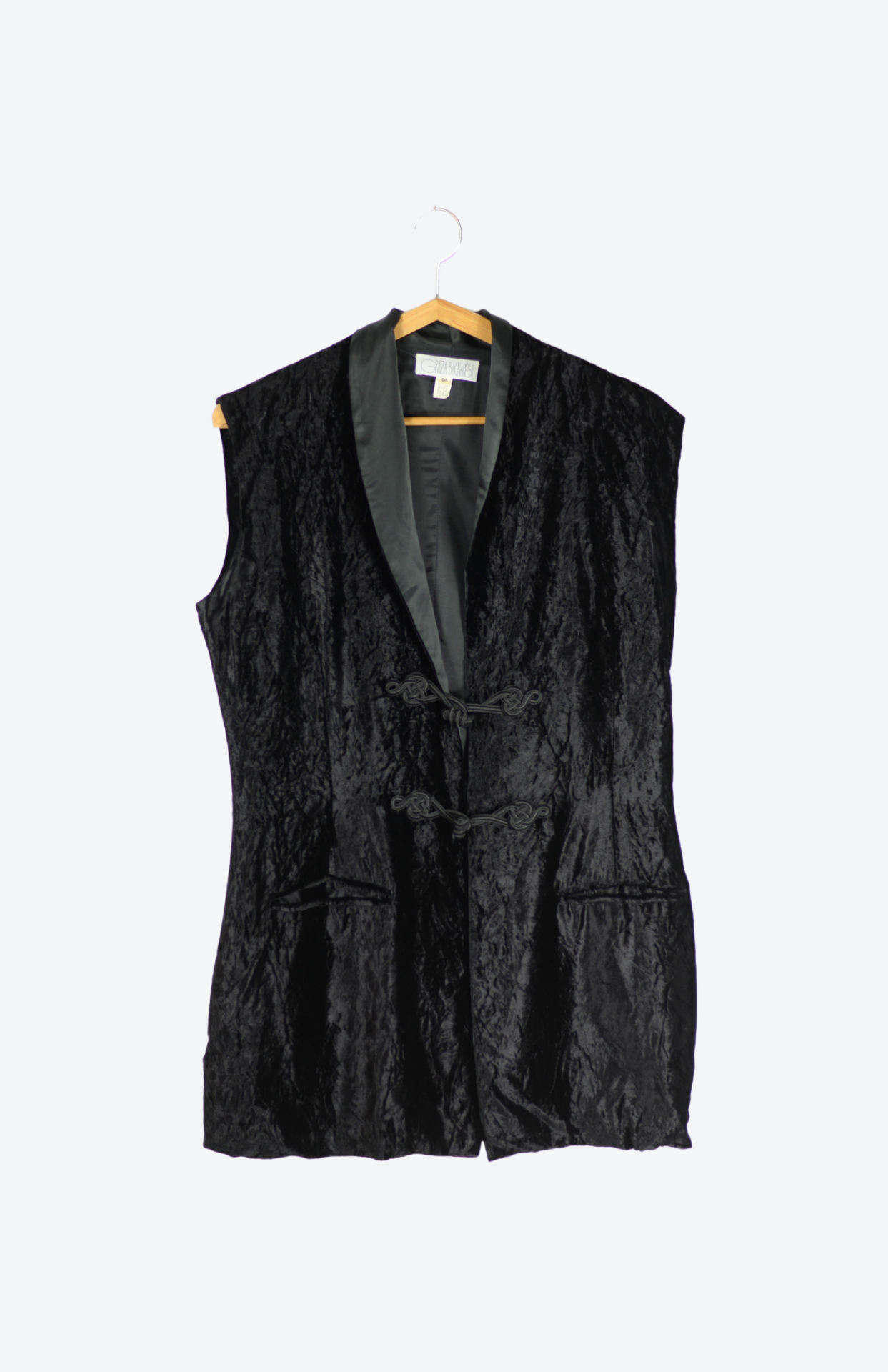 Delší černá vesta z mačkaného sametu. Má tenký límeček a krásné zdobené průvlekové zapínání. Má ještě nové - zašité kapsy po stranách.