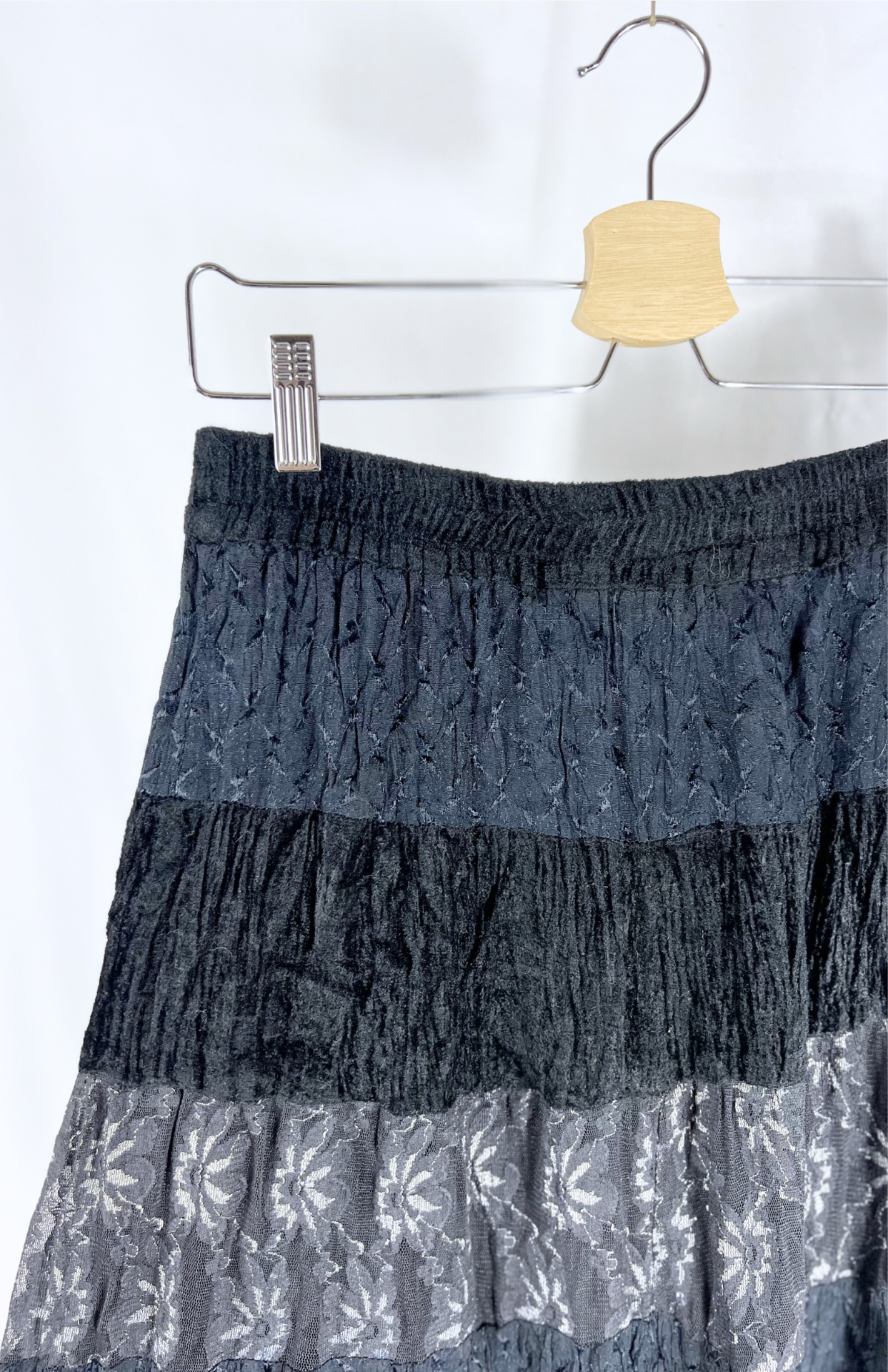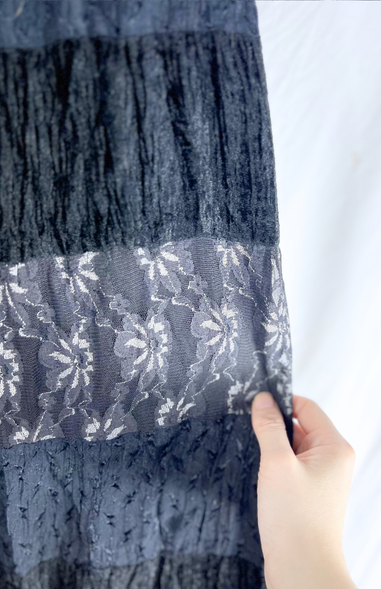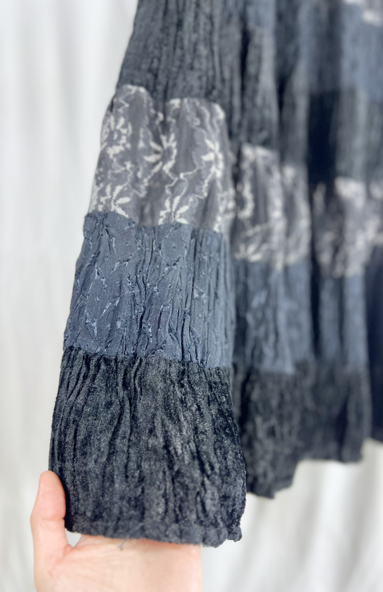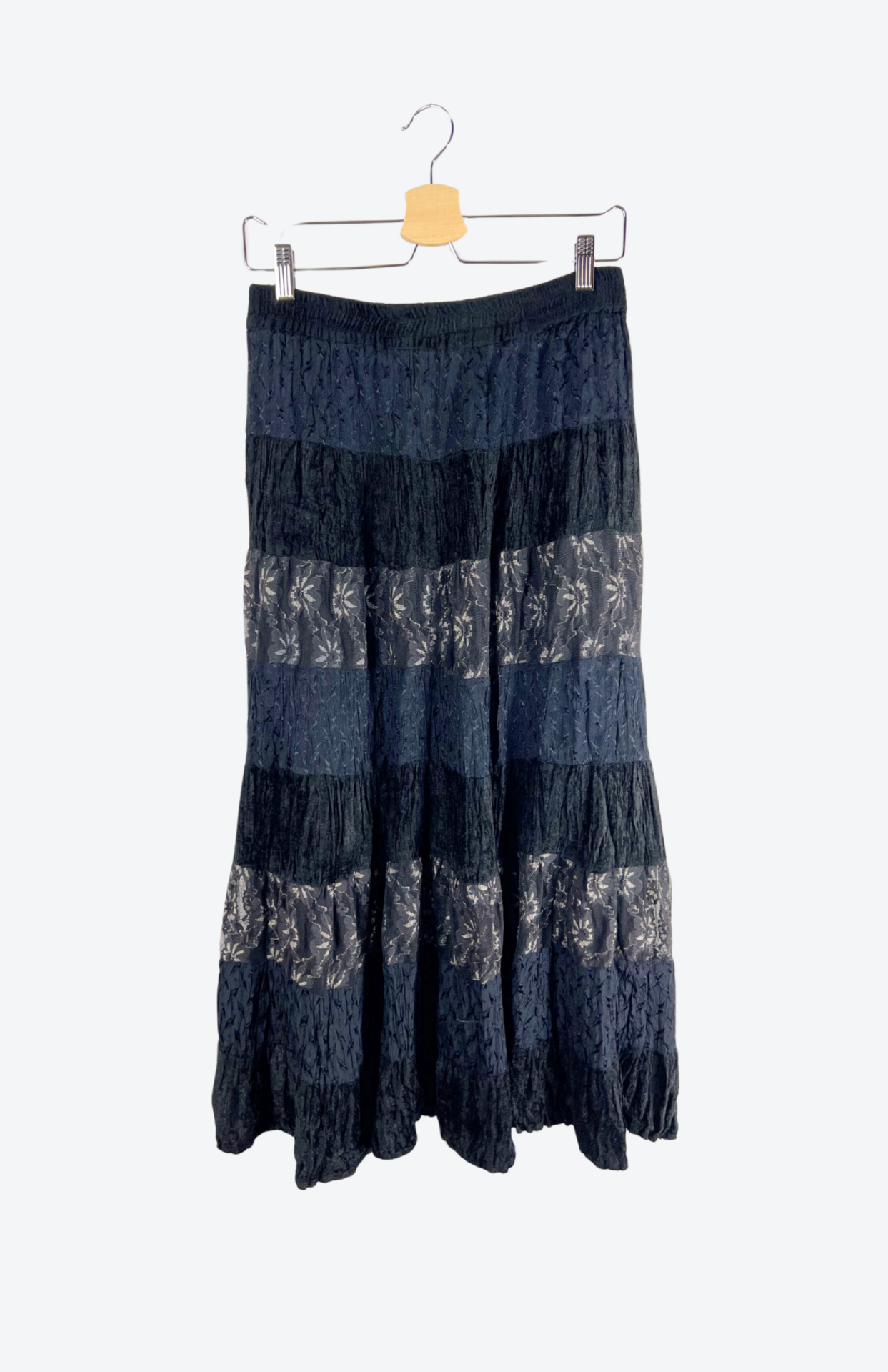 Vintage dlouhá sukně. Má postupný volán s řadami černého sametu, květinové krajky a prošívané tmavomodré látky. Příjemný, pružný pas.