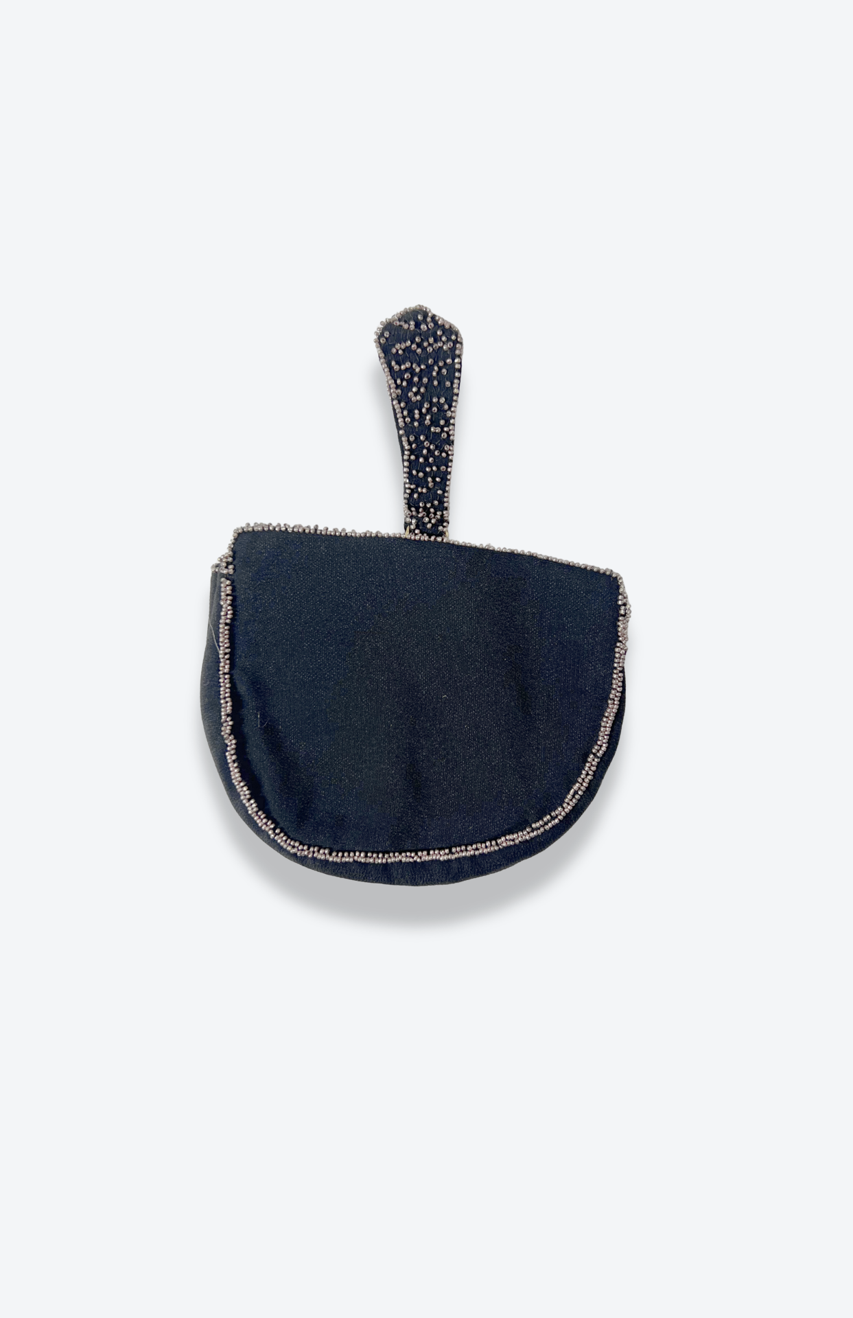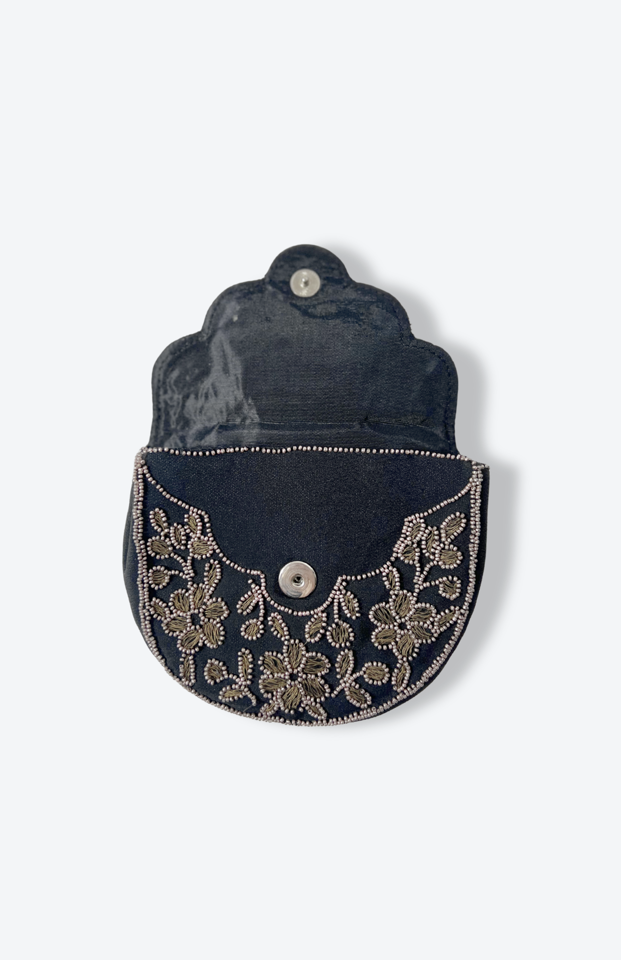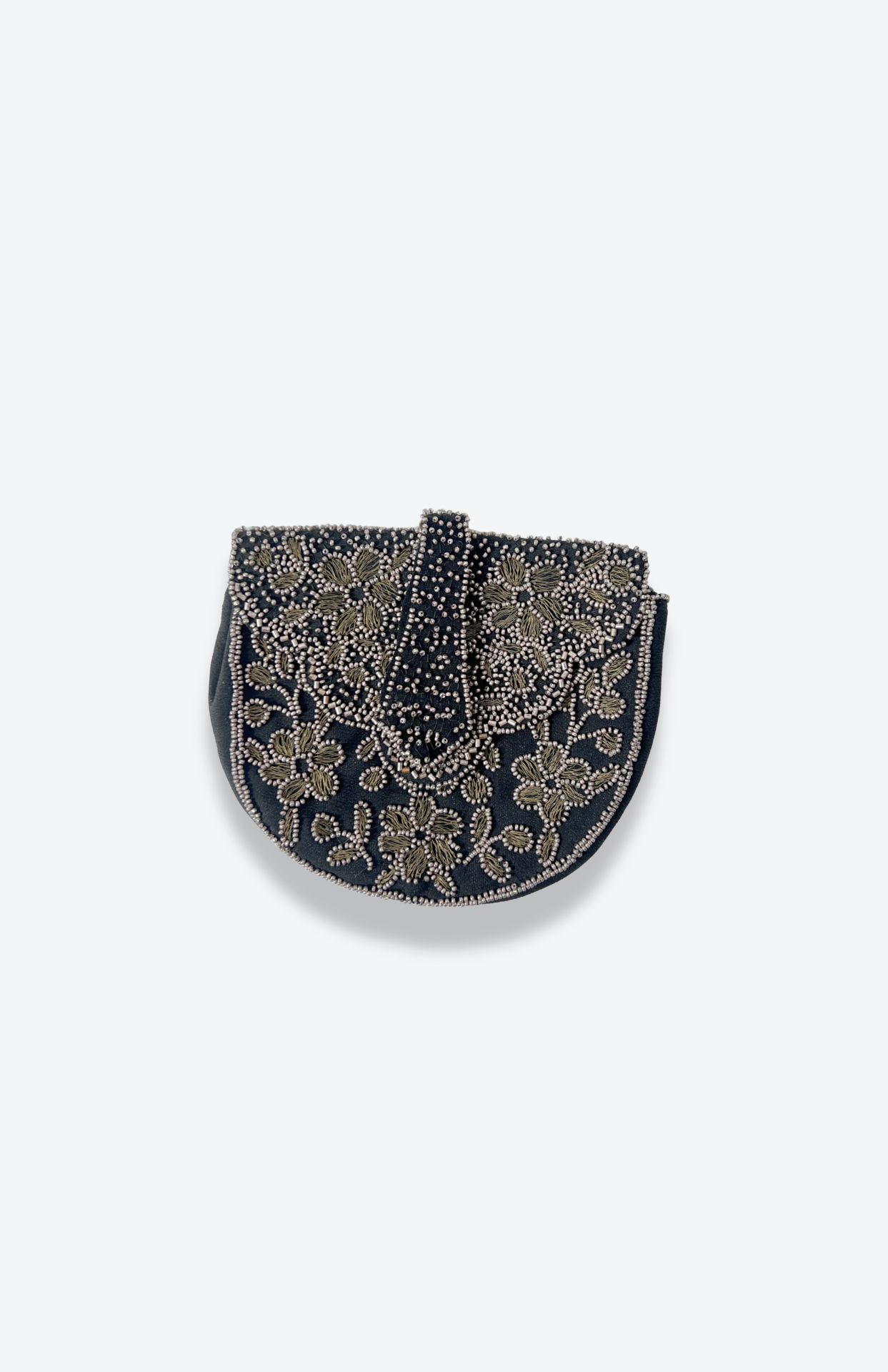 Vintage drobná kabelka s korálky. Starší, moc pěkně zpracovaný kousek nalezený na půdě. Drobné korálky + vyšívané vnitřky květin. Má poutko pro případné zavěšení, uchycení.