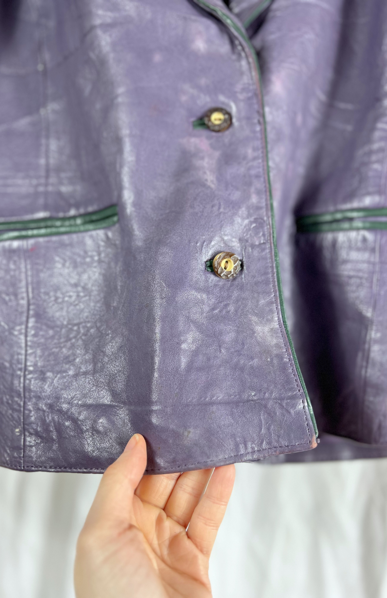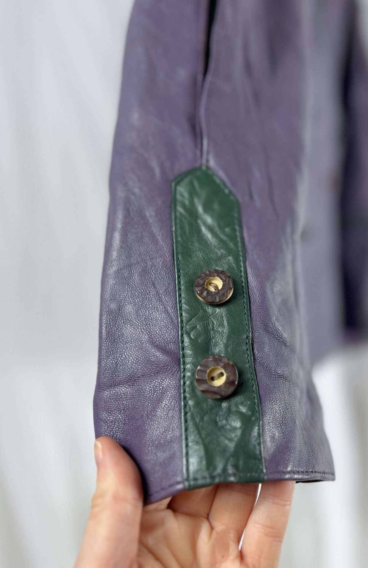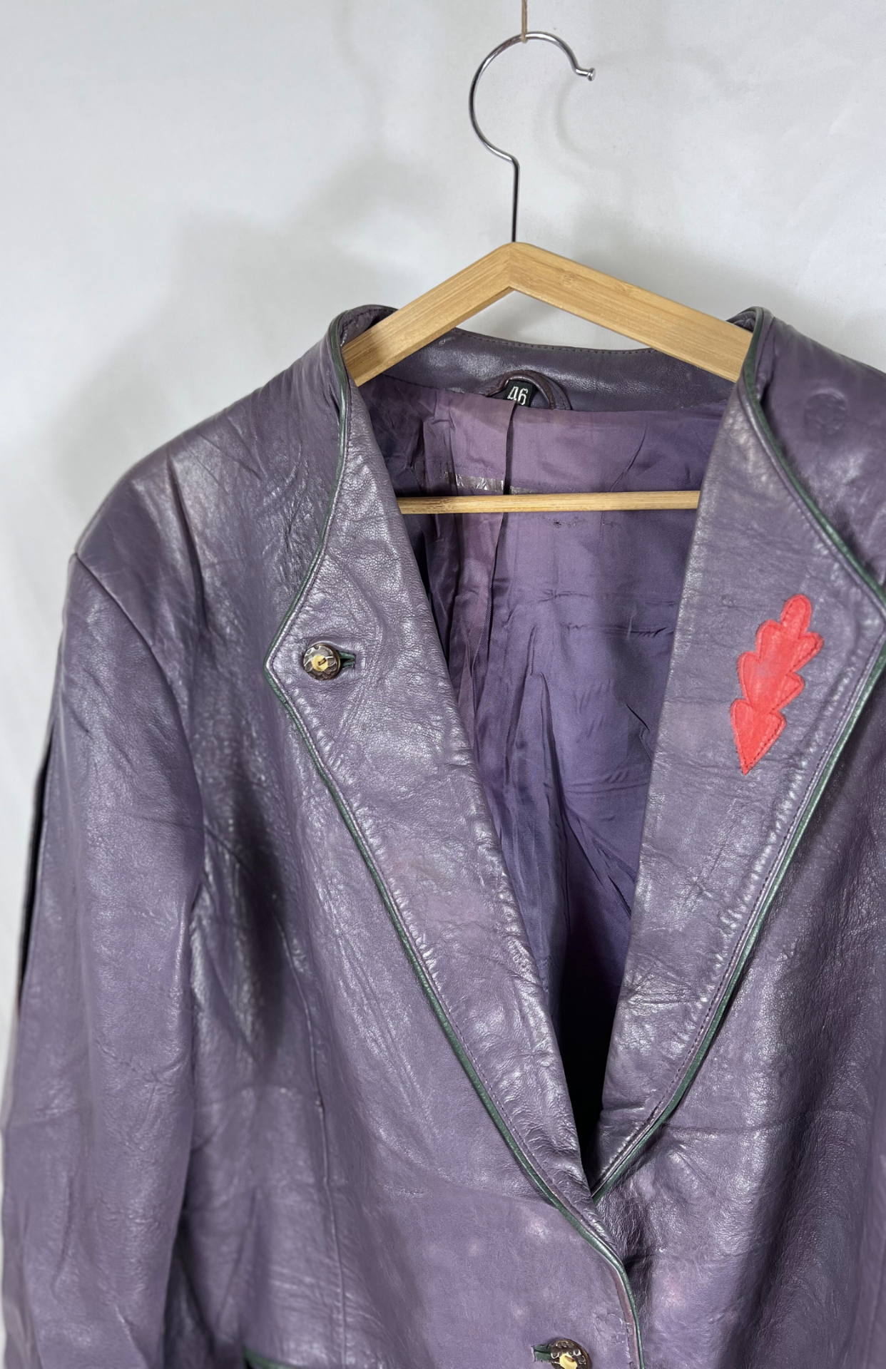 Fialová vintage kožená bunda. Má červené detaily s dubovým listem a tmavě zelené lemy. Zapíná se na drobnější myslivecké knoflíky. Kapsy zvenčí. Originální vintage kousek.