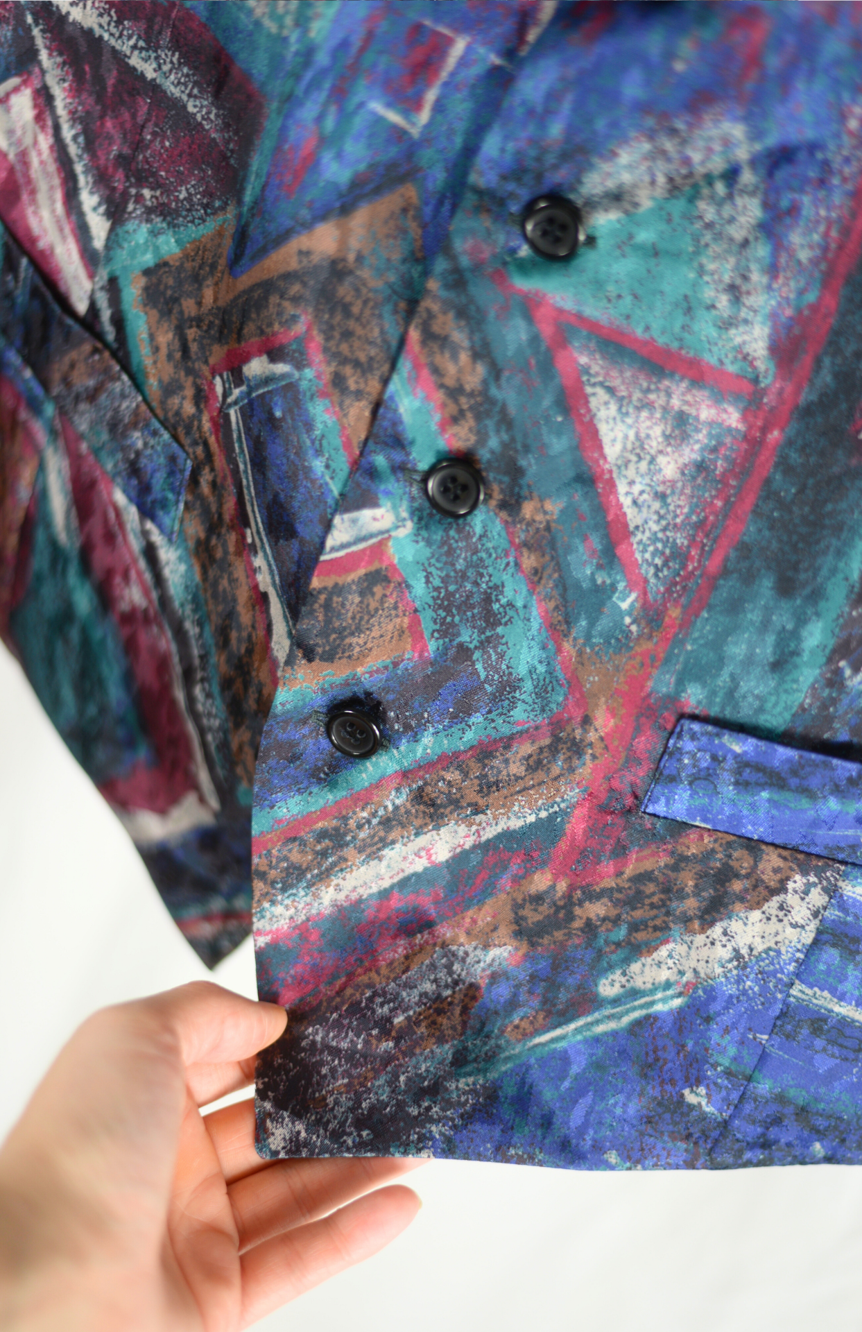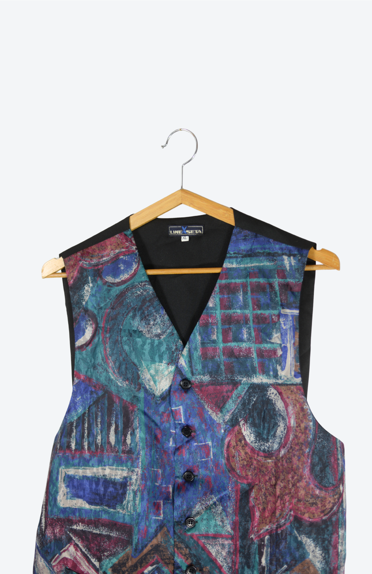 Vesta s funky retro vzorem. Má saténovou černou podšívku i záda, vzadu s páskem pro přizpůsobení v pase. Má menší kapsy po stranách. Unisex kousek.