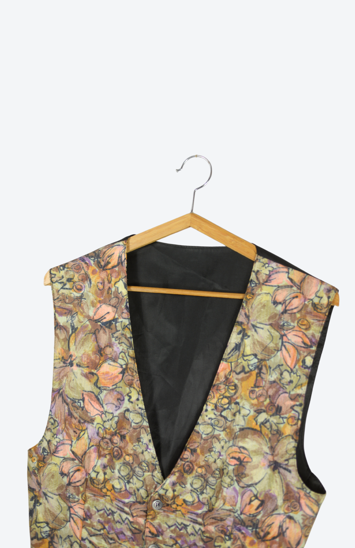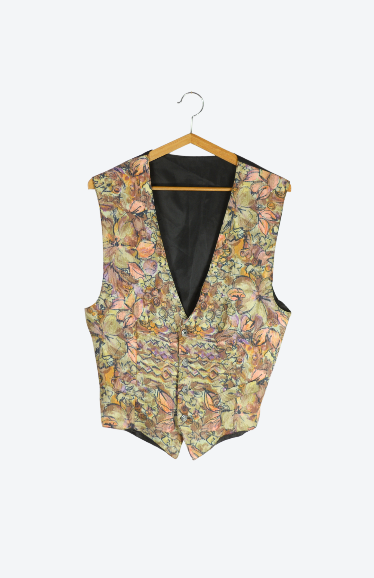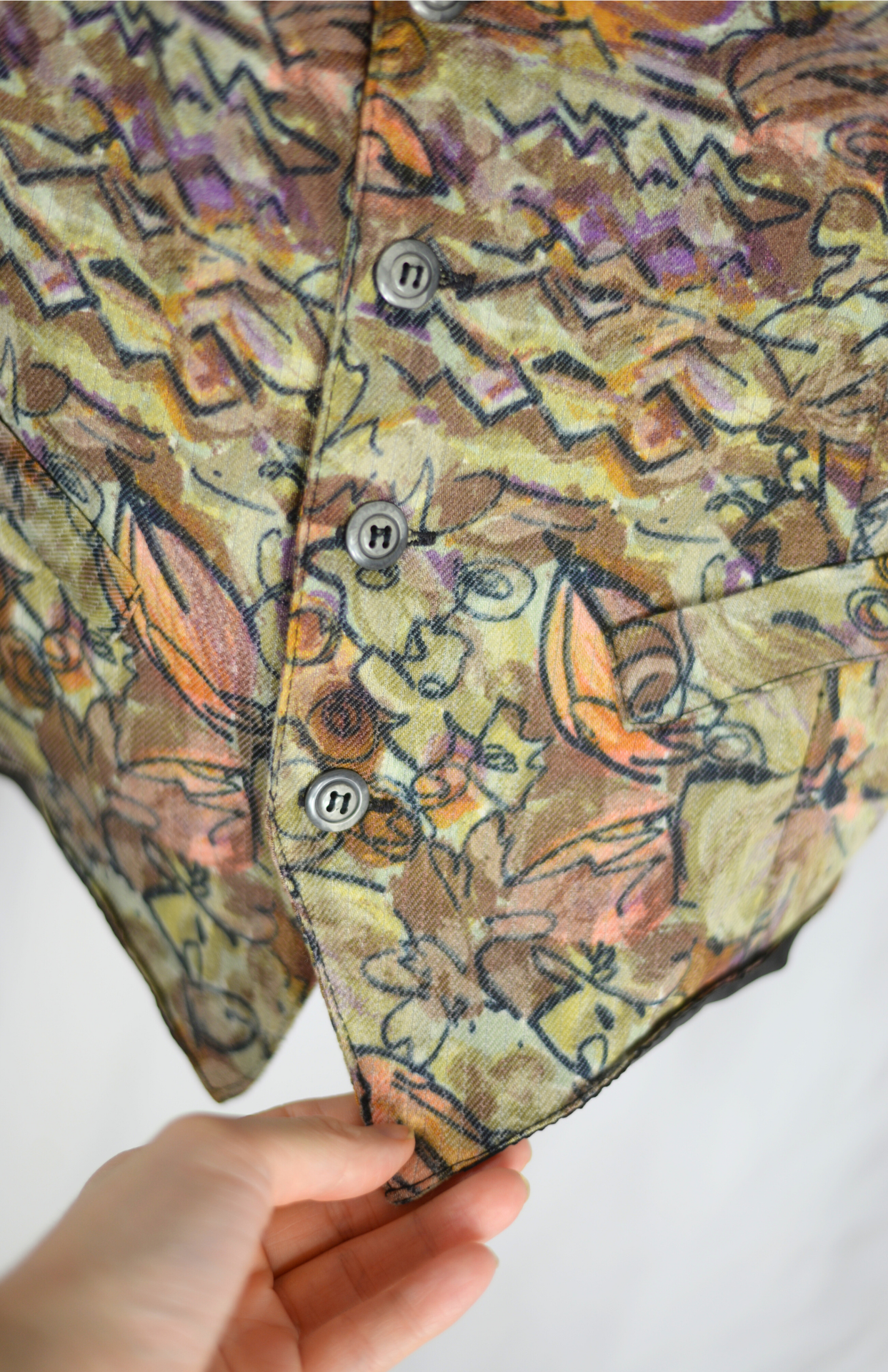 Vesta s funky vzorem. Má saténovou černou podšívku i záda, vzadu s páskem pro přizpůsobení v pase. Má zašité kapsy po stranách.