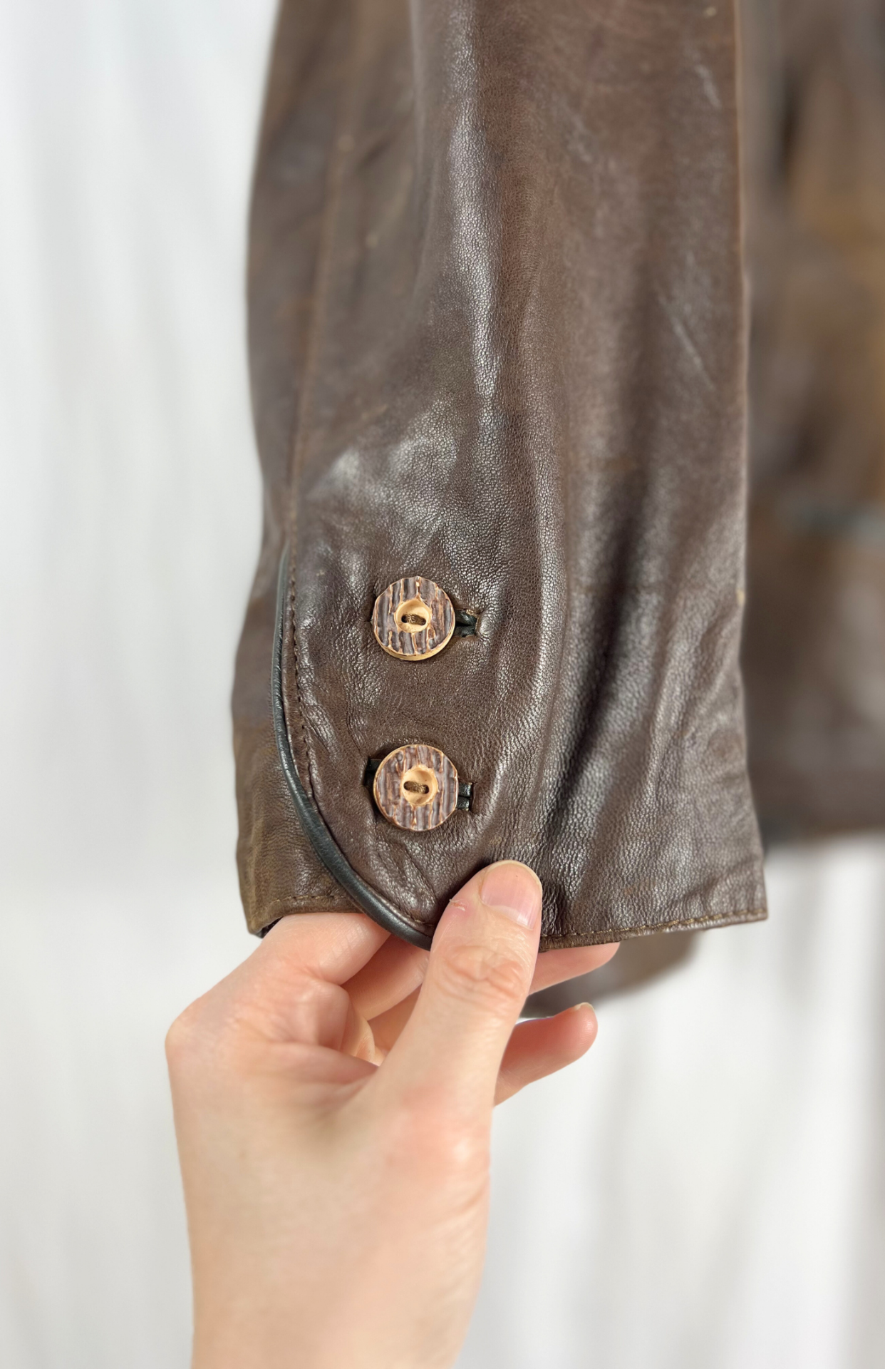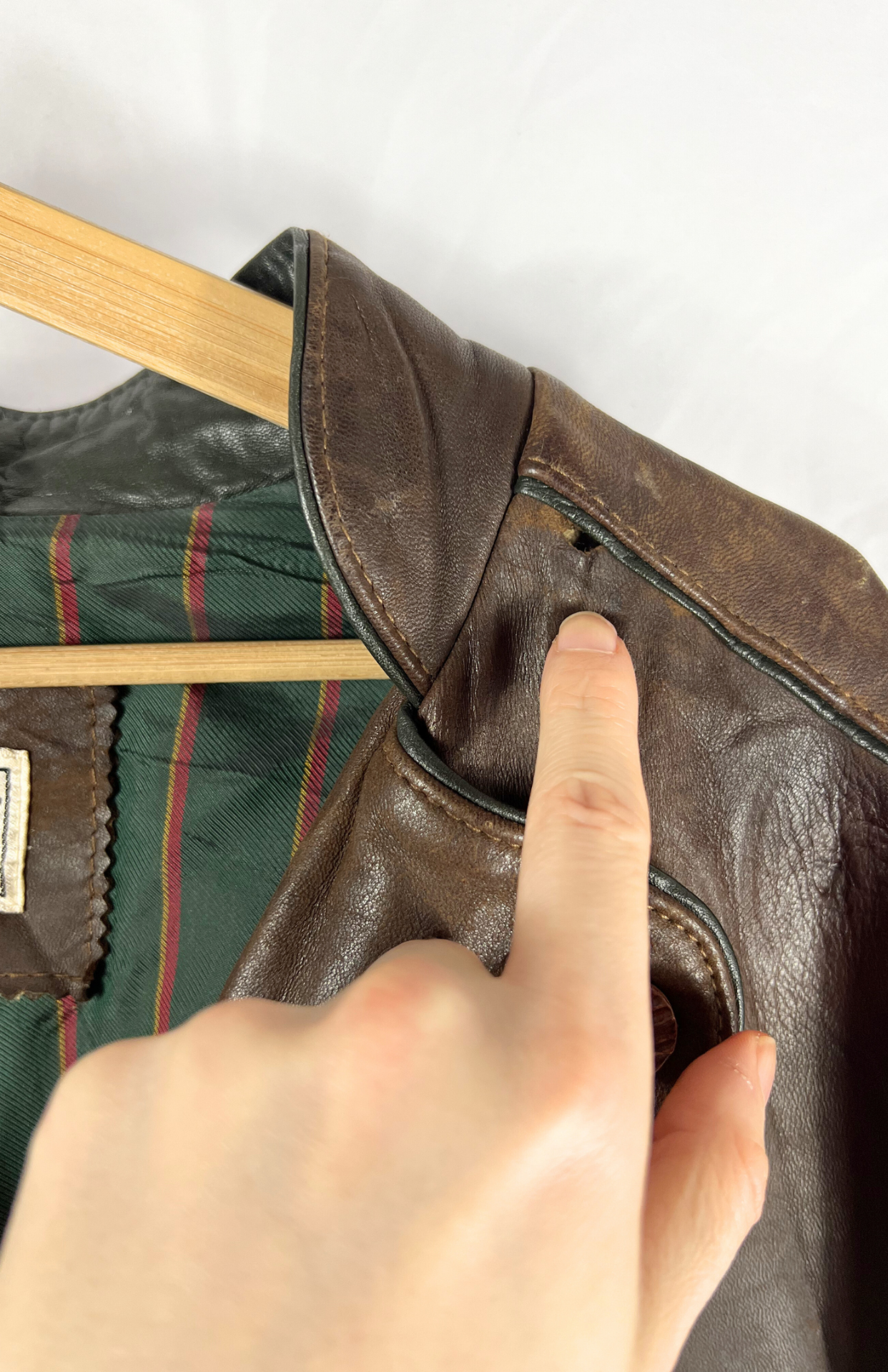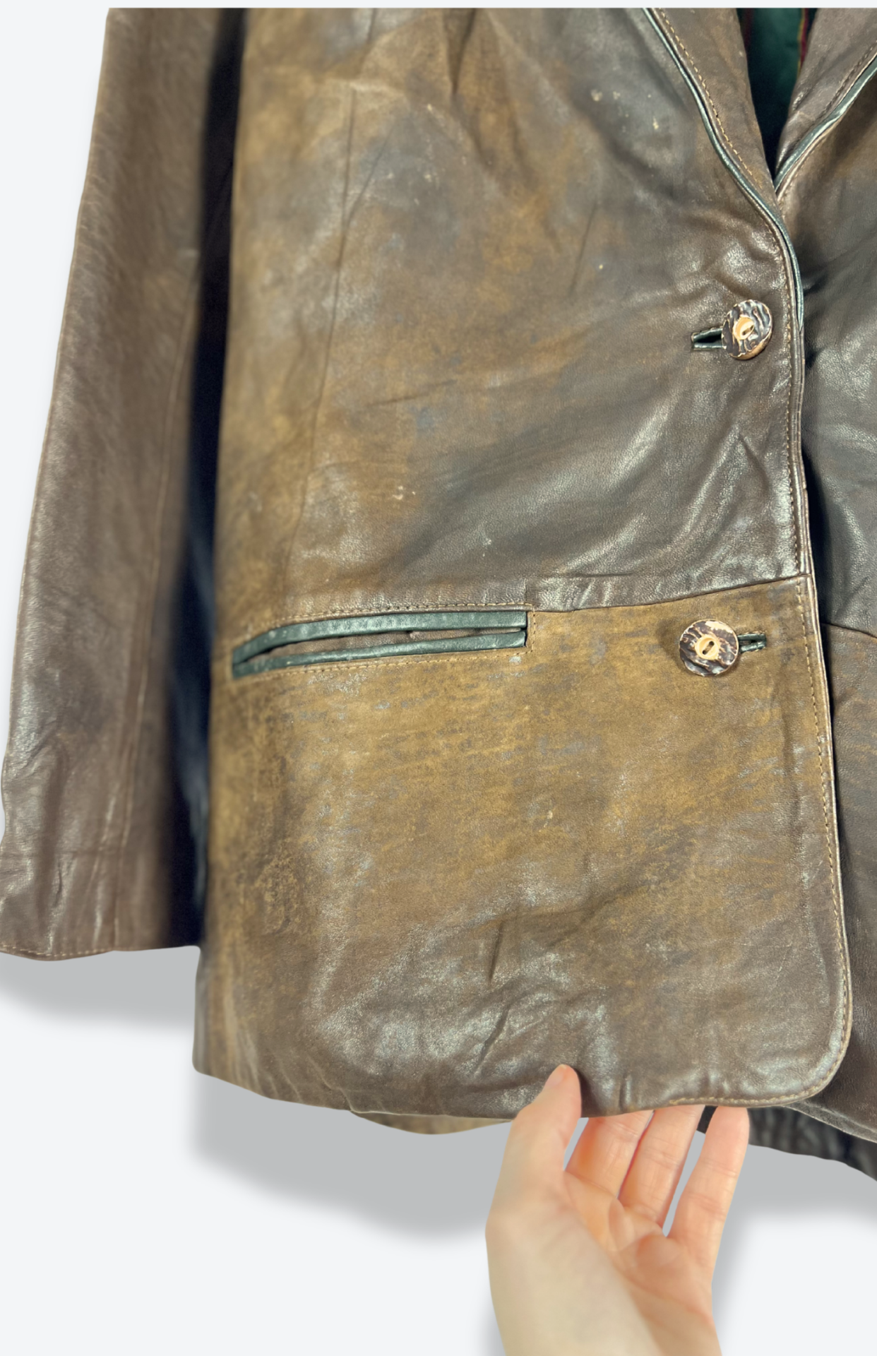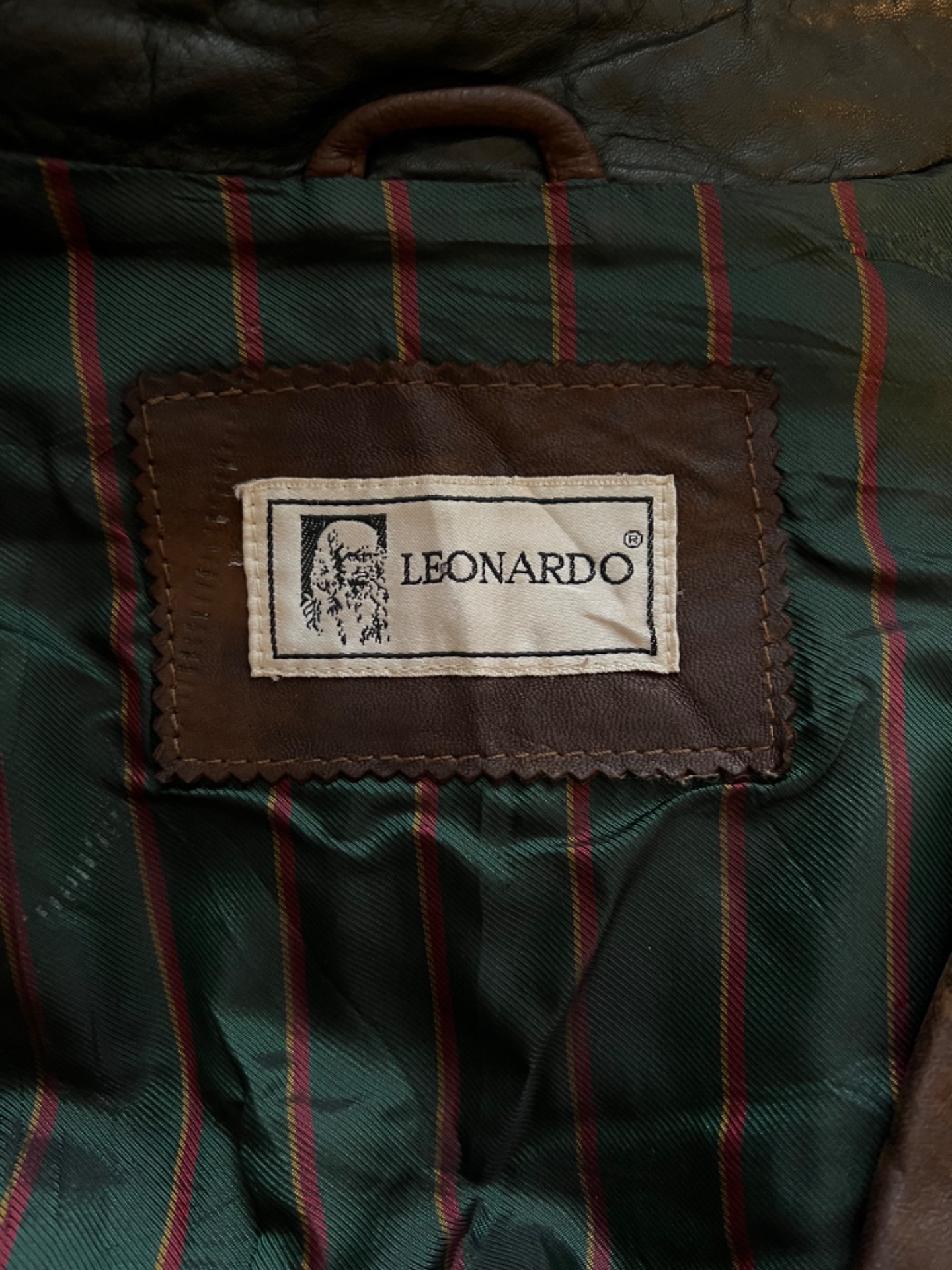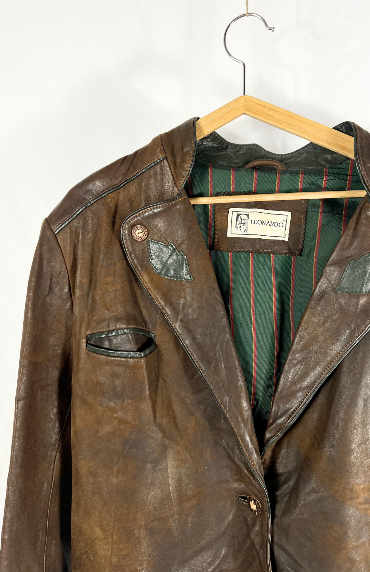 Tmavě hnědá vintage kožená bunda. Uvnitř barevná proužkovaná podšívka. Má pěkné klopy s dubovými listy, pásek vzadu a lehké žíhání. Zapíná se na drobnější myslivecké knoflíky. Kapsy zvenčí i uvnitř. Pánská / oversize unisex.