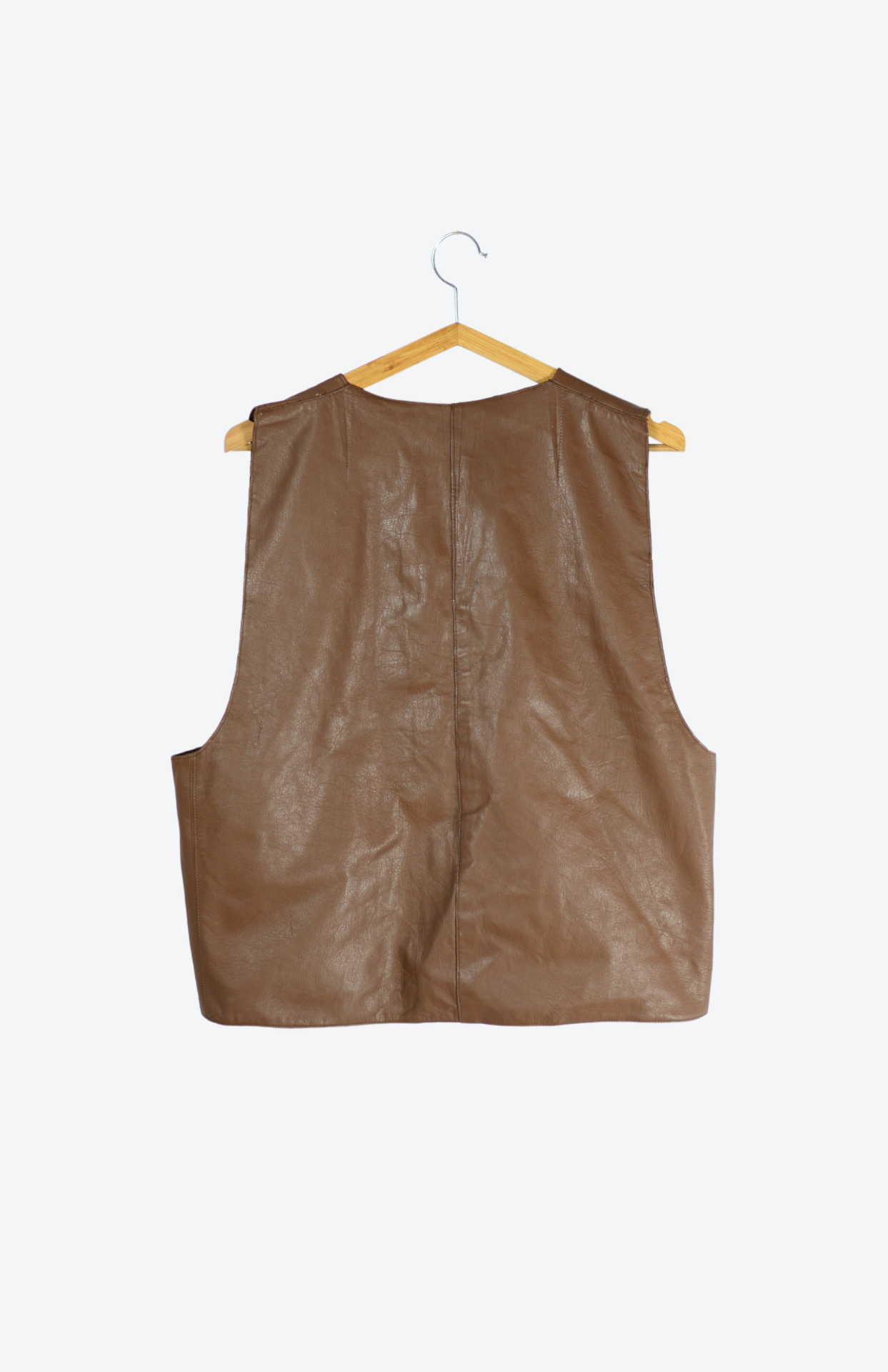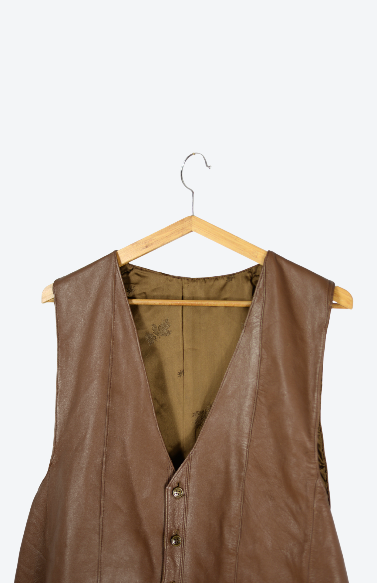 Vintage skořicově hnědá kožená vesta. Má vyšívanou žakárovou podšívku. Originální střih s vykrojením vpředu.