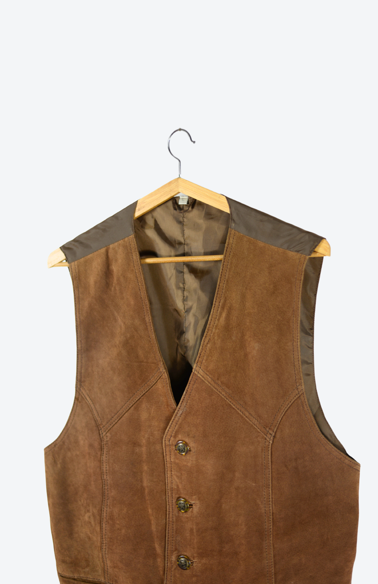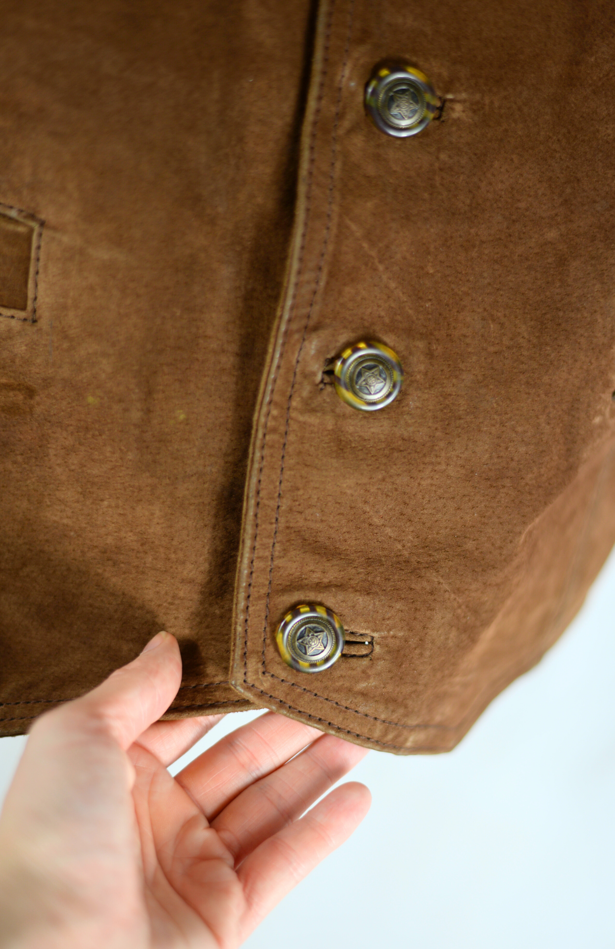 Kožená vintage vesta ze skořicově hnědé broušené kůže. Propínací na zdobené knoflíčky, kapsy vpředu. Má hnědou saténovou podšívku a záda, vzadu s páskem pro utažení v pase. Unisex kousek.